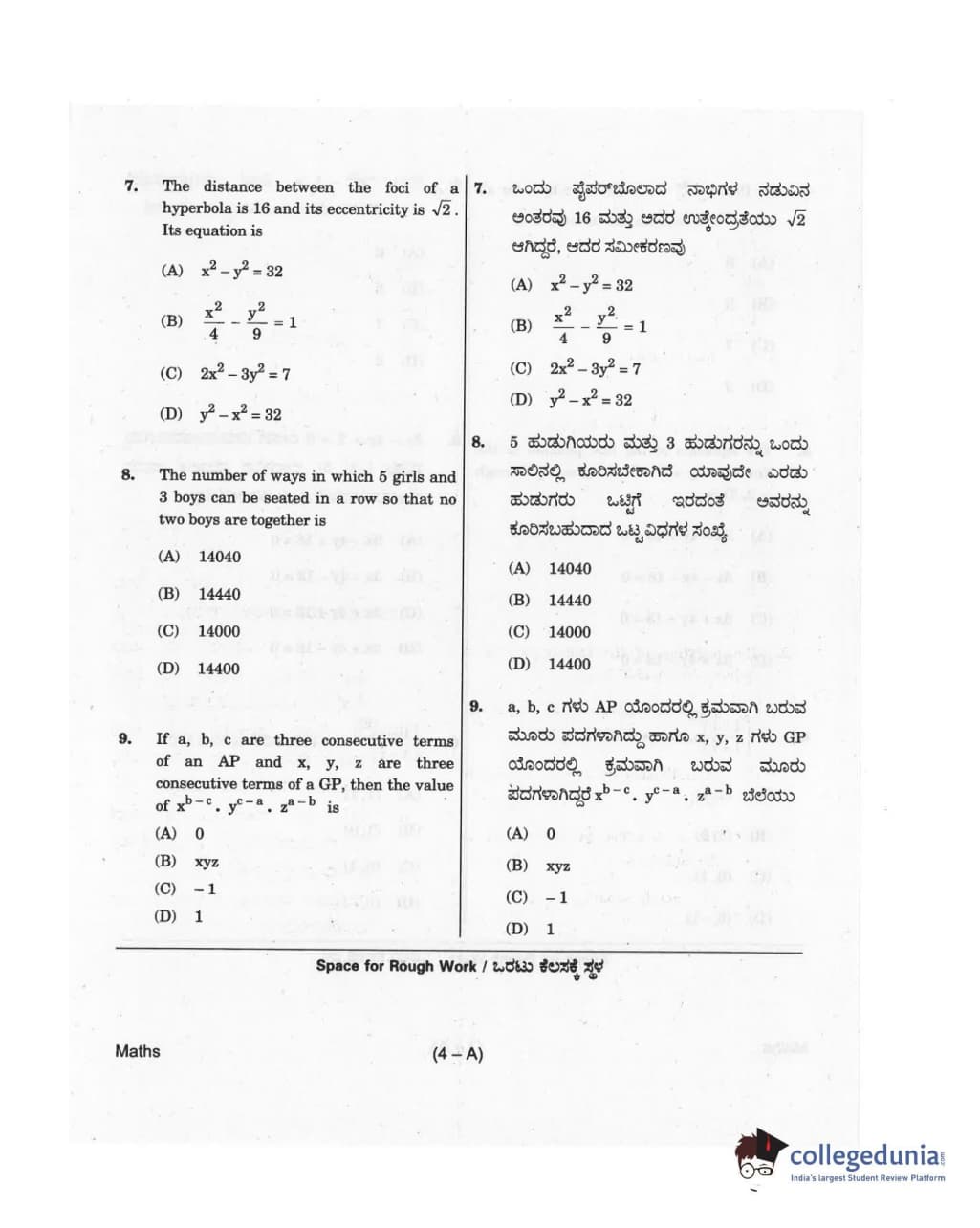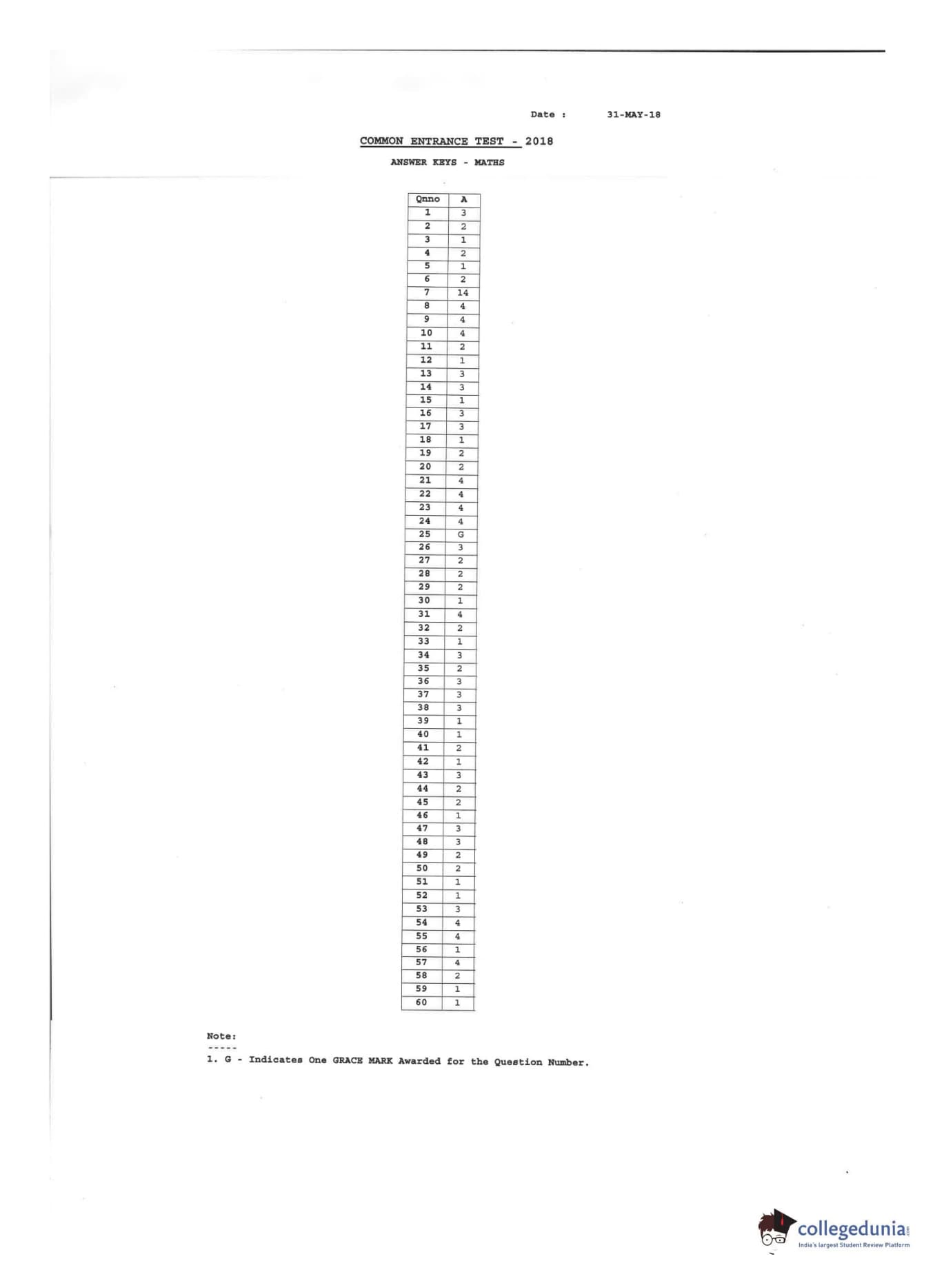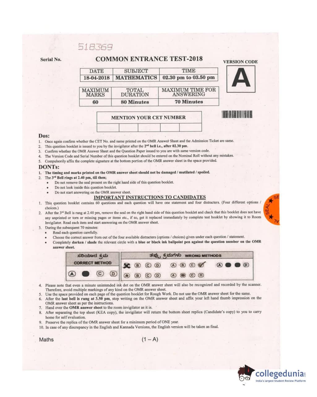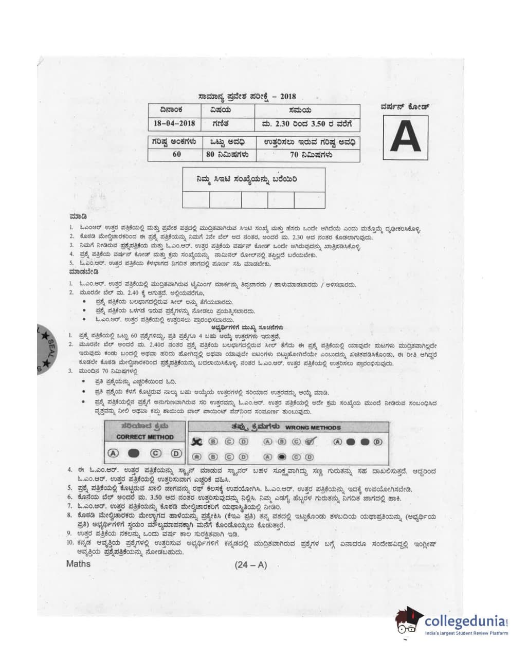 KCET 2018 Mathematics Question paper with answer key pdf conducted on April 18, 2018 in Afternoon Session 2:30 PM to 3:50 PM for A is available for download. The exam was successfully organized by Karnataka Examinations Authority (KEA). In terms of difficulty level, KCET was of Moderate level. The question paper comprised a total of 60 questions.