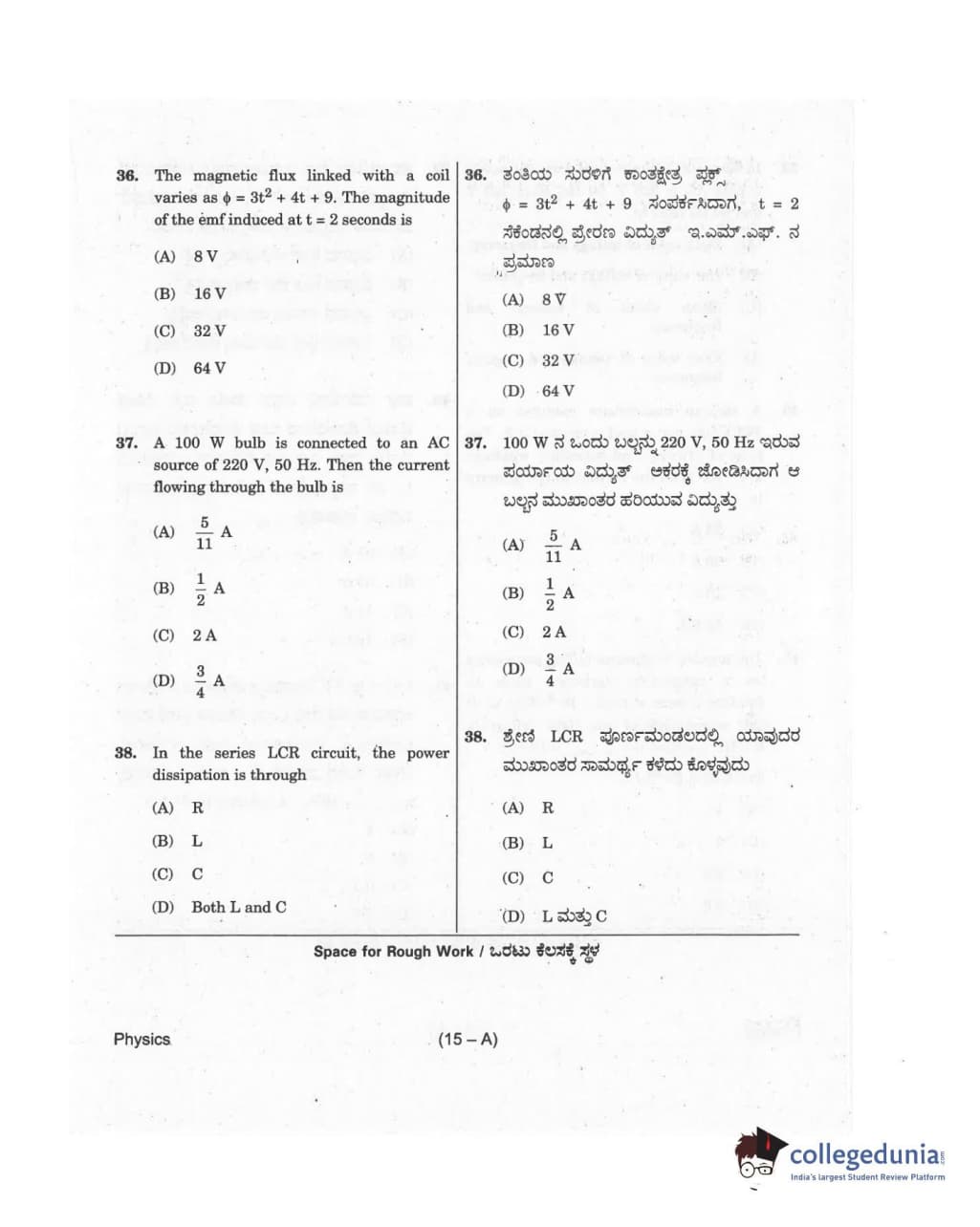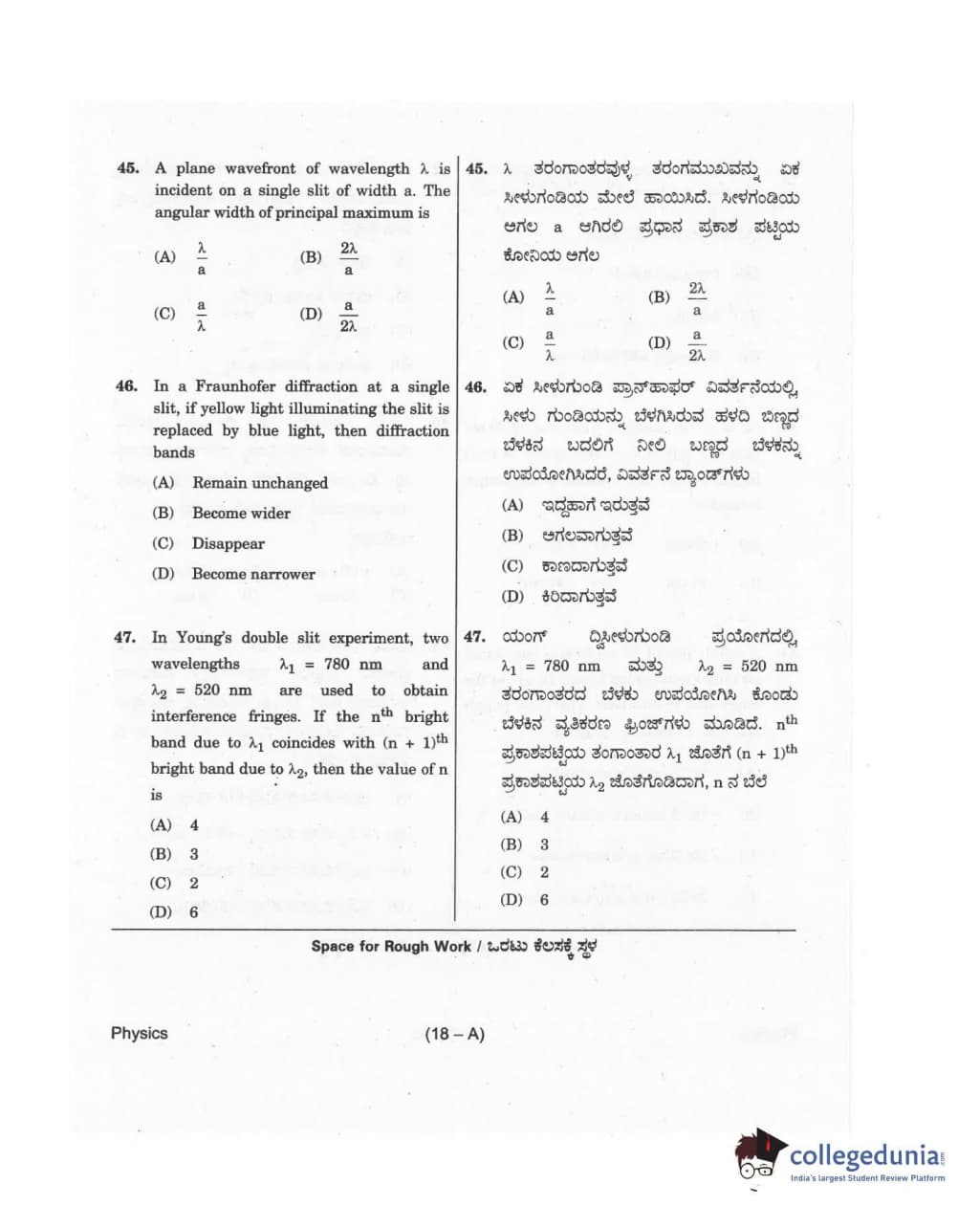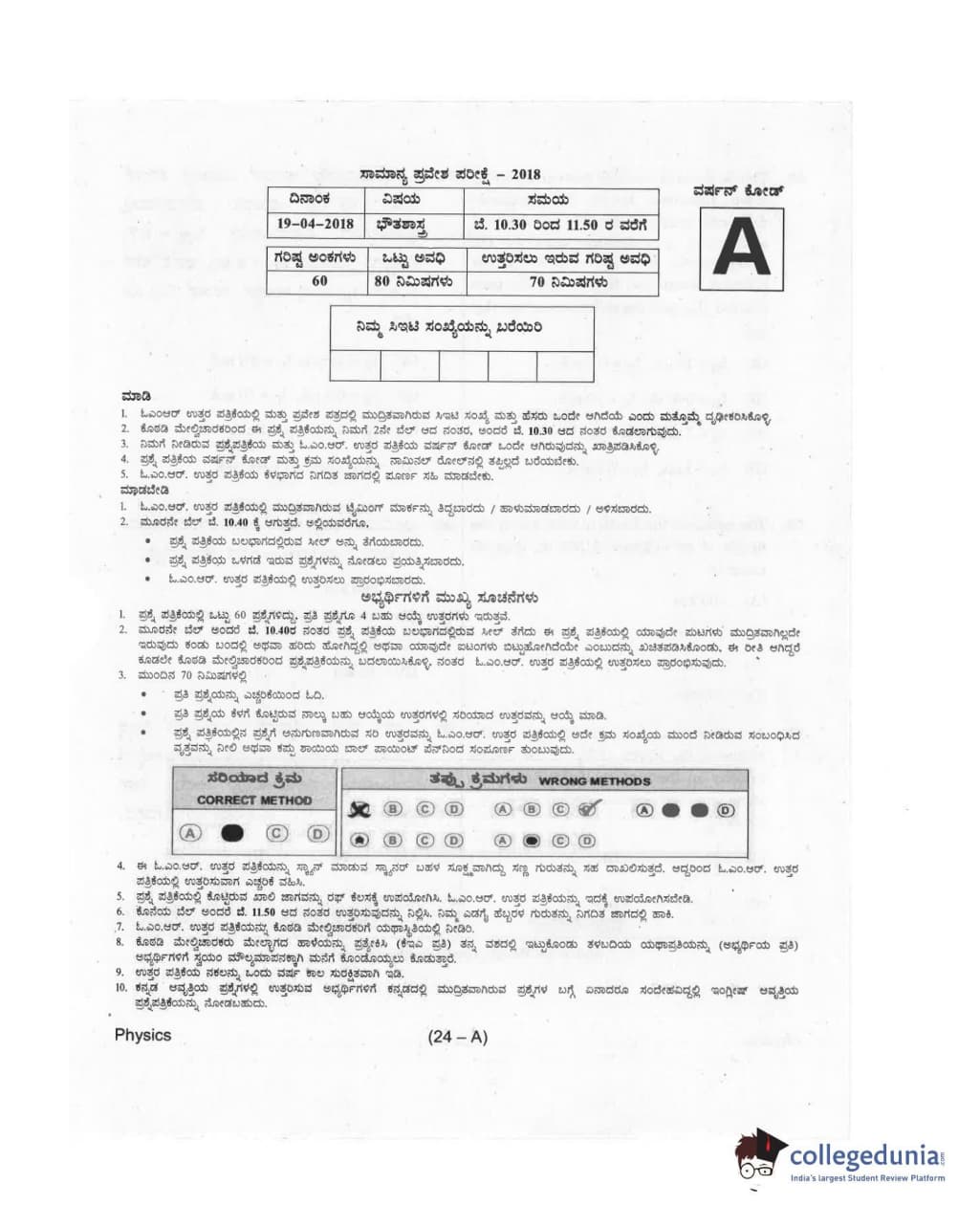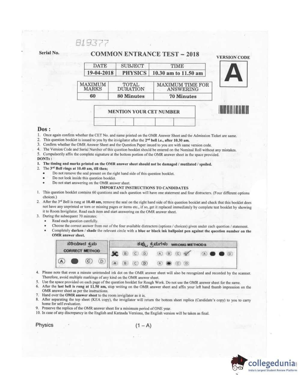 KCET 2018 Physics Question paper with answer key pdf conducted on April 19, 2018 in Morning Session 10:30 AM to 11:50 AM for A is available for download. The exam was successfully organized by Karnataka Examinations Authority (KEA). In terms of difficulty level, KCET was of Easy level. The question paper comprised a total of 60 questions.