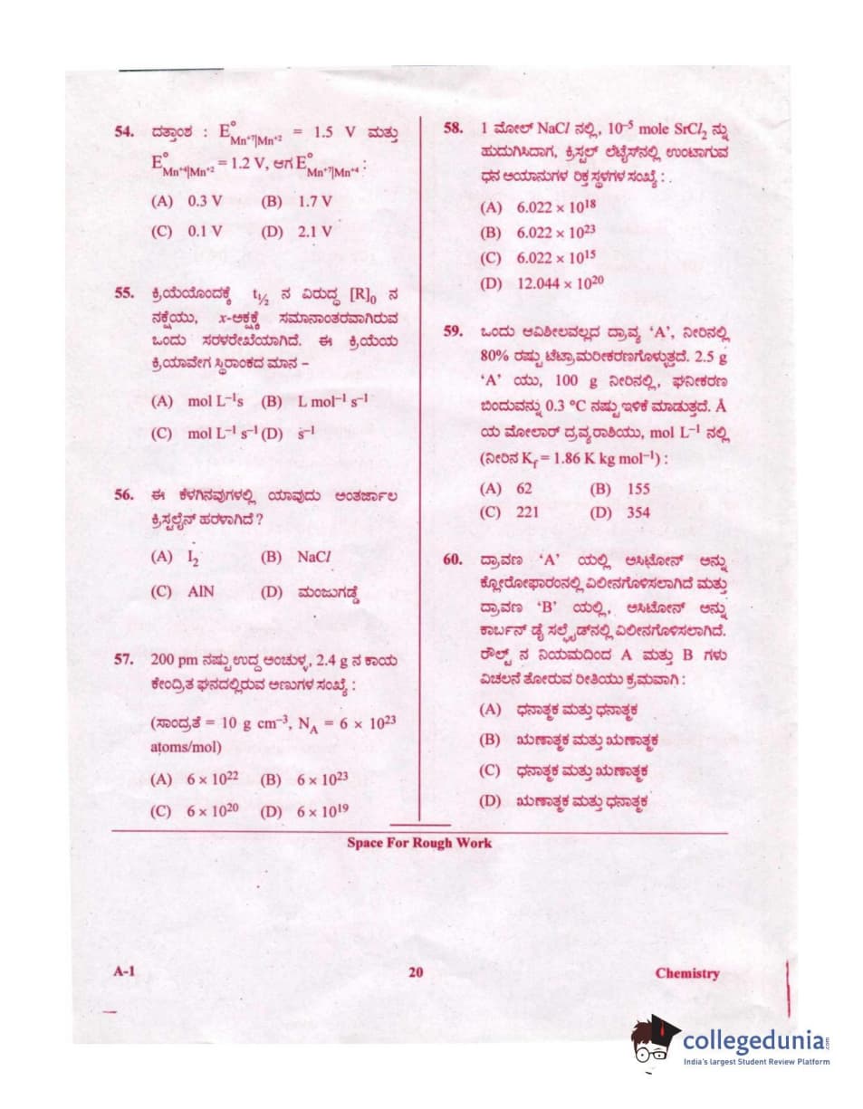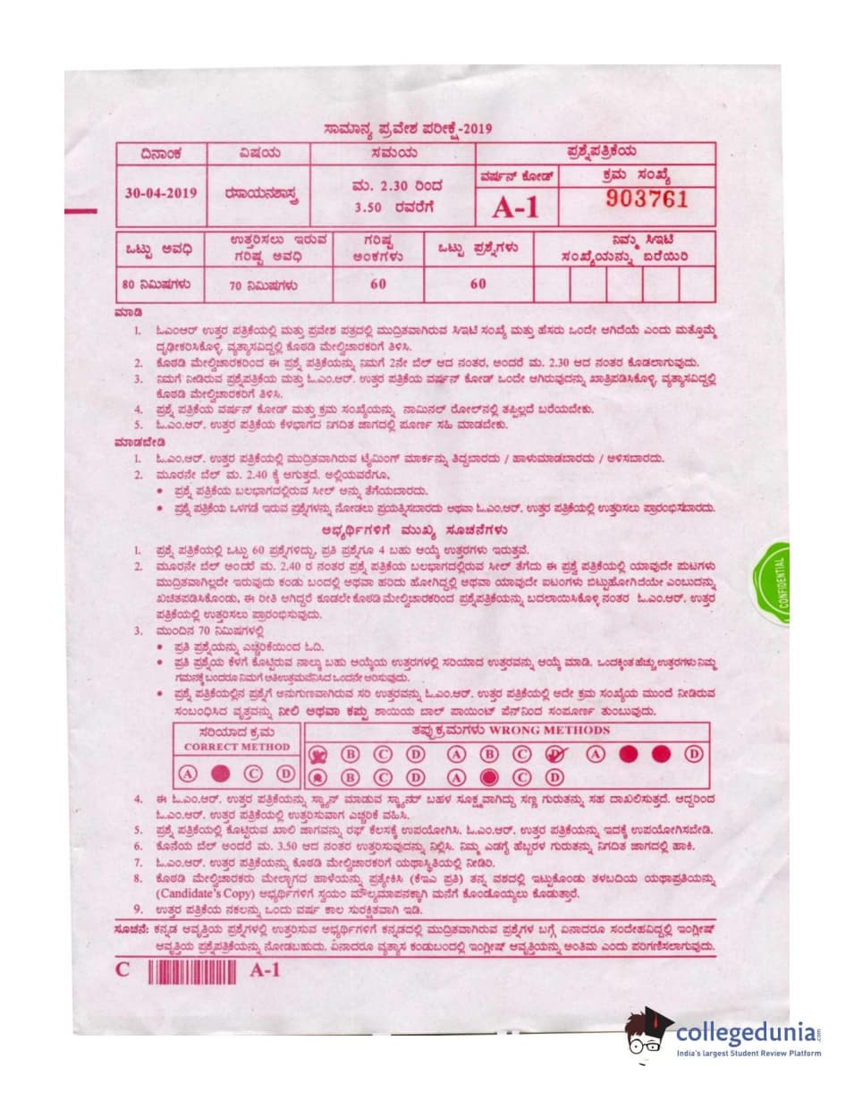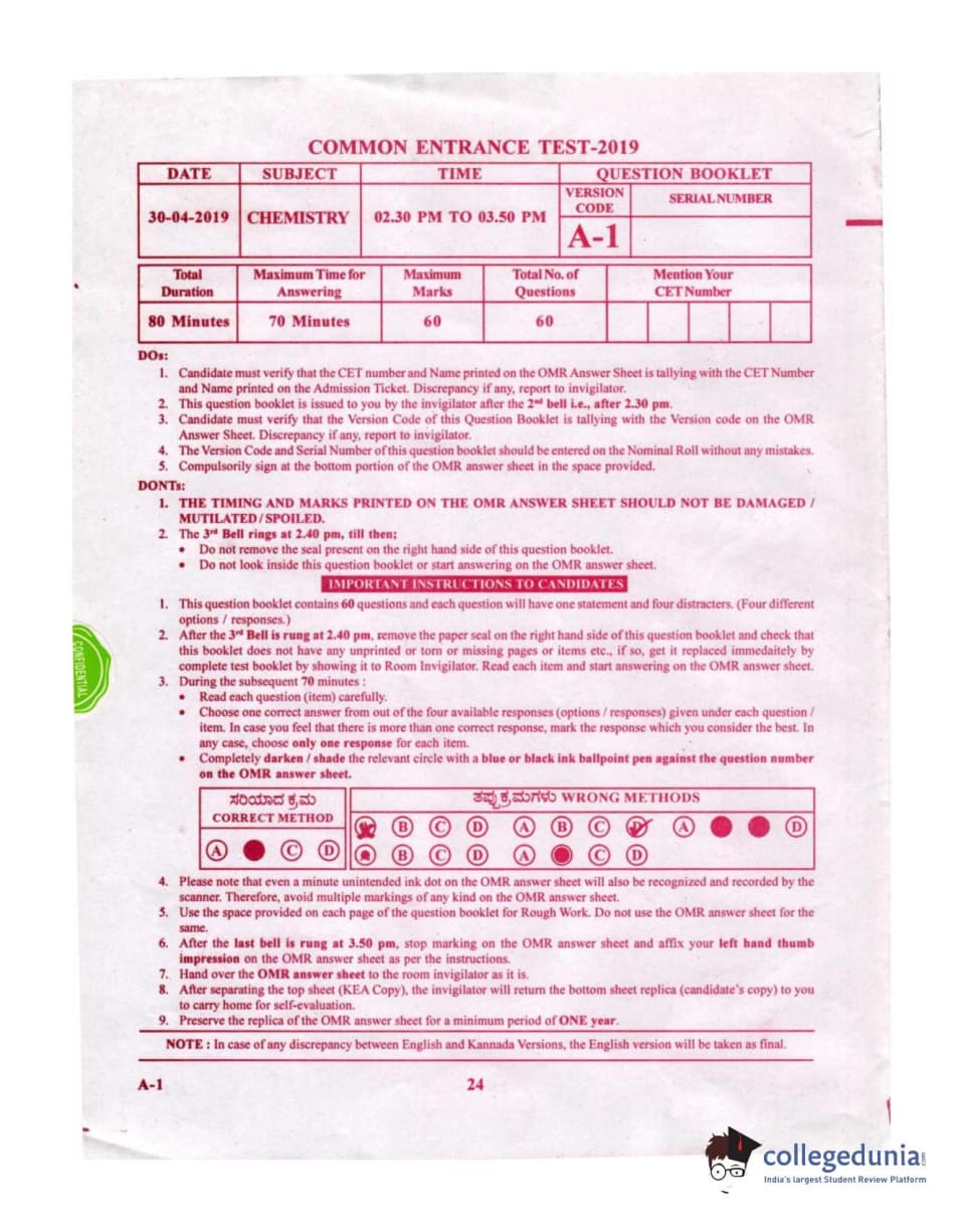 KCET 2019 Chemistry Question paper with answer key pdf conducted on April 30, 2019 in Afternoon Session 2:30 PM to 3:50 PM for A-1 is available for download. The exam was successfully organized by Karnataka Examinations Authority (KEA). In terms of difficulty level, KCET was of Moderate level. The question paper comprised a total of 60 questions.