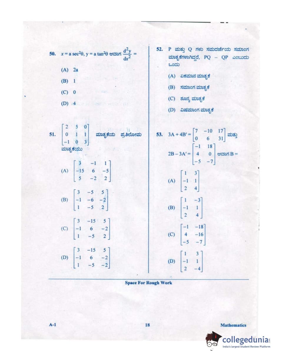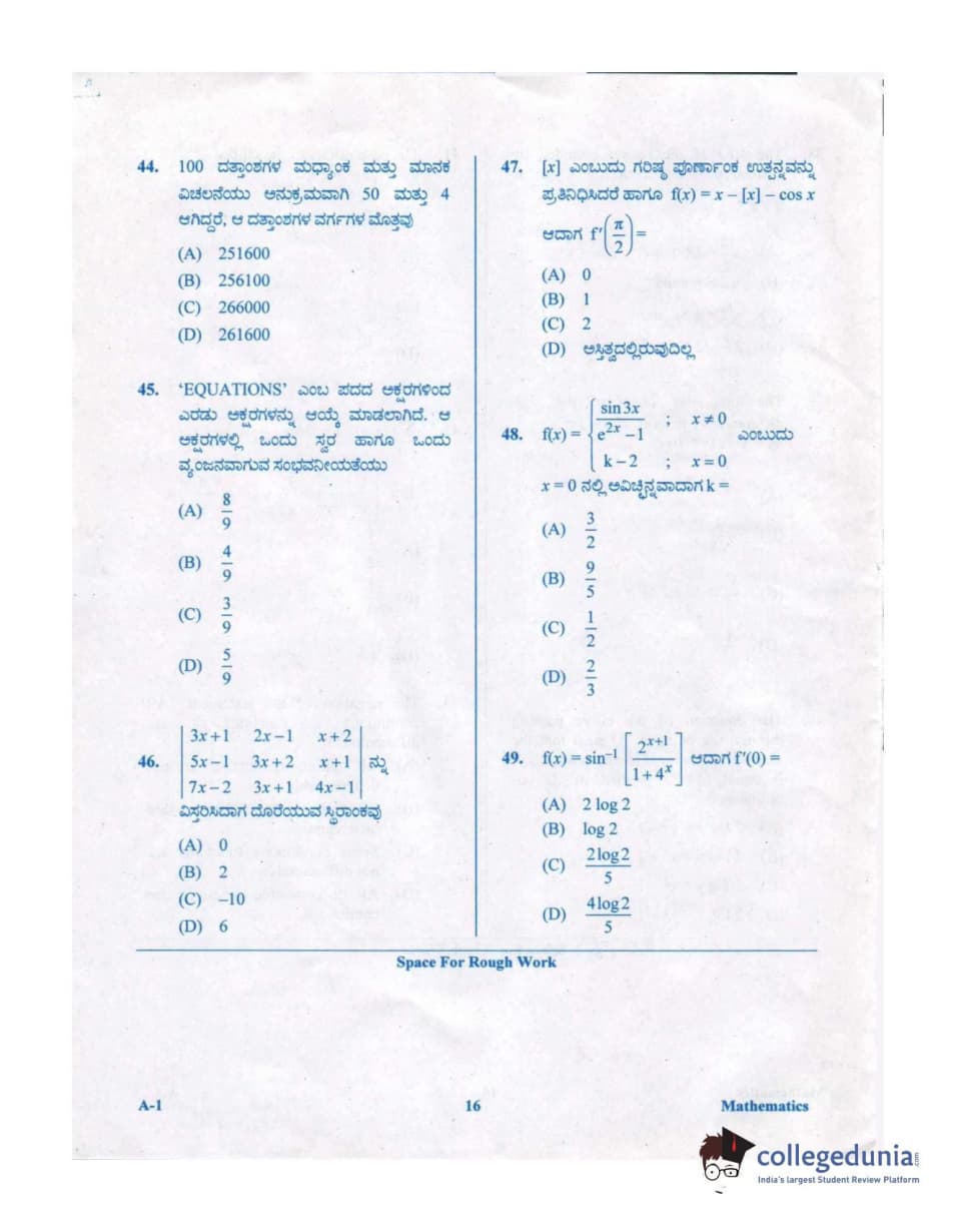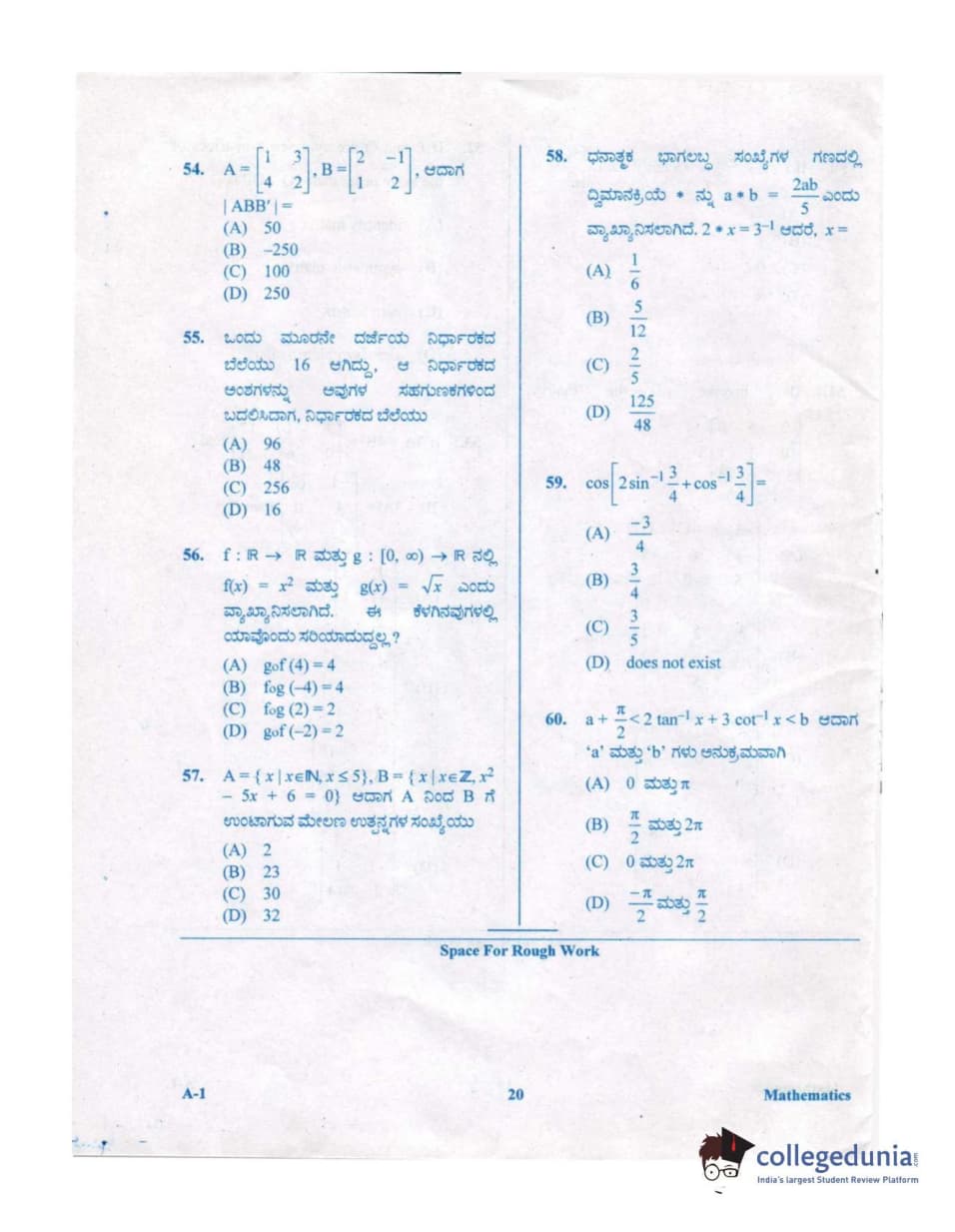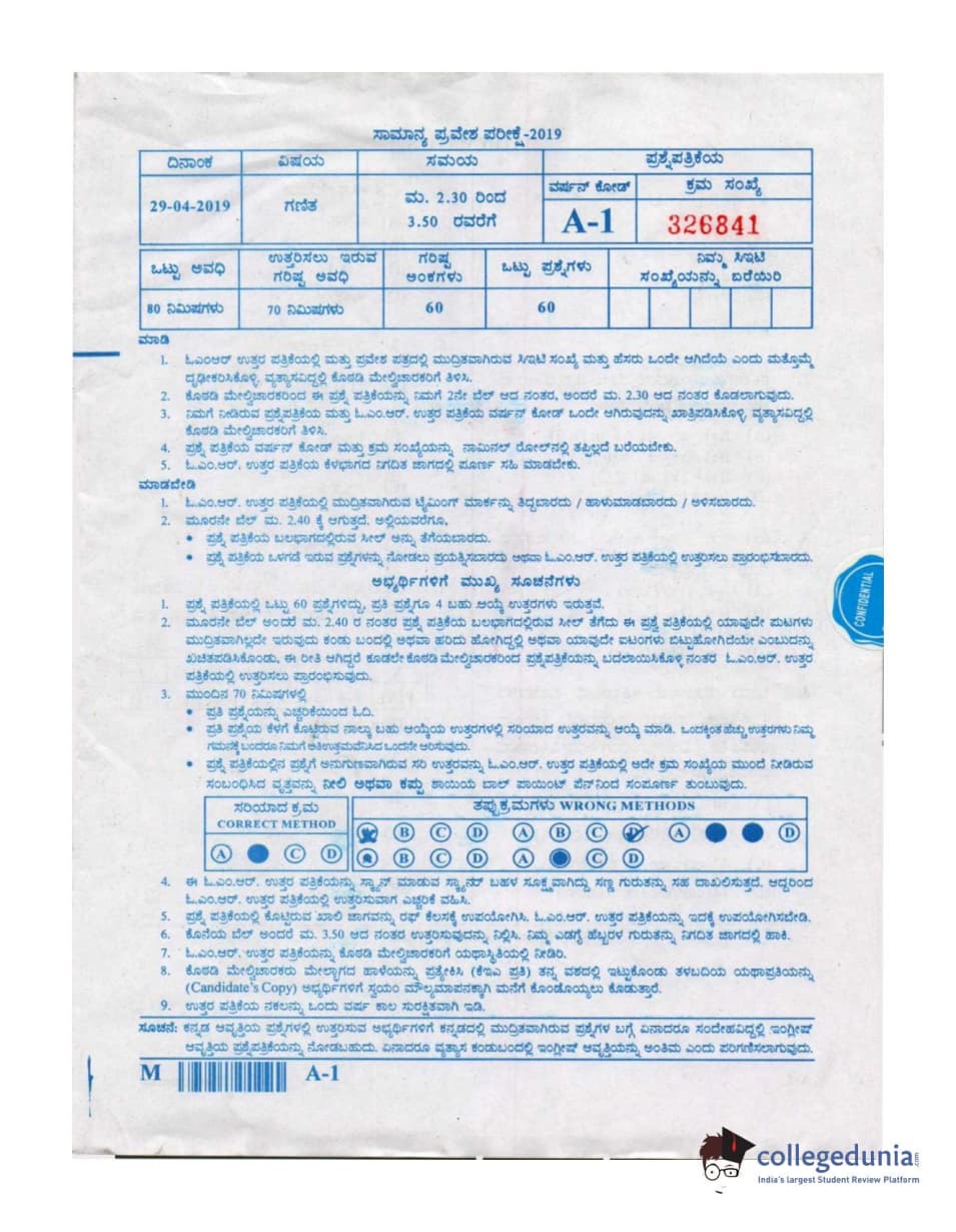 KCET 2019 Mathematics Question paper with answer key pdf conducted on April 29, 2019 in Afternoon Session 2:30 PM to 3:50 PM for A-1 is available for download. The exam was successfully organized by Karnataka Examinations Authority (KEA). In terms of difficulty level, KCET was of Moderate level. The question paper comprised a total of 60 questions.