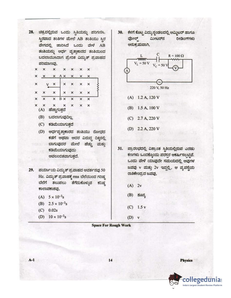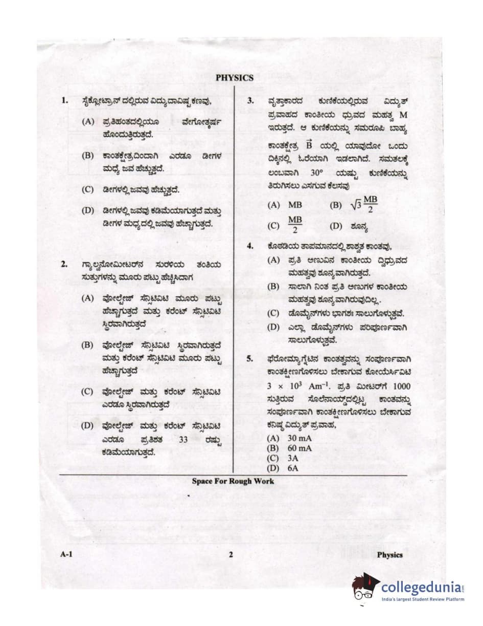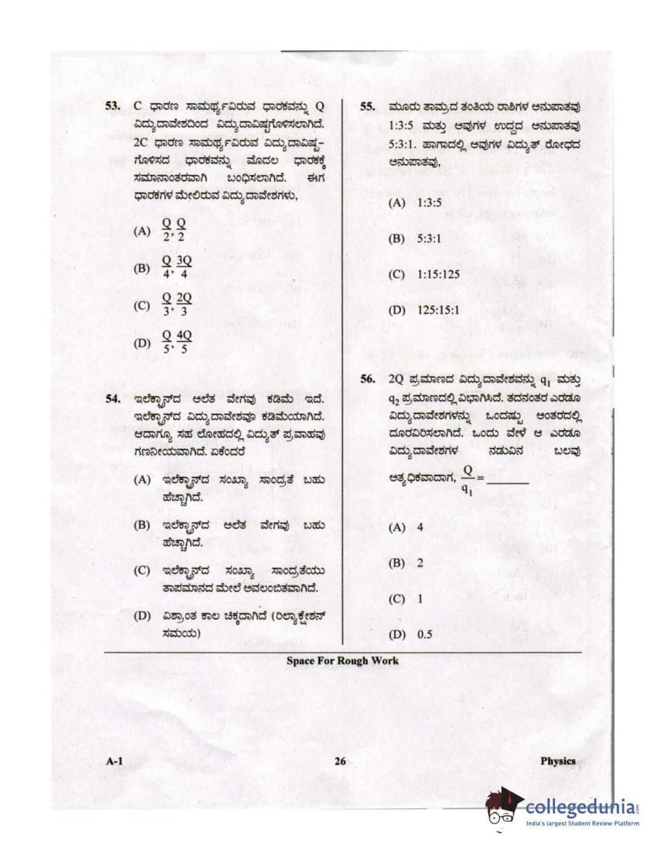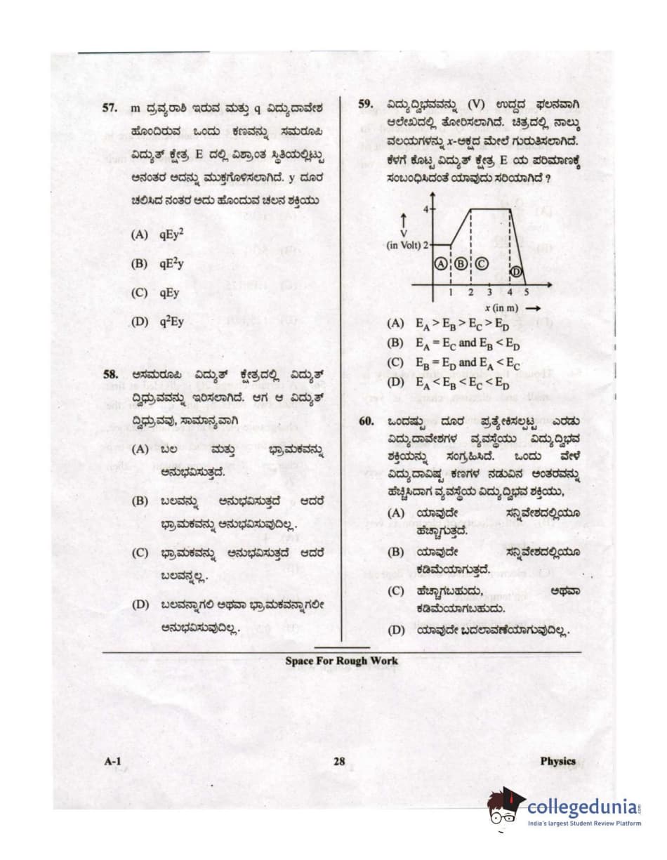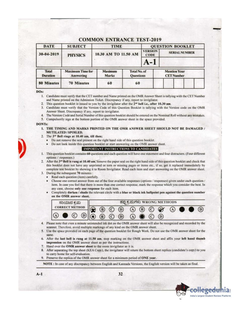 KCET 2019 Physics Question paper with answer key pdf conducted on April 30, 2019 in Morning Session 10:30 AM to 11:50 AM for A-1 is available for download. The exam was successfully organized by Karnataka Examinations Authority (KEA). In terms of difficulty level, KCET was of Moderate level. The question paper comprised a total of 60 questions.