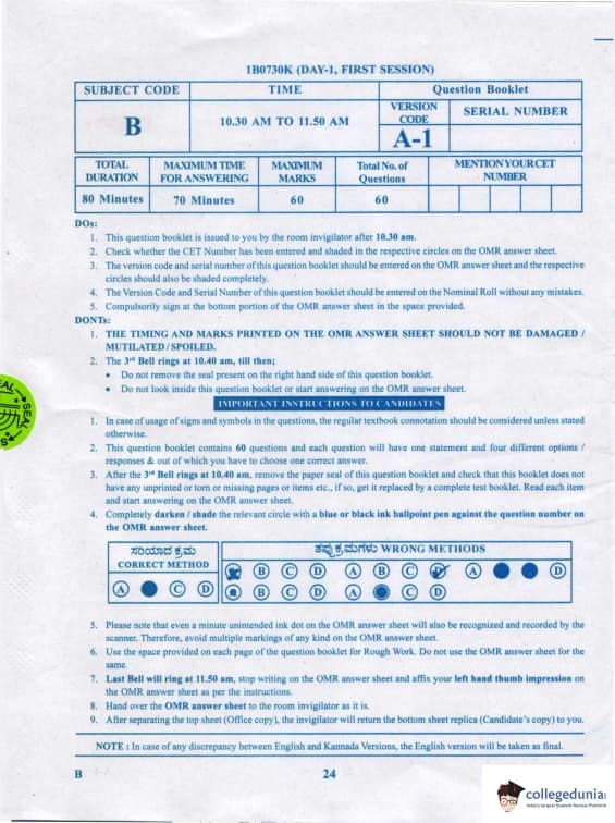 KCET 2020 Biology Question paper with answer key pdf conducted on July 30, 2020 in Morning Session 10:30 AM to 11:50 AM is available for download. The exam was successfully organized by Karnataka Examinations Authority (KEA). In terms of difficulty level, KCET was of Easy level. The question paper comprised a total of 60 questions.