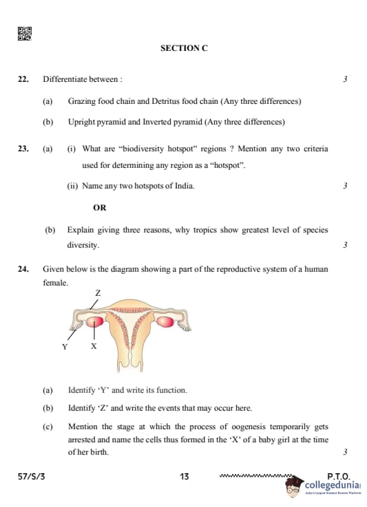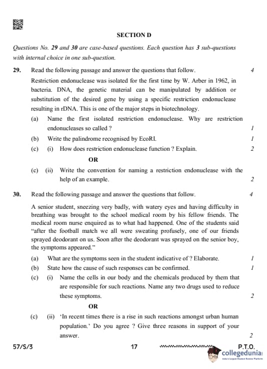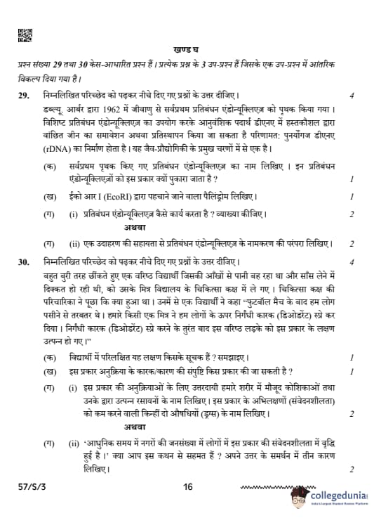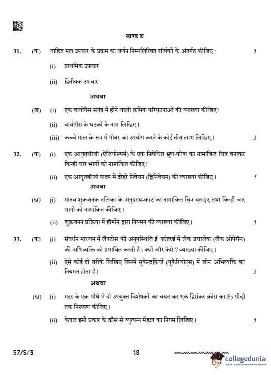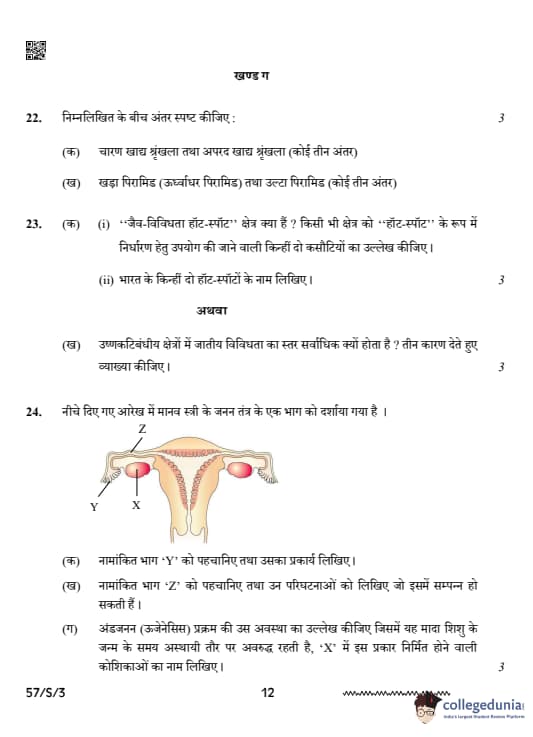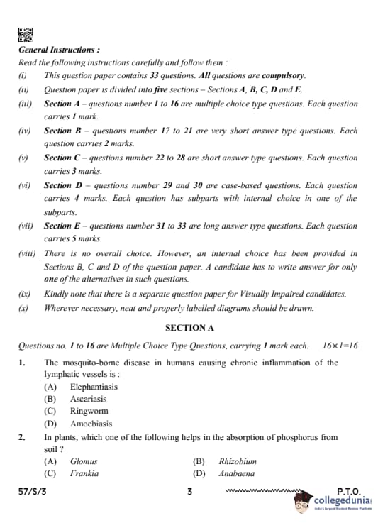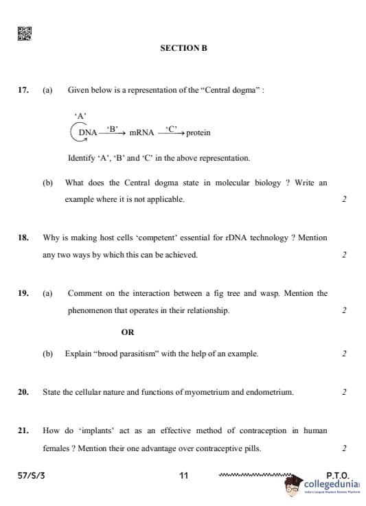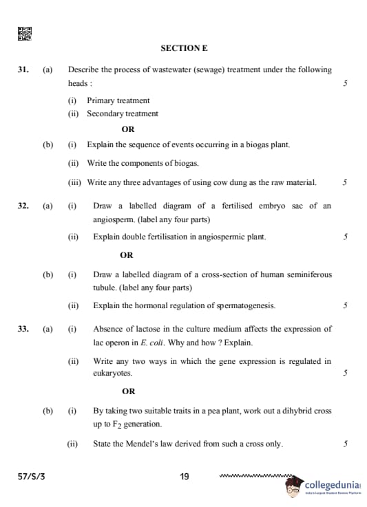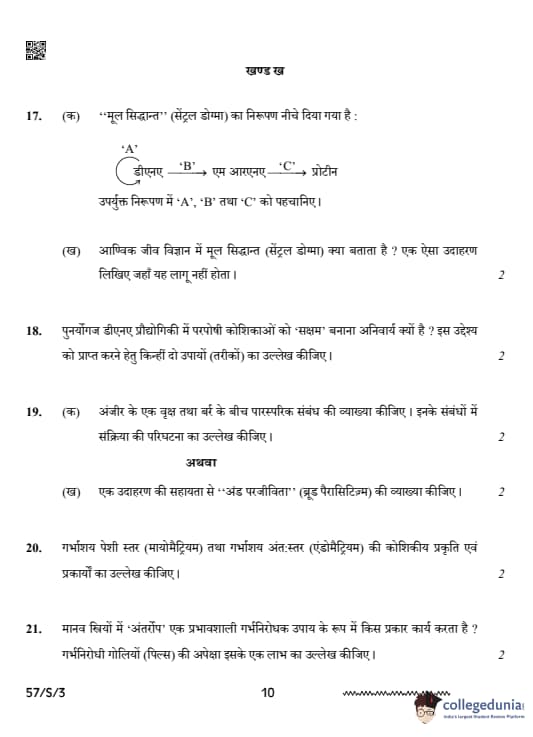 CBSE Class 12 Biology (Set 3 - 57/S/3) Compartment Question Paper 2024 with Answer Key