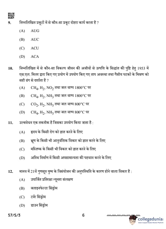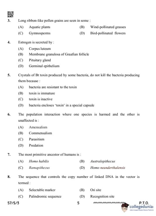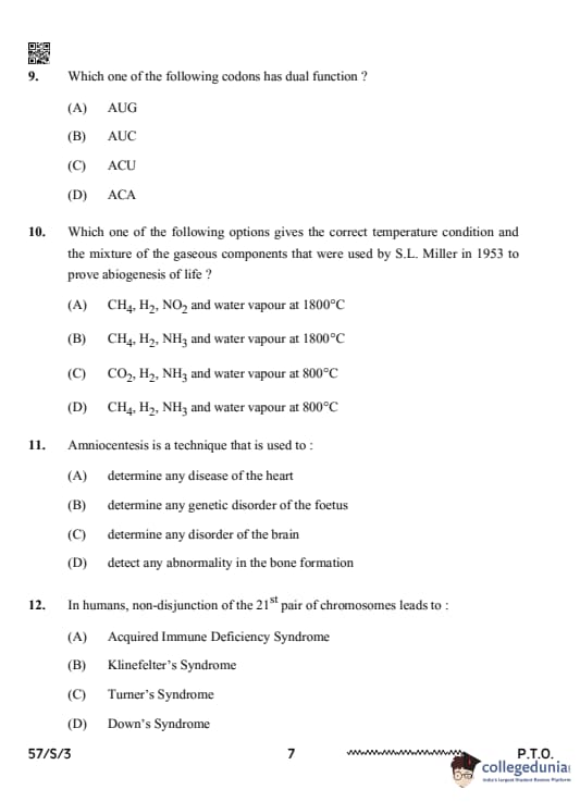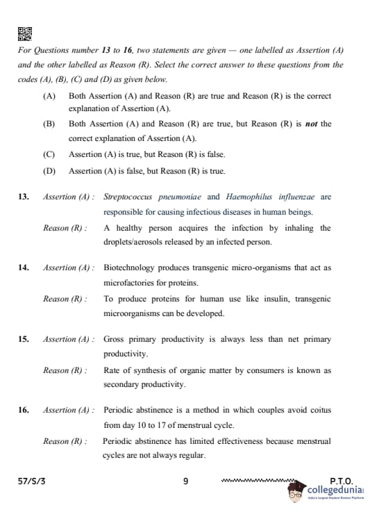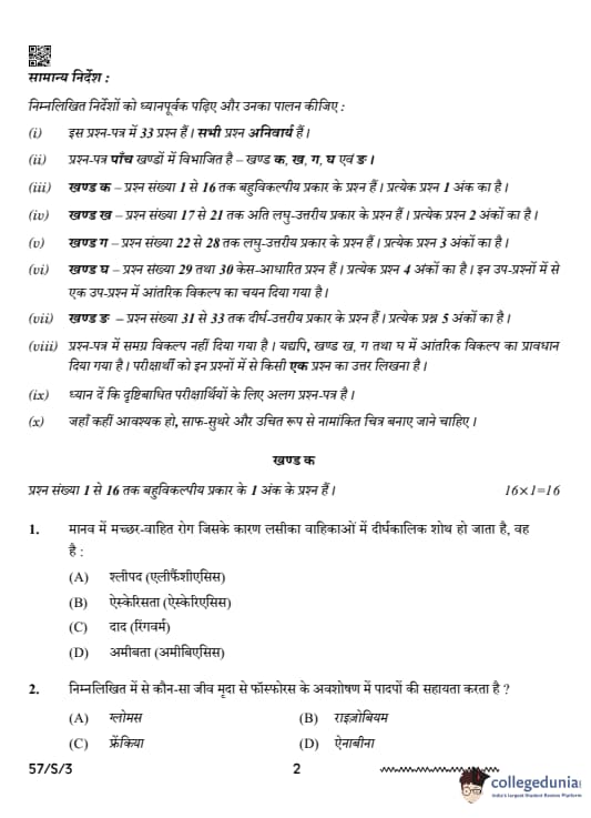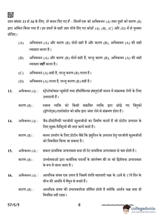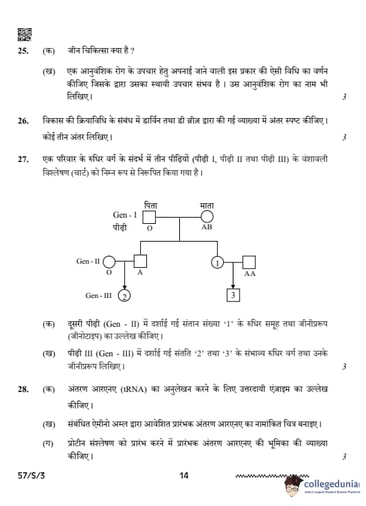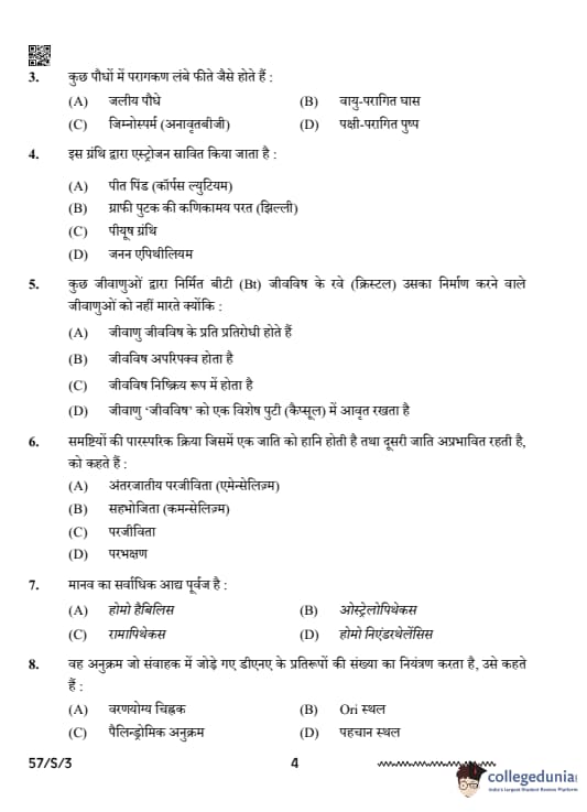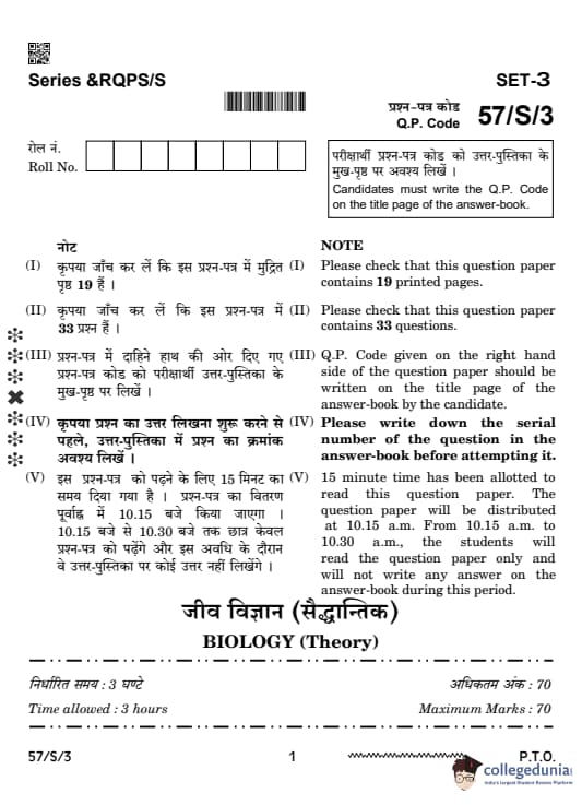 CBSE Class 12 Biology (Set 3 - 57/S/3) Compartment Question Paper 2024 with Answer Key