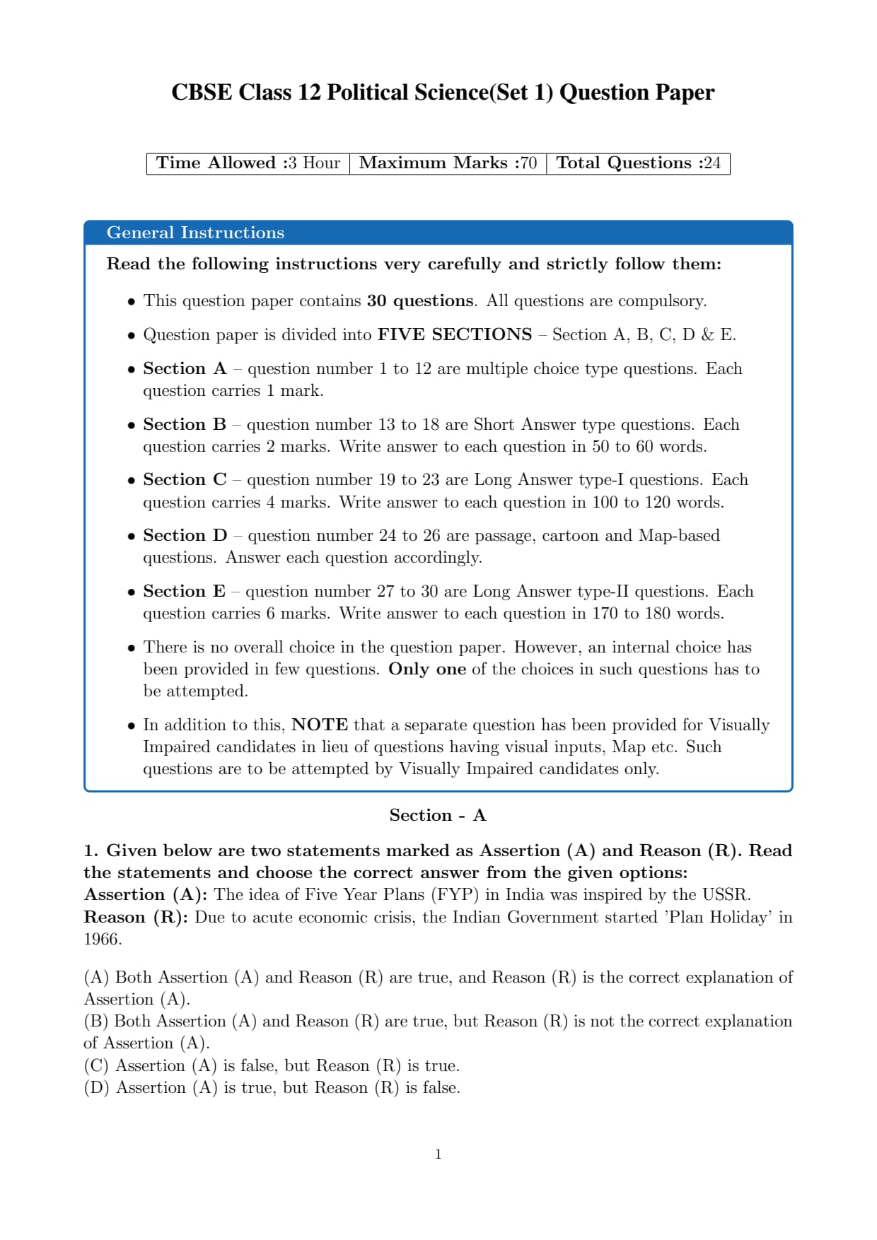 The CBSE Class 12 Political Science Set 1 paper covers key topics from Indian Politics, Comparative Politics, and Political Theory and considered moderately difficult. The exam is marked out of 100, with 80 marks for the theory paper and 20 for internal assessment.