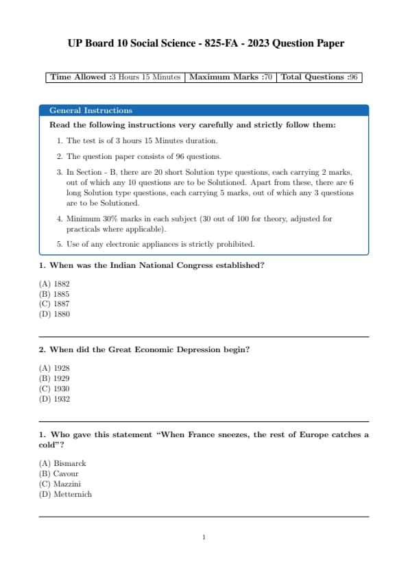 | UP Board Class 10 Social Science (825 FA) Question Paper with Solutions PDF | Check Solutions |