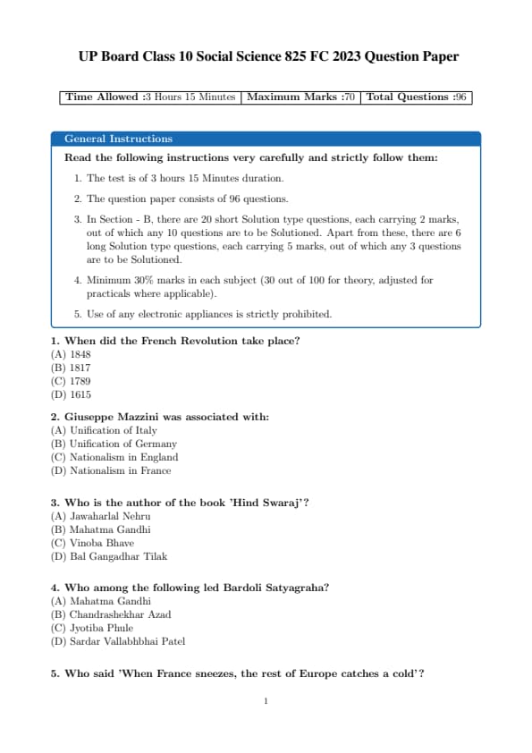 | UP Board Class 10 Social Science (825 FC) Question Paper with Solutions PDF | Check Solutions |
