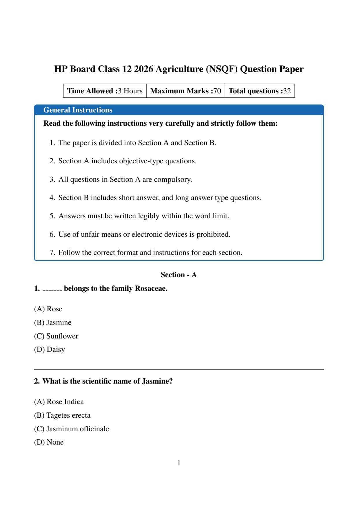 | HP Board Class 12 Agriculture (NSQF) Question Paper 2026 | Download PDF | Check Solution |