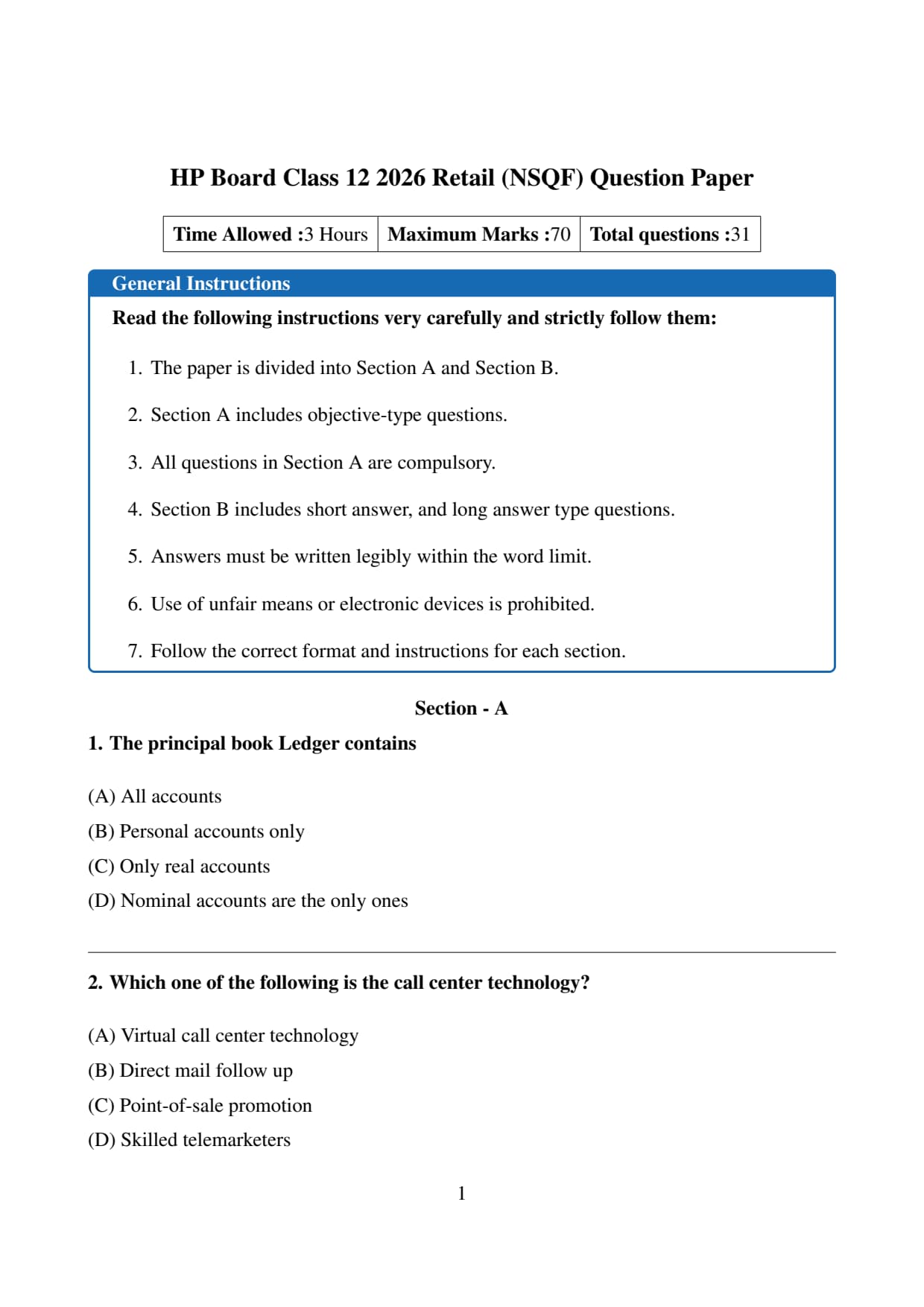 | HP Board Class 12 Retail (NSQF) Question Paper 2026 | Download PDF | Check Solution |