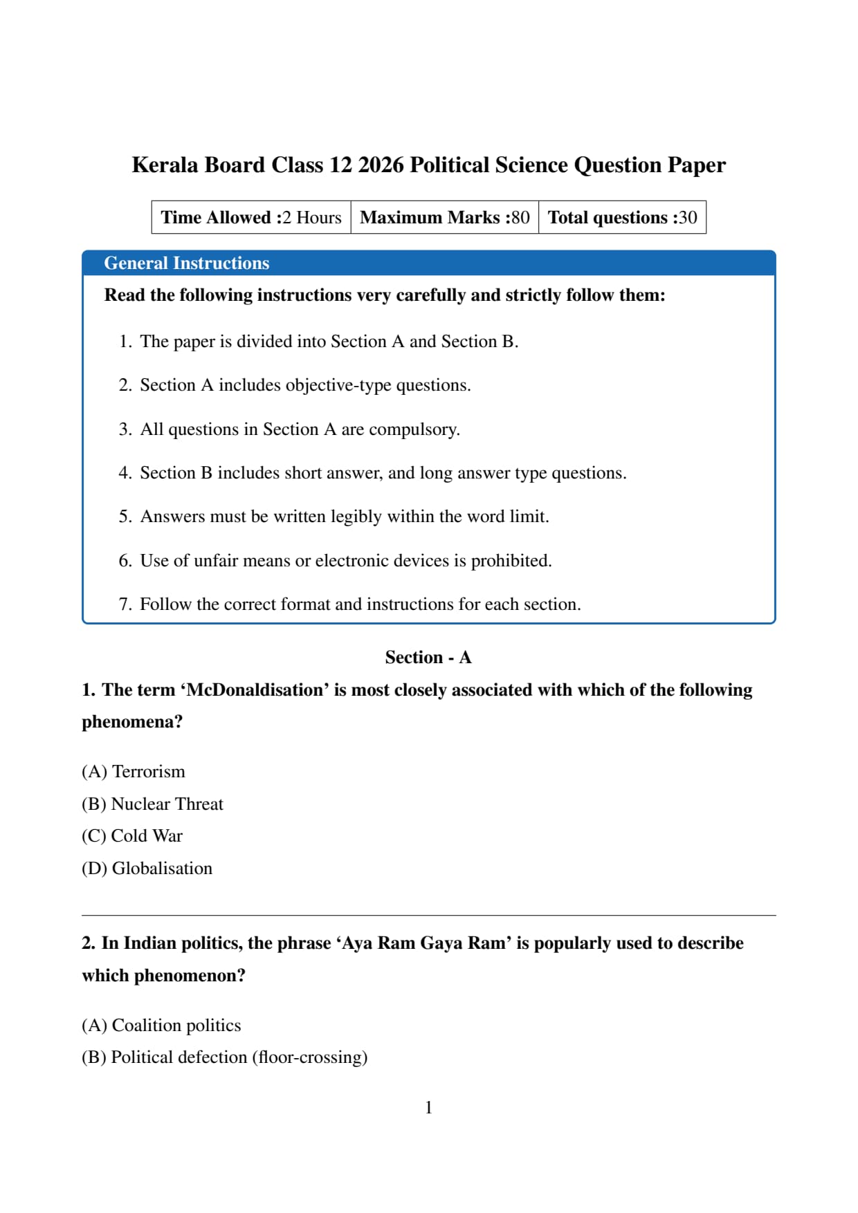 | Kerala Board Class 12 Political Science Question Paper 2026 | Download PDF | Check Solution |