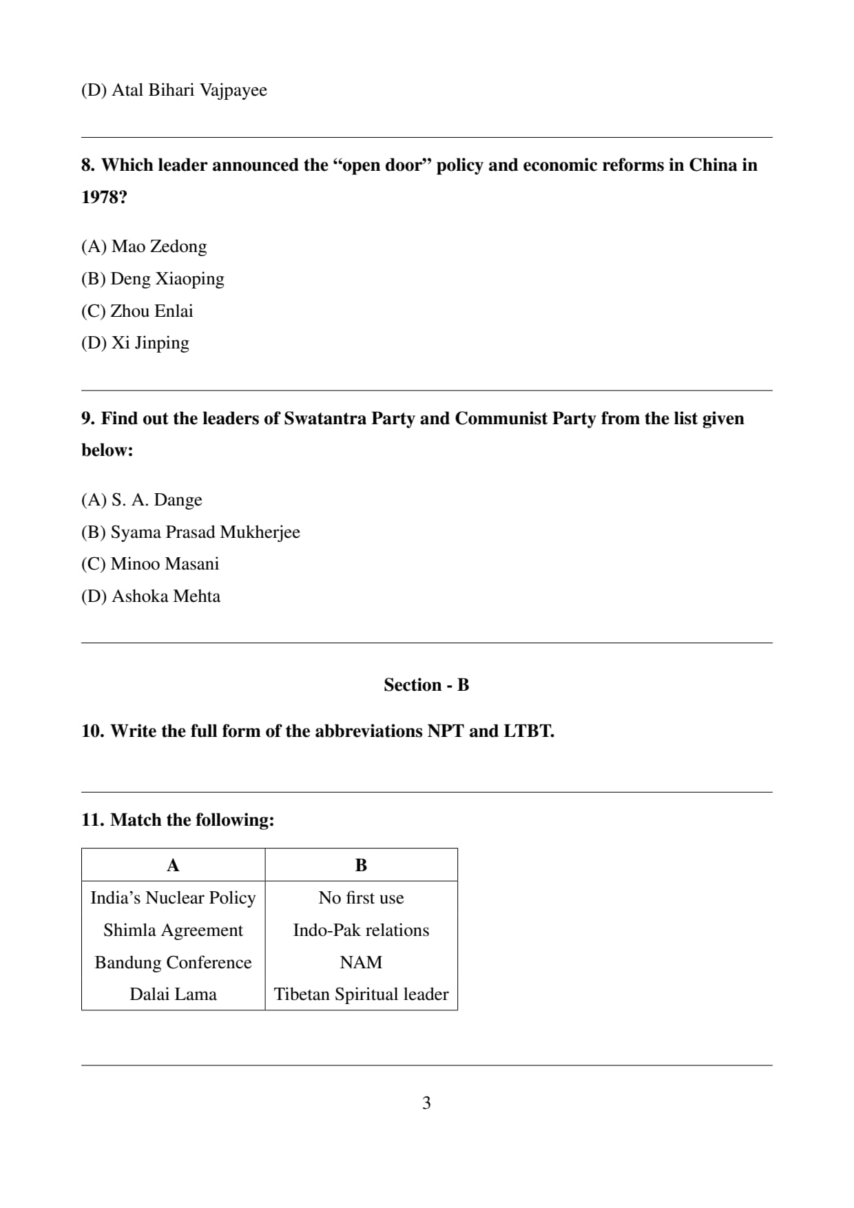 (B): Correct. Deng Xiaoping introduced economic reforms.