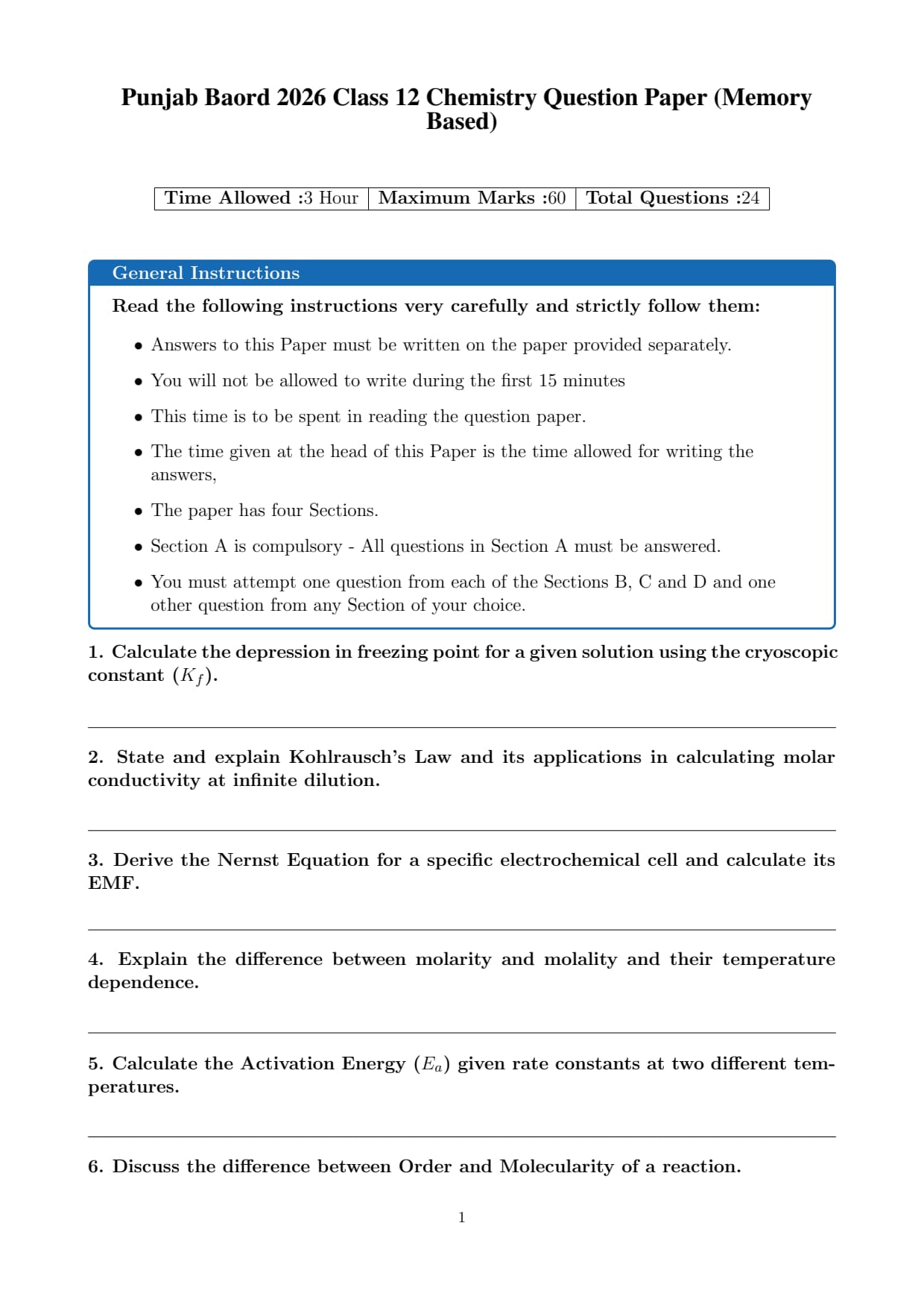 | Punjab Board Class 12 Chemistry Question Paper 2026 | Download PDF | Check Solutions |