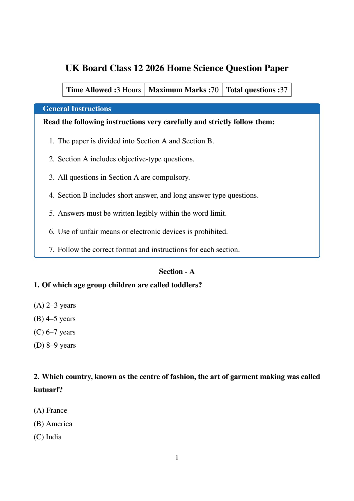 | UK Board Class 12 Home Science Question Paper 2026 | Download PDF | Check Solution |