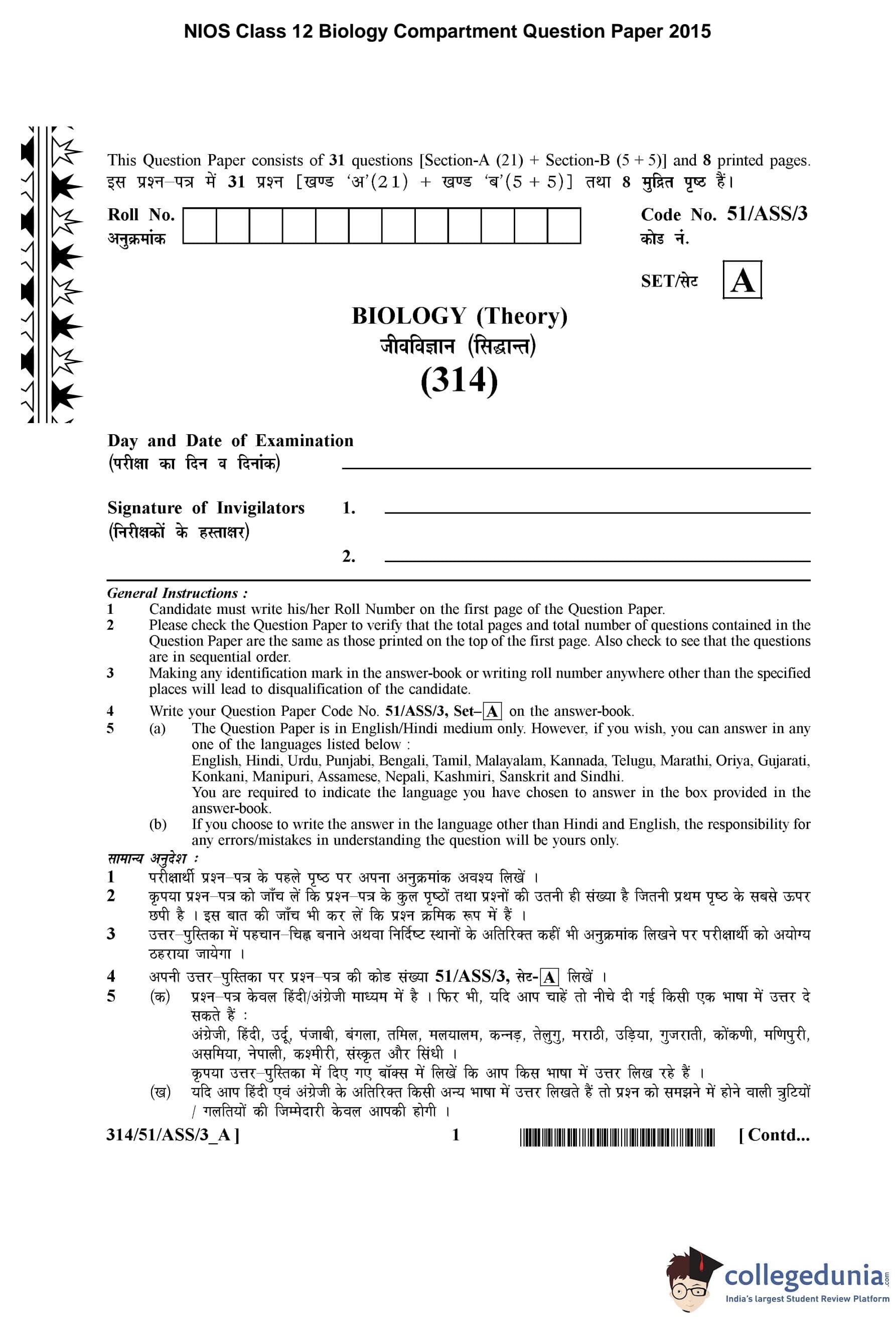NIOS Class 12 Biology Compartment Question Paper 2015 with Answer Key pdf is available for download here. The exam was conducted by National Institute of Open Schooling on October 28, 2015 in the Afternoon Session 2:30 PM to 5:30 PM. The question paper comprised a total of 26 questions divided among 2 sections.