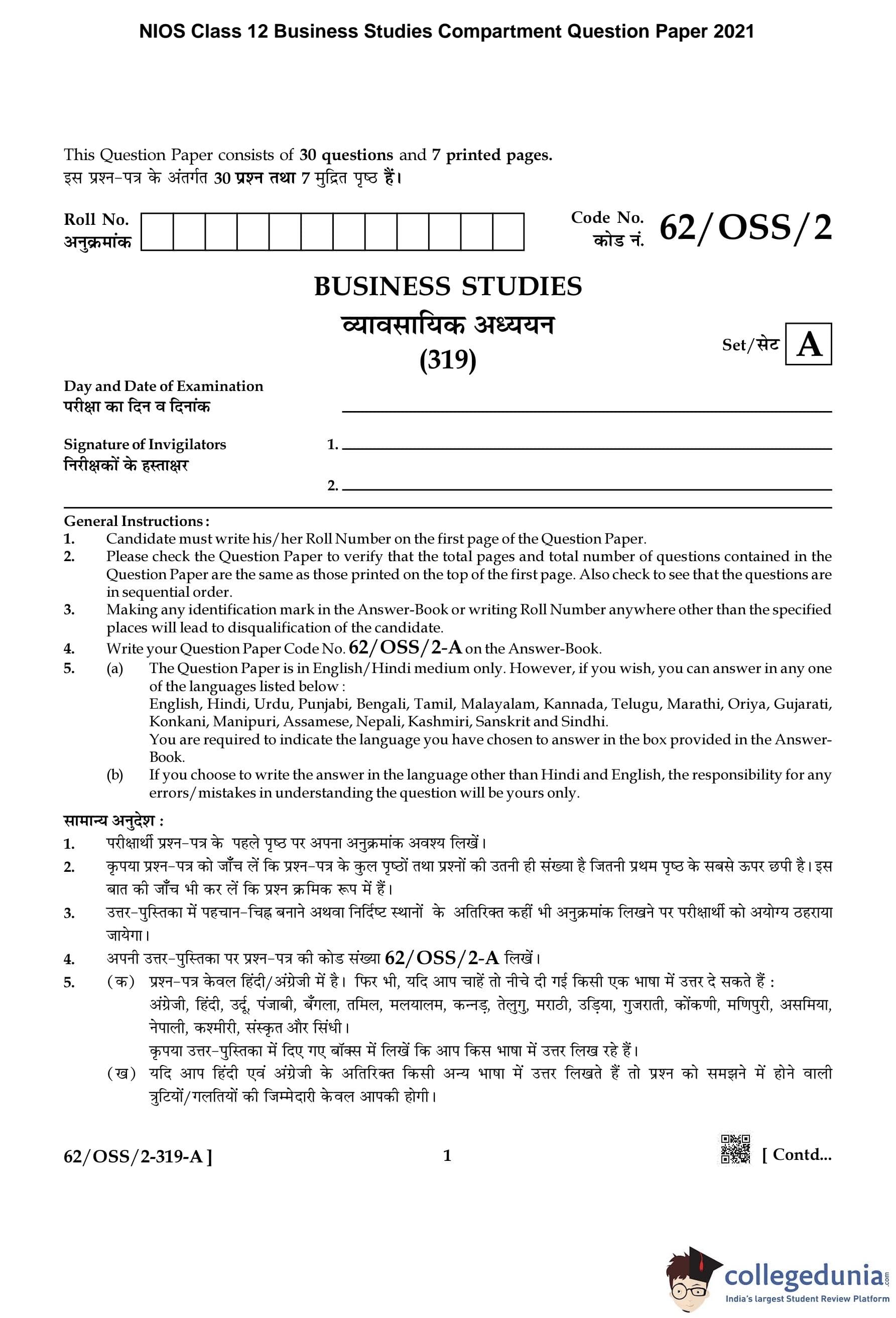 NIOS Class 12 Business Studies Compartment Question Paper 2021 with Answer Key pdf is available for download here. The exam was conducted by National Institute of Open Schooling on December 15, 2021 in the Afternoon Session 2:30 PM to 5:30 PM. The question paper comprised a total of 30 questions.