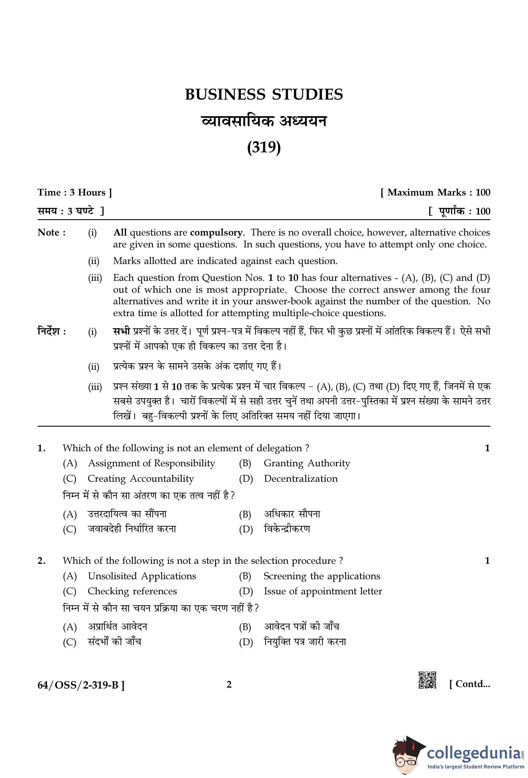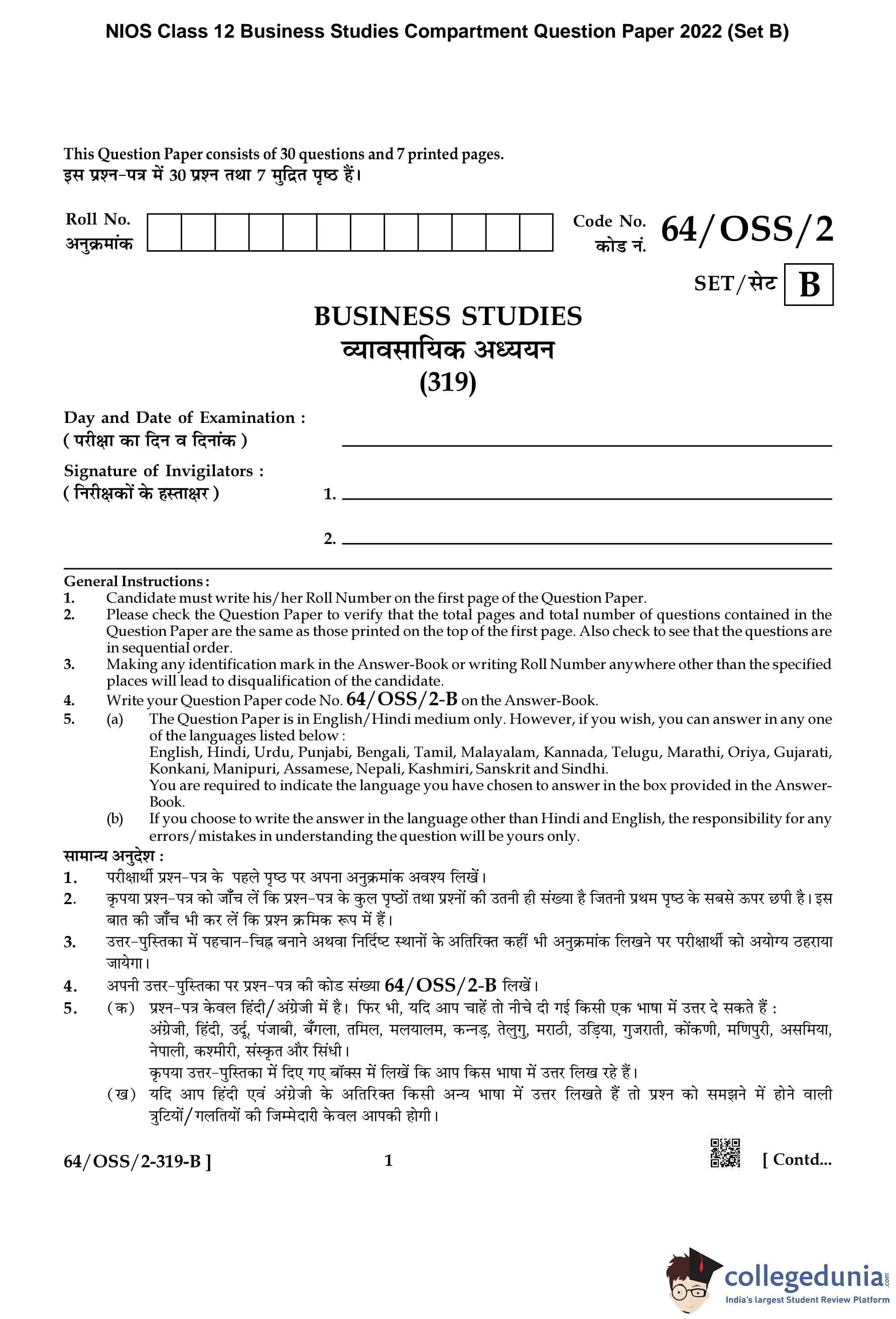 NIOS Class 12 Business Studies Compartment Question Paper 2022 with Answer Key pdf (Set B) is available for download here. The exam was conducted by National Institute of Open Schooling on November 18, 2022 in the Afternoon Session 2:30 PM to 5:30 PM. The question paper comprised a total of 30 questions.