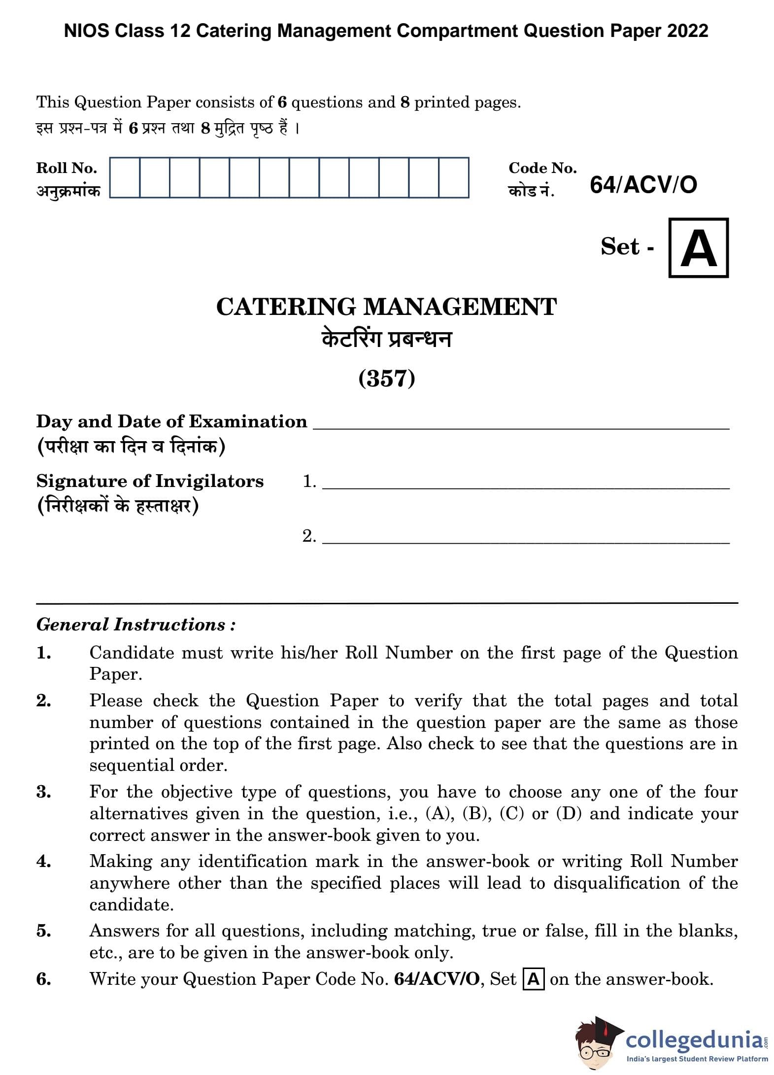 | NIOS Class 12 Catering Management Question Paper 2022 PDF | NIOS Class 12 Catering Management Answer Key 2022 PDF |
