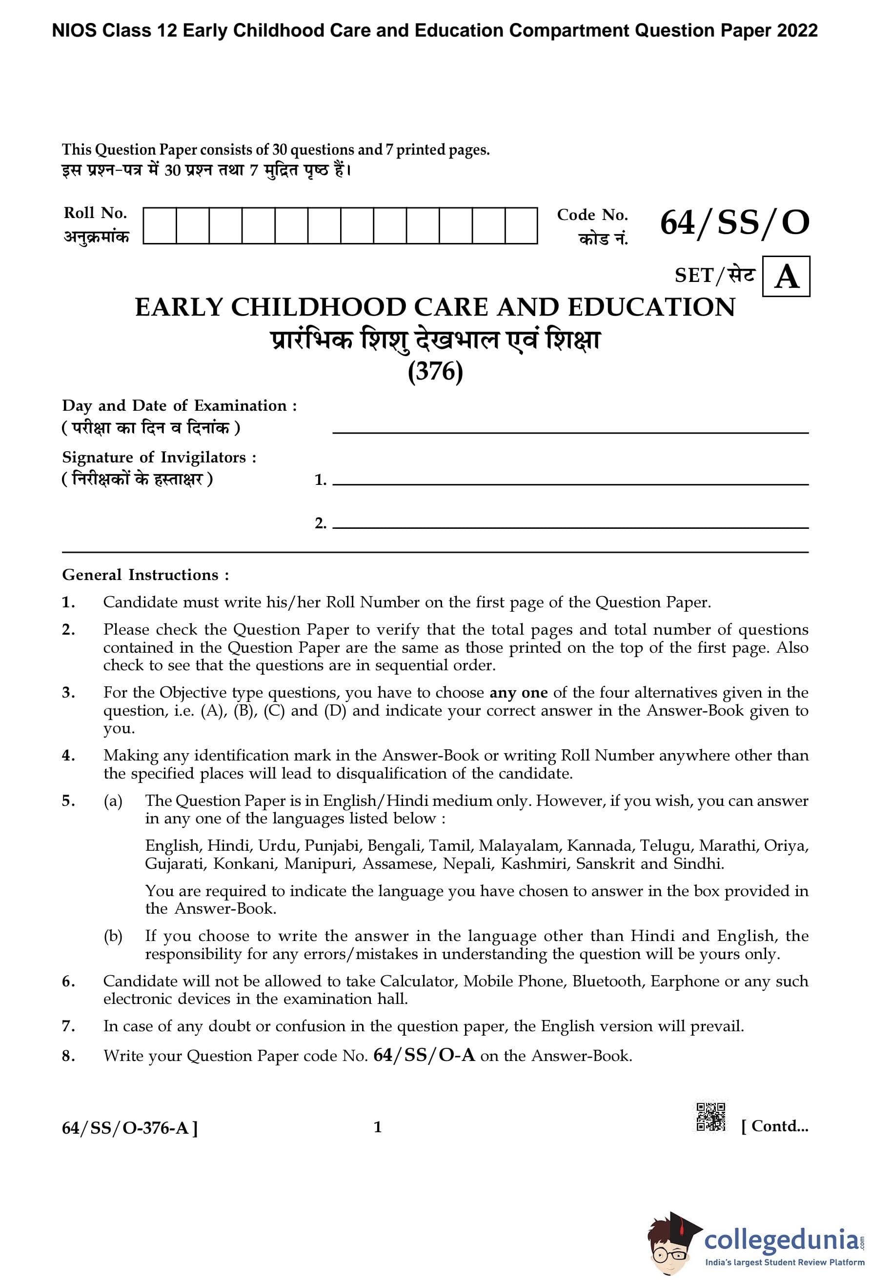 NIOS Class 12 Early Childhood Care and Education Compartment Question Paper 2022 with Answer Key pdf is available for download here. The exam was conducted by National Institute of Open Schooling on October 12, 2022 in the Afternoon Session 2:30 PM to 5:30 PM. The question paper comprised a total of 30 questions.