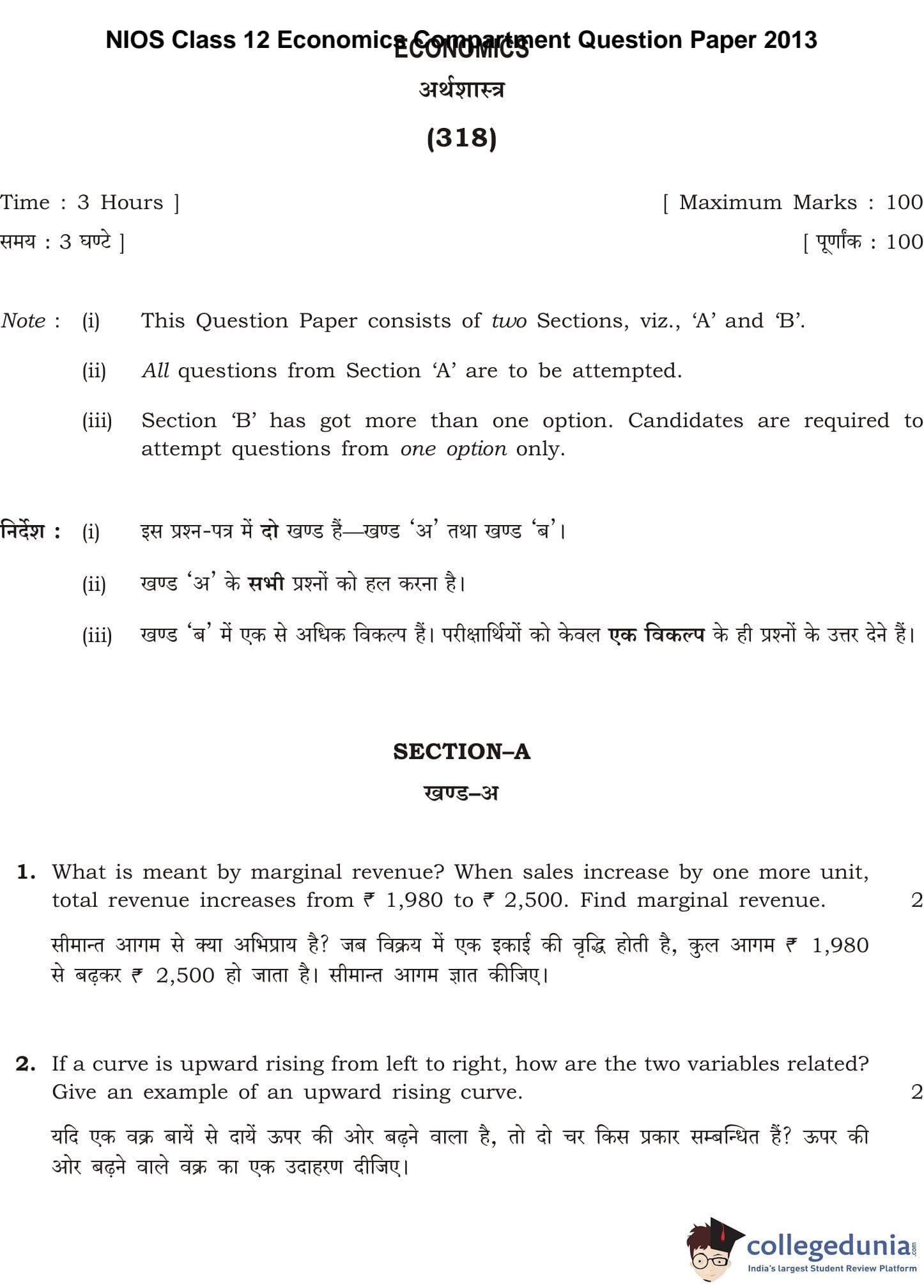 NIOS Class 12 Economics Compartment Question Paper 2013 with Answer Key pdf is available for download here. The exam was conducted by National Institute of Open Schooling on October 26, 2013 in the Afternoon Session 2:30 PM to 5:30 PM. The question paper comprised a total of 23 questions divided among 2 sections.