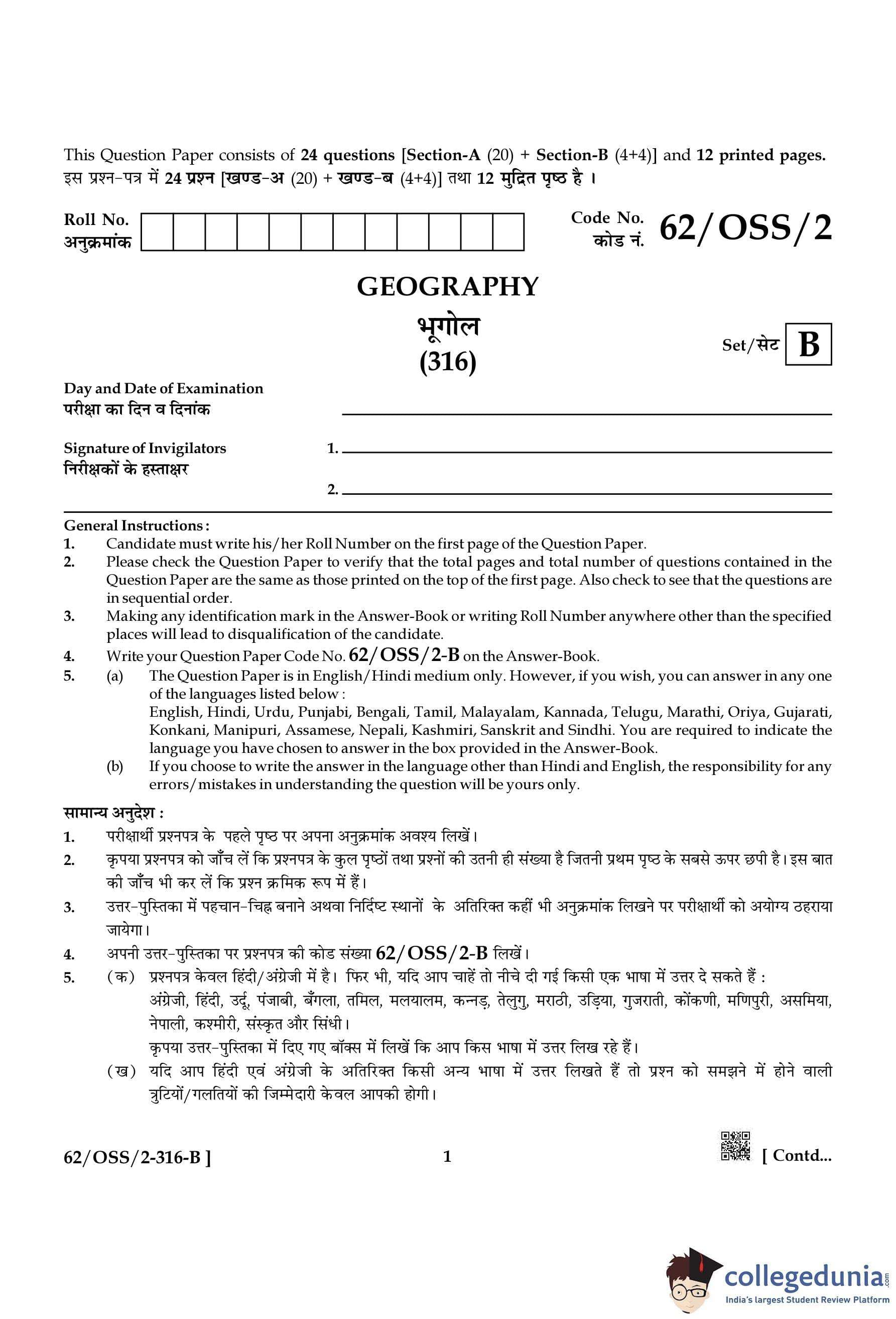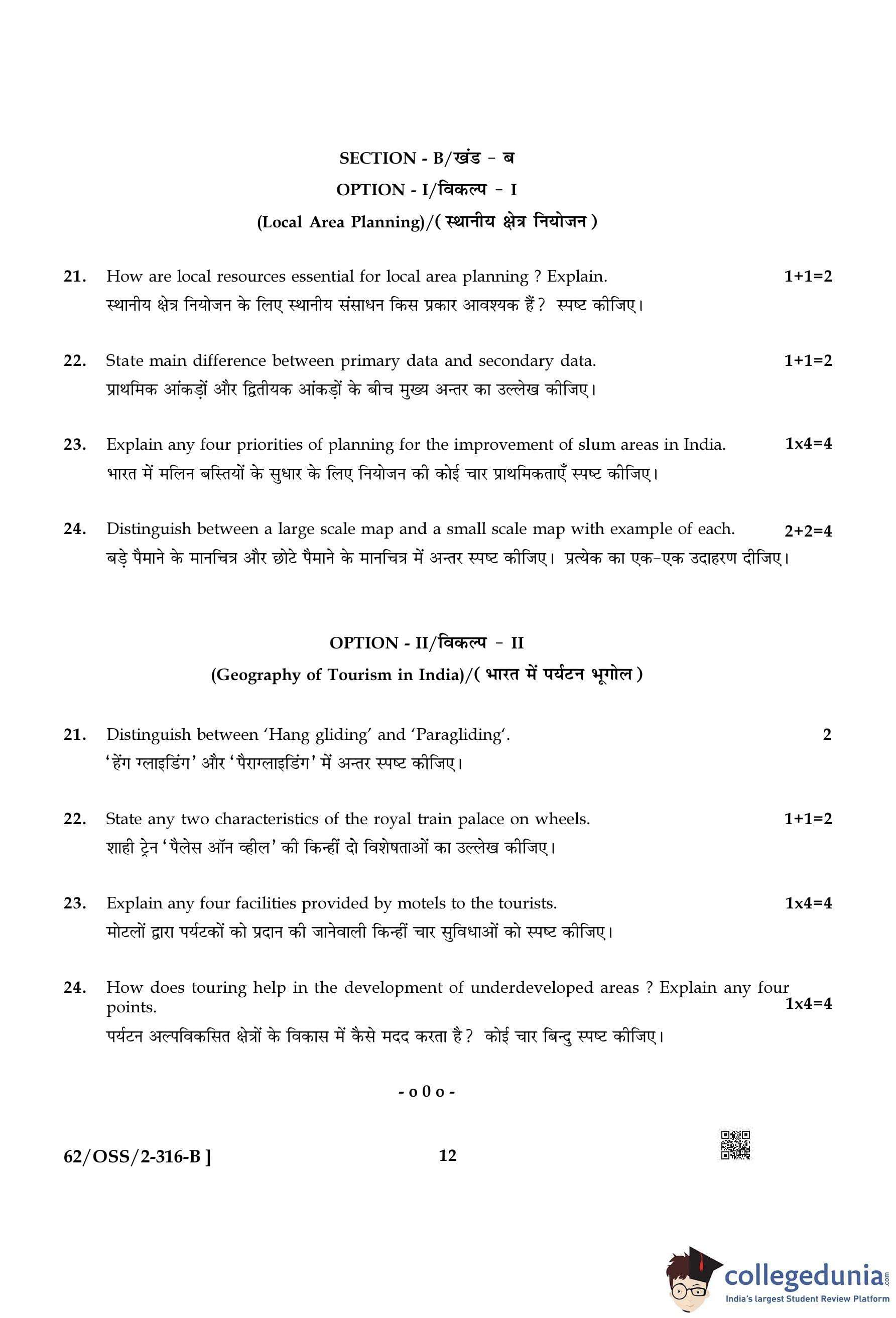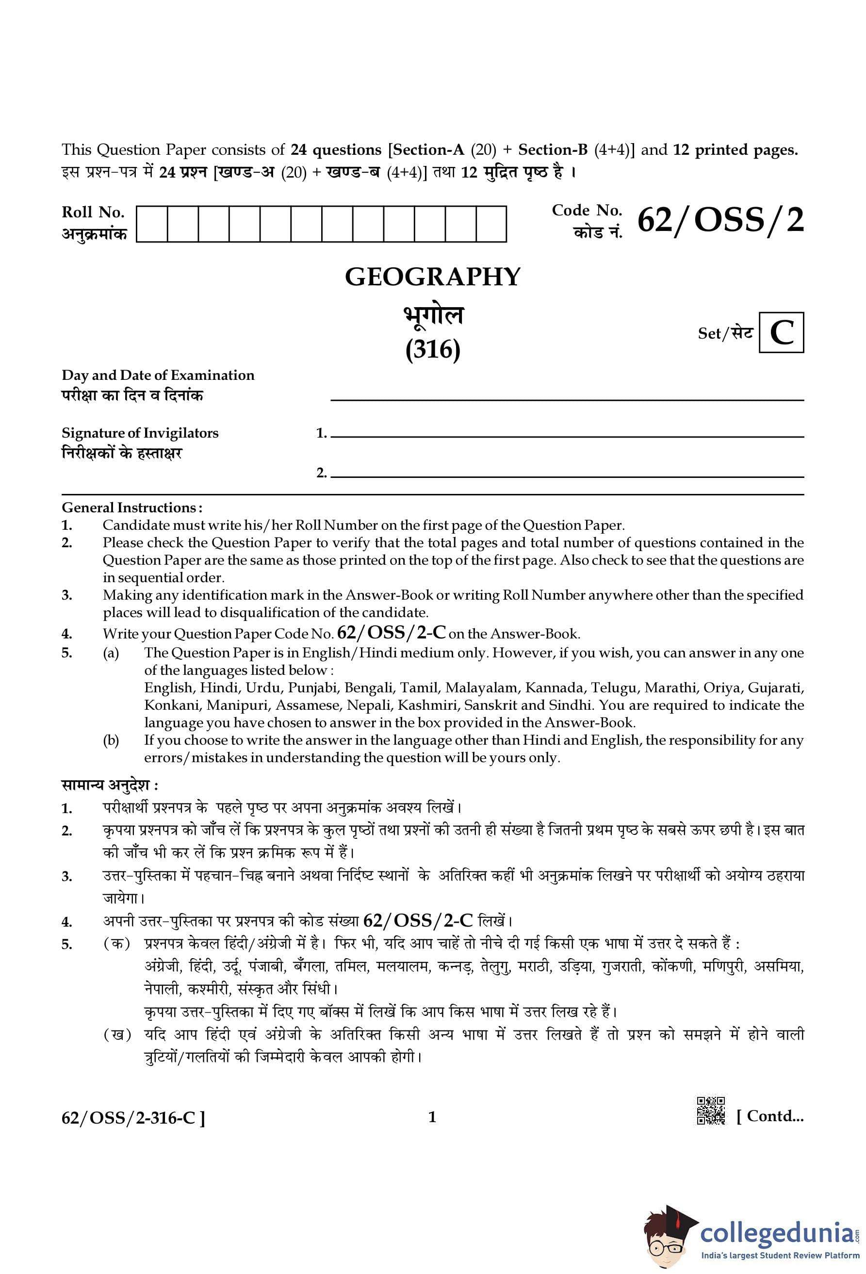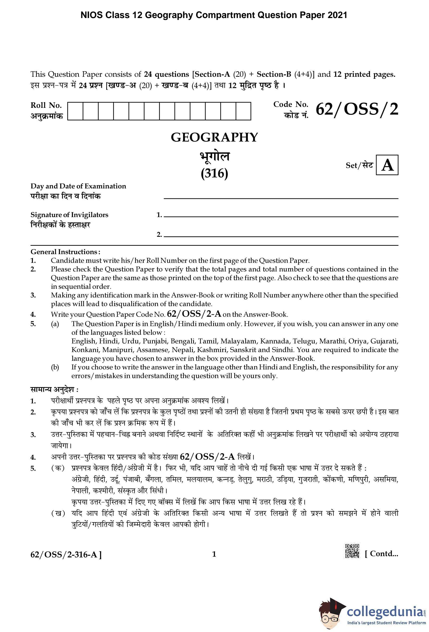 NIOS Class 12 Geography Compartment Question Paper 2021 with Answer Key pdf is available for download here. The exam was conducted by National Institute of Open Schooling on November 25, 2021 in the Afternoon Session 2:30 PM to 5:30 PM. The question paper comprised a total of 24 questions divided among 2 sections.