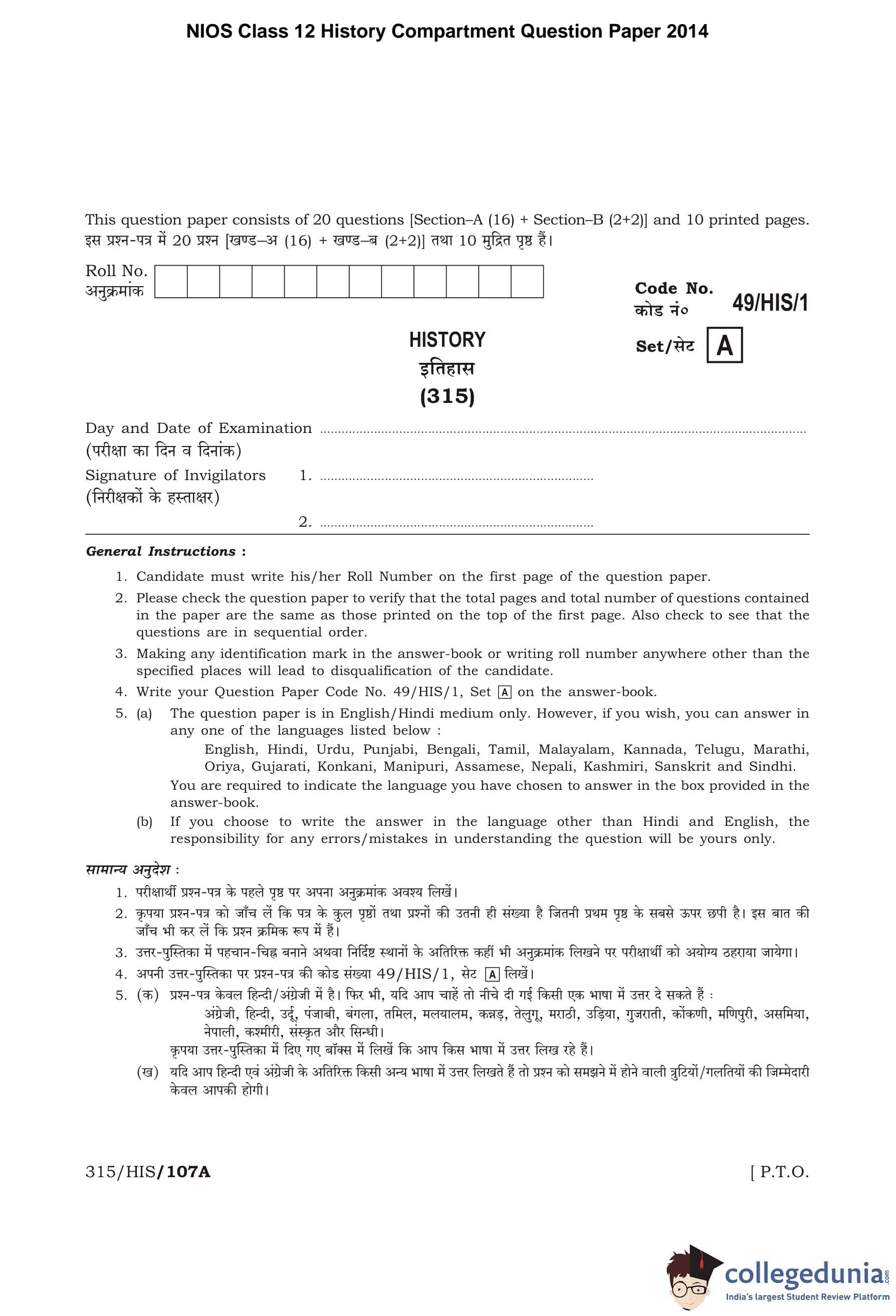 NIOS Class 12 History Compartment Question Paper 2014 with Answer Key pdf is available for download here. The exam was conducted by National Institute of Open Schooling on October 27, 2014 in the Afternoon Session 2:30 PM to 5:30 PM. The question paper comprised a total of 18 questions divided among 2 sections.