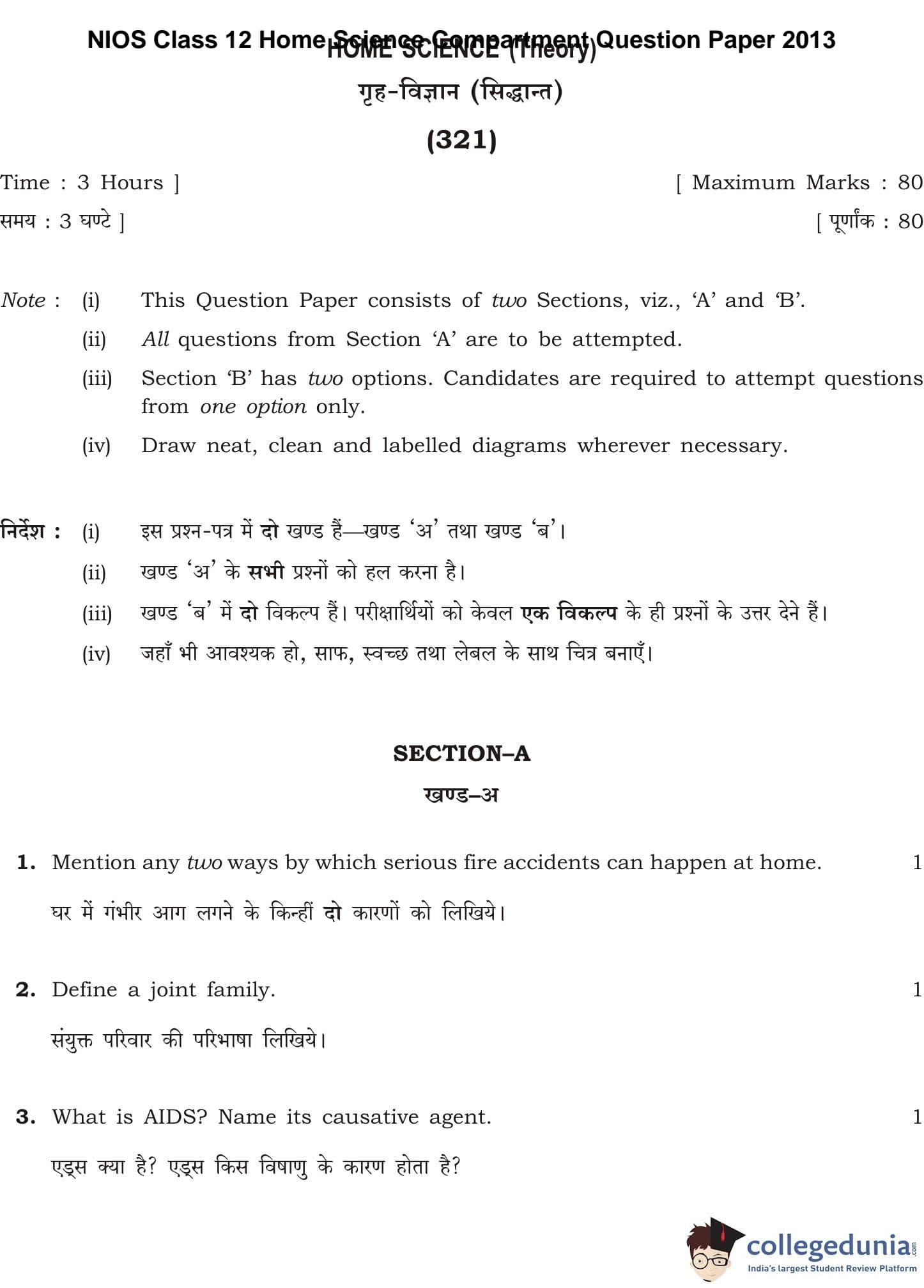 NIOS Class 12 Home Science Compartment Question Paper 2013 with Answer Key pdf is available for download here. The exam was conducted by National Institute of Open Schooling on October 8, 2013 in the Afternoon Session 2:30 PM to 5:30 PM. The question paper comprised a total of 26 questions divided among 2 sections.