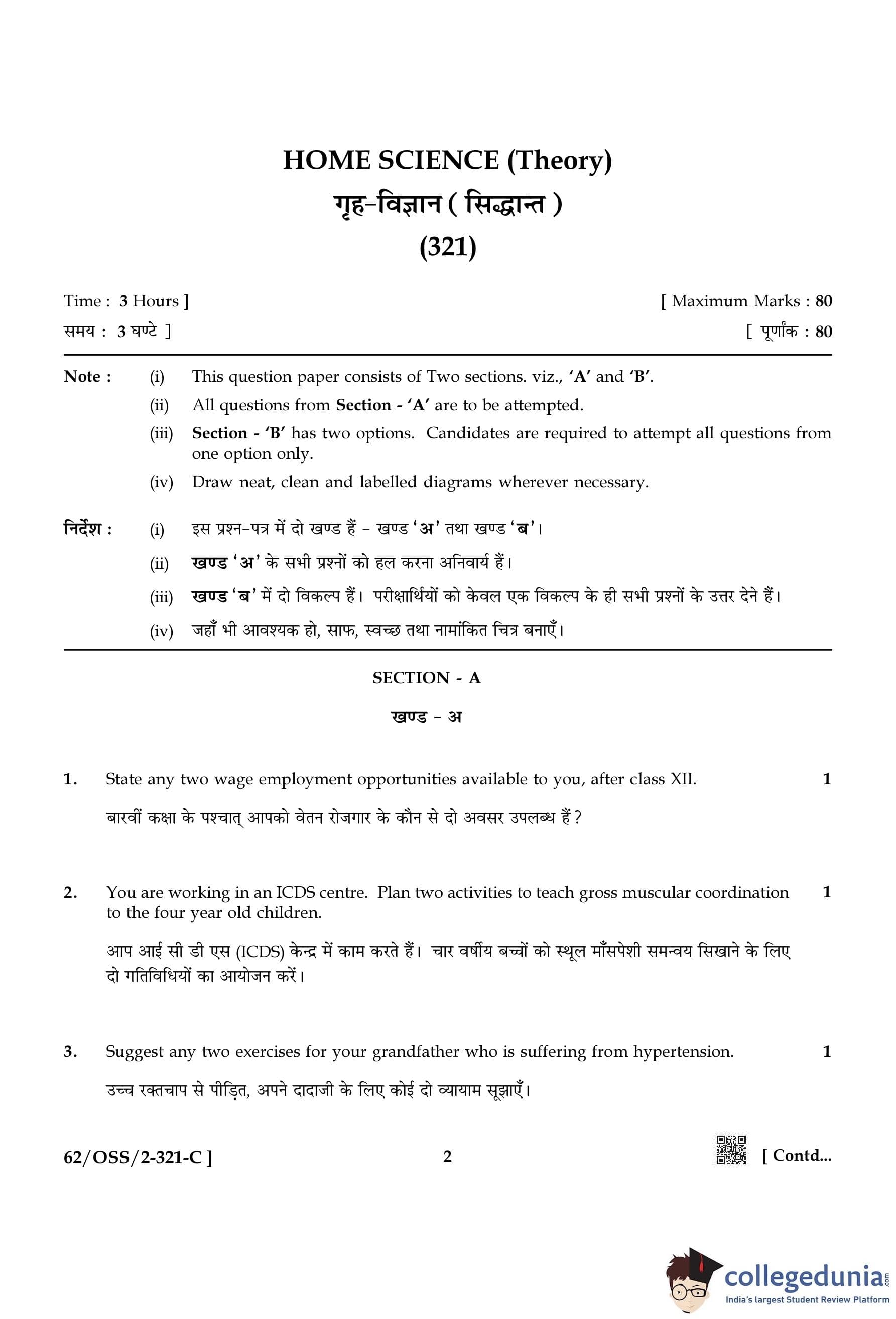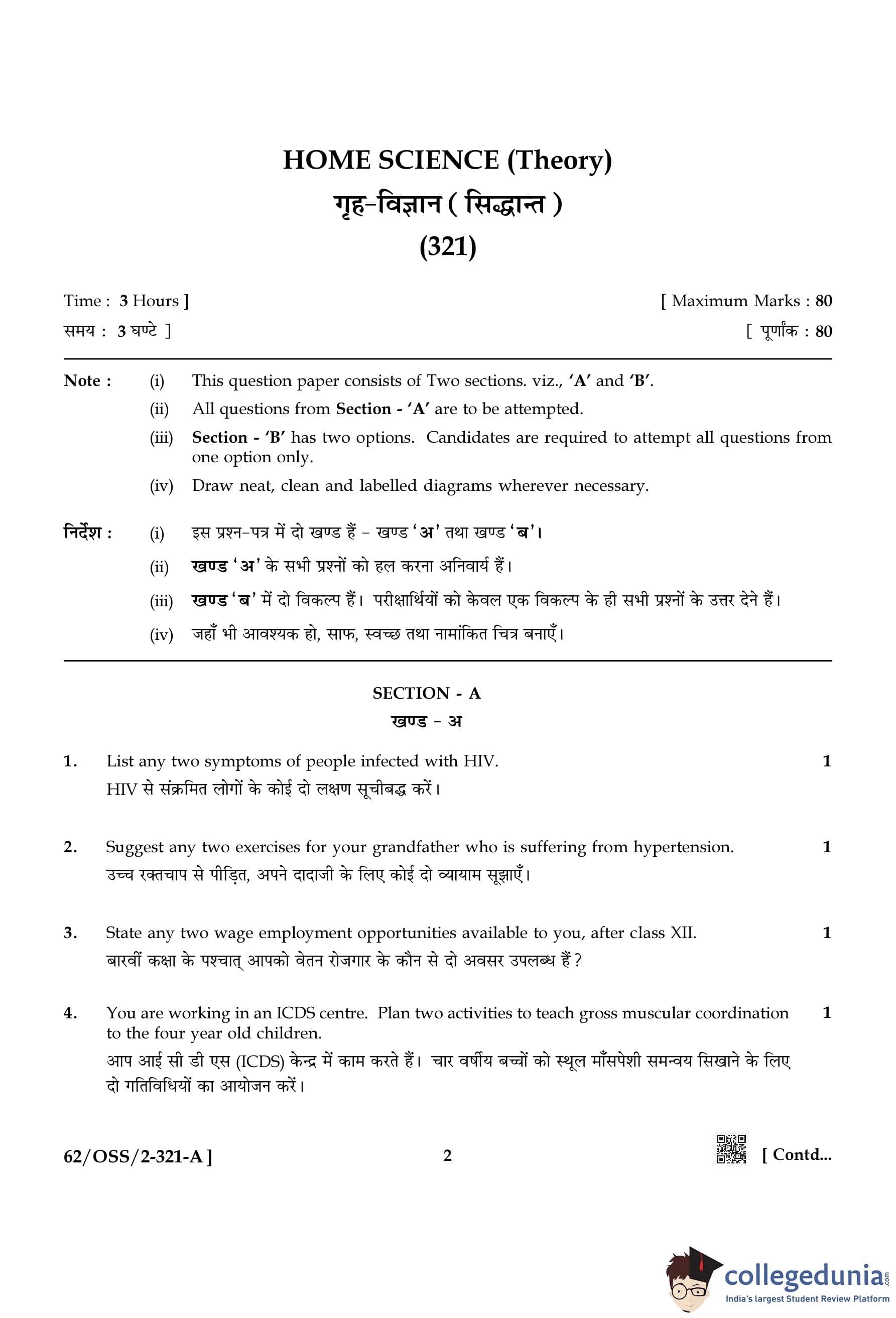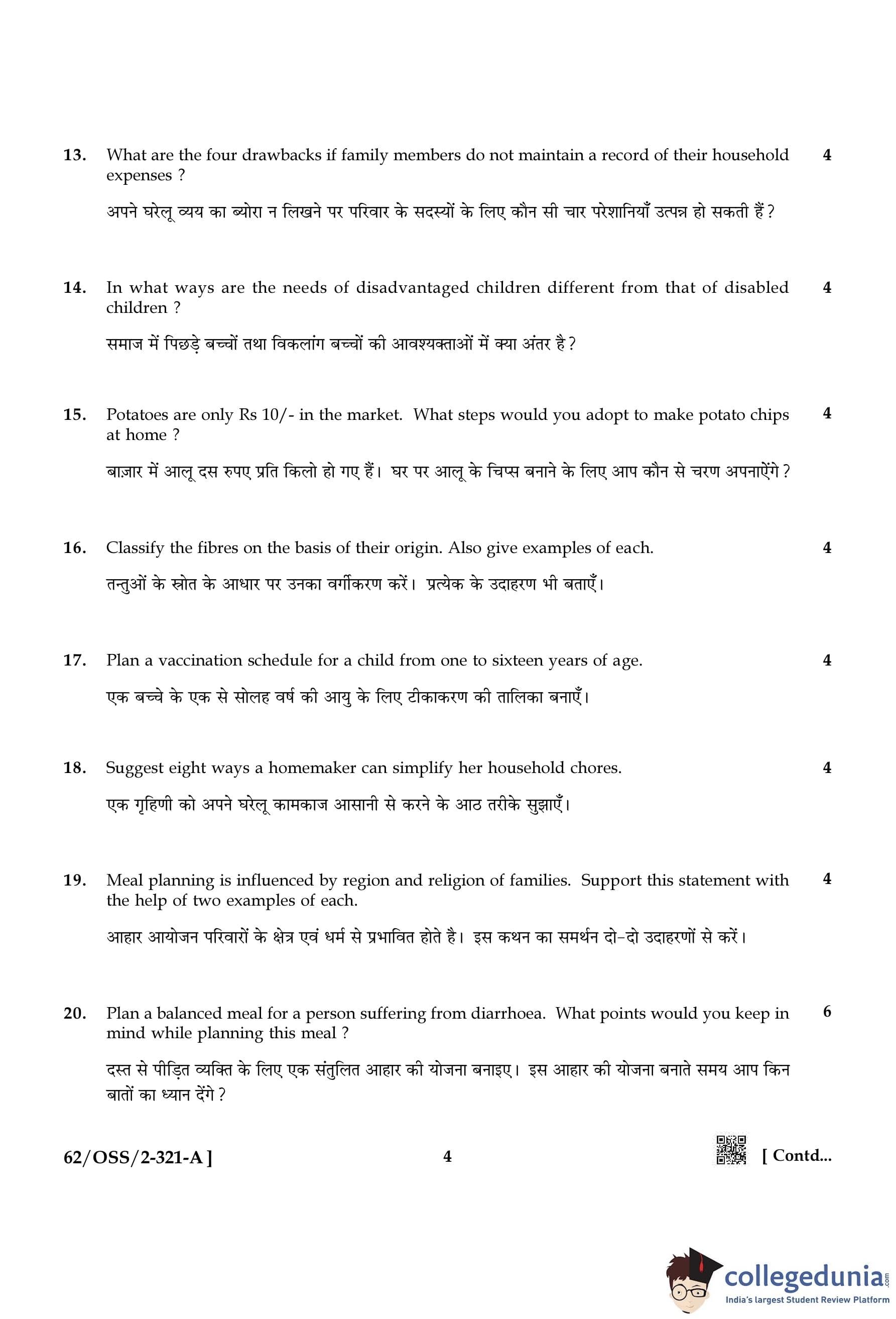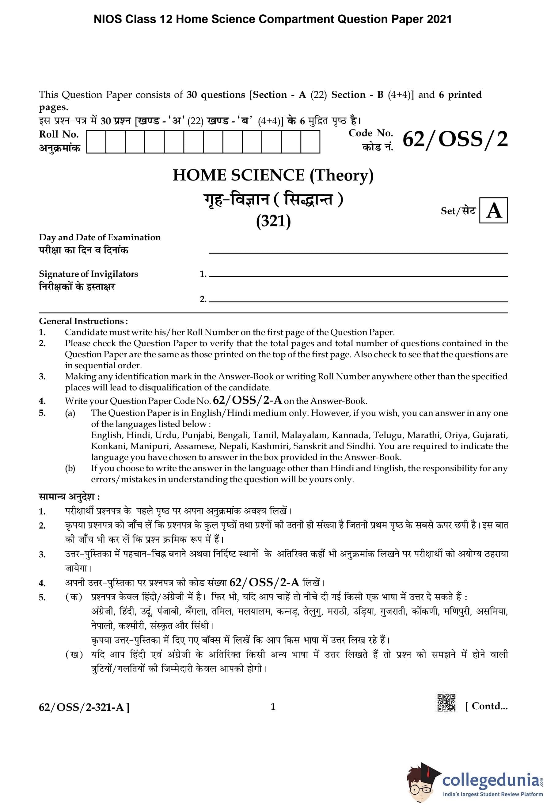 NIOS Class 12 Home Science Compartment Question Paper 2021 with Answer Key pdf is available for download here. The exam was conducted by National Institute of Open Schooling on November 30, 2021 in the Afternoon Session 2:30 PM to 5:30 PM. The question paper comprised a total of 26 questions divided among 2 sections.