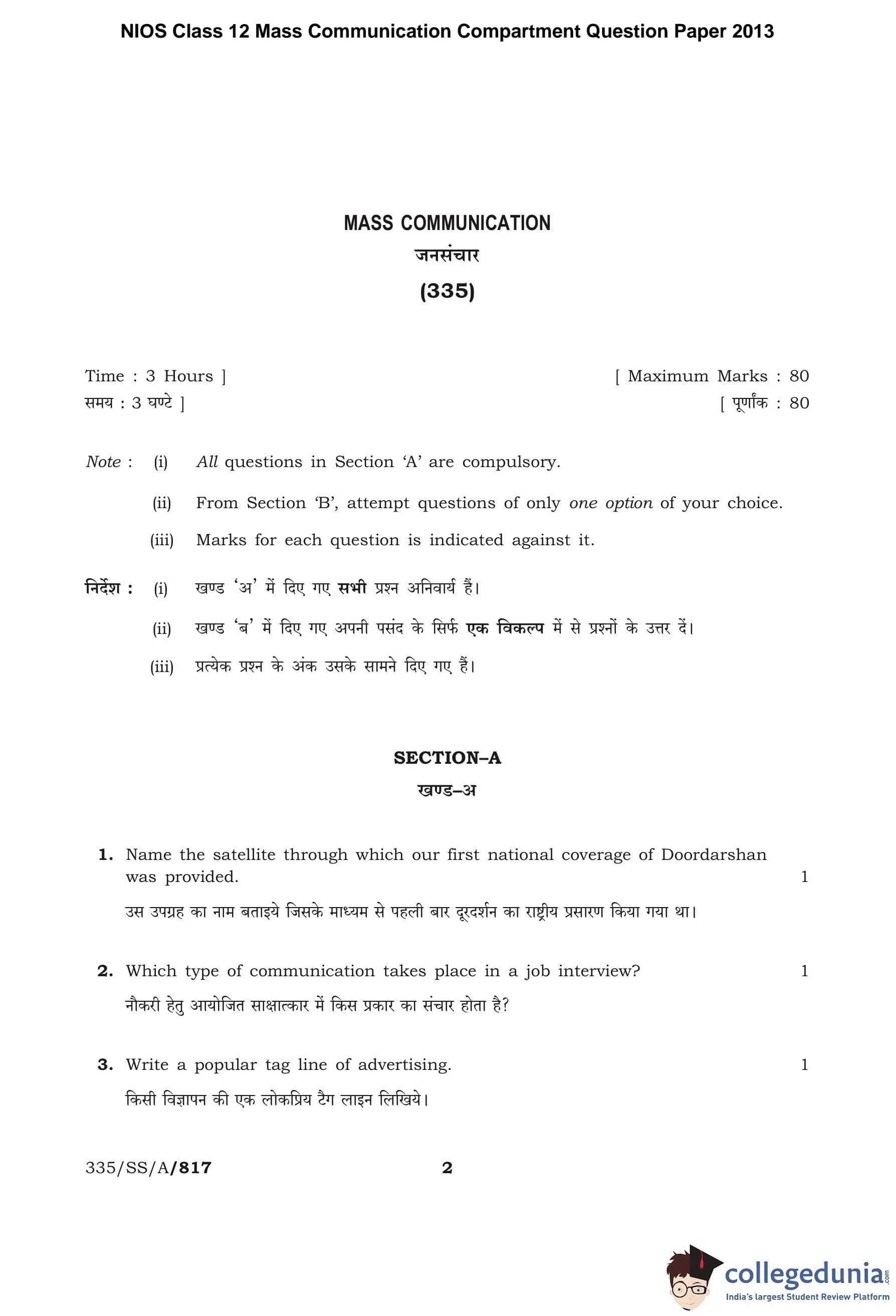 NIOS Class 12 Mass Communication Compartment Question Paper 2013 with Answer Key pdf is available for download here. The exam was conducted by National Institute of Open Schooling on November 9, 2013 in the Afternoon Session 2:30 PM to 5:30 PM. The question paper comprised a total of 25 questions divided among 2 sections.