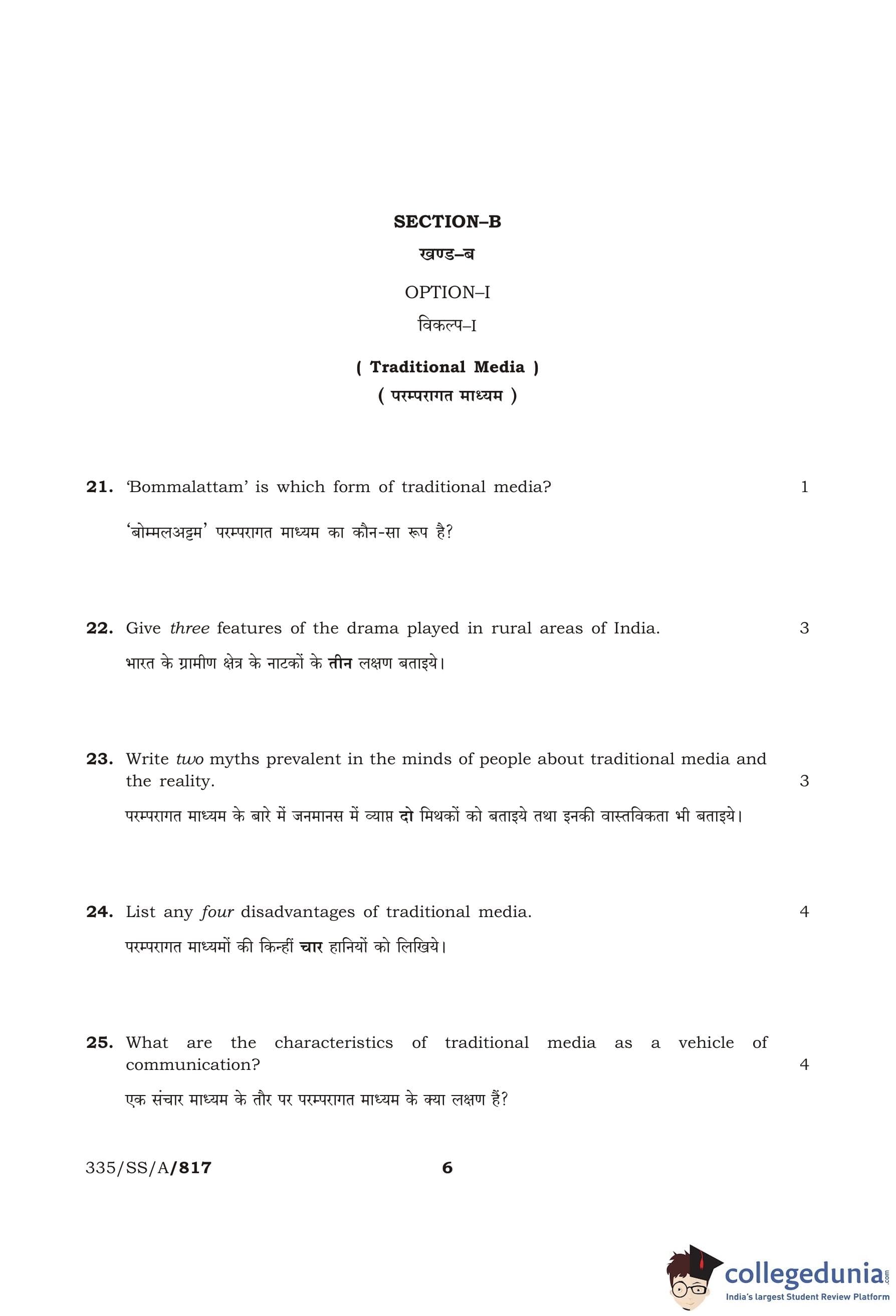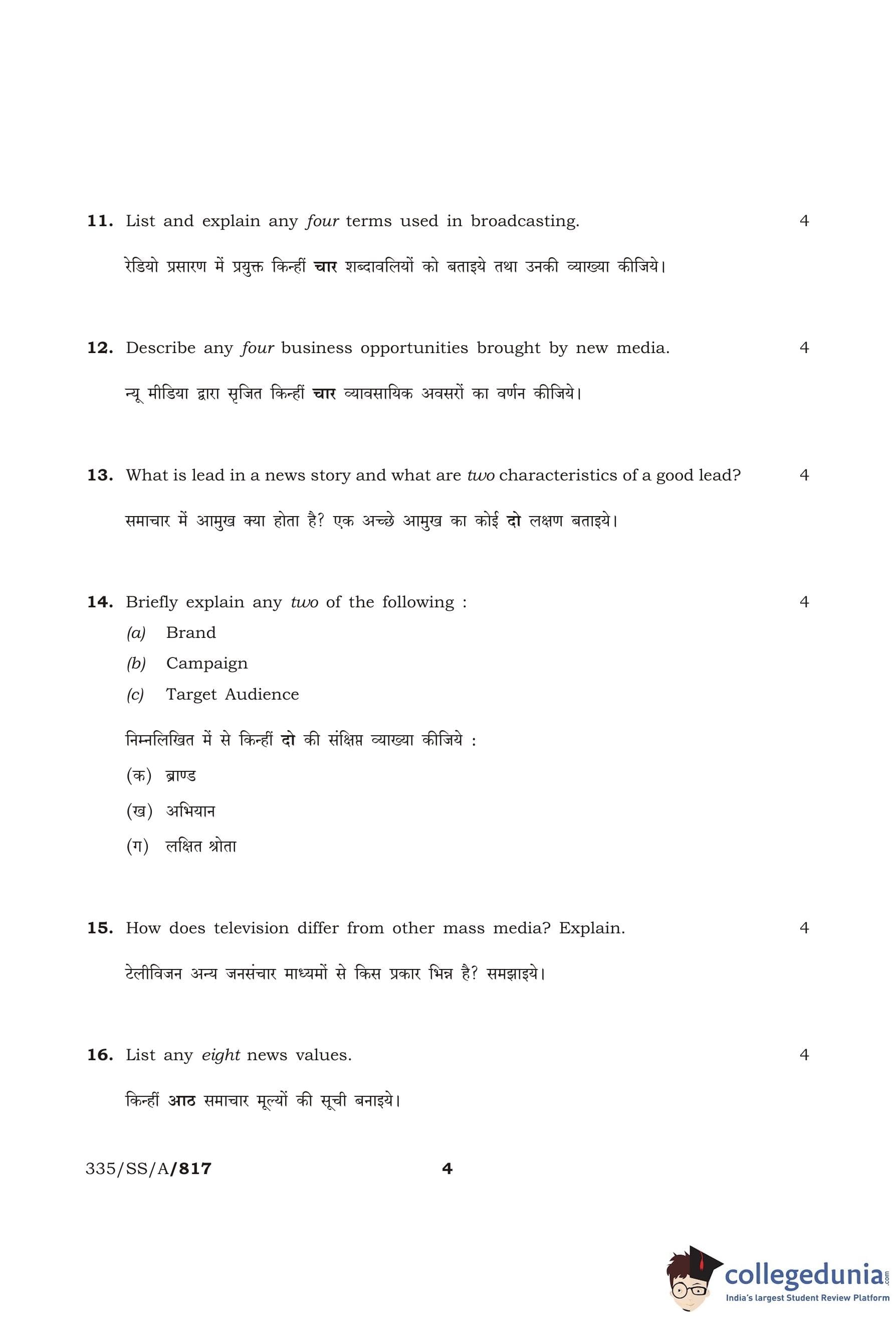 NIOS Class 12 Mass Communication Compartment Question Paper 2013 with Answer Key