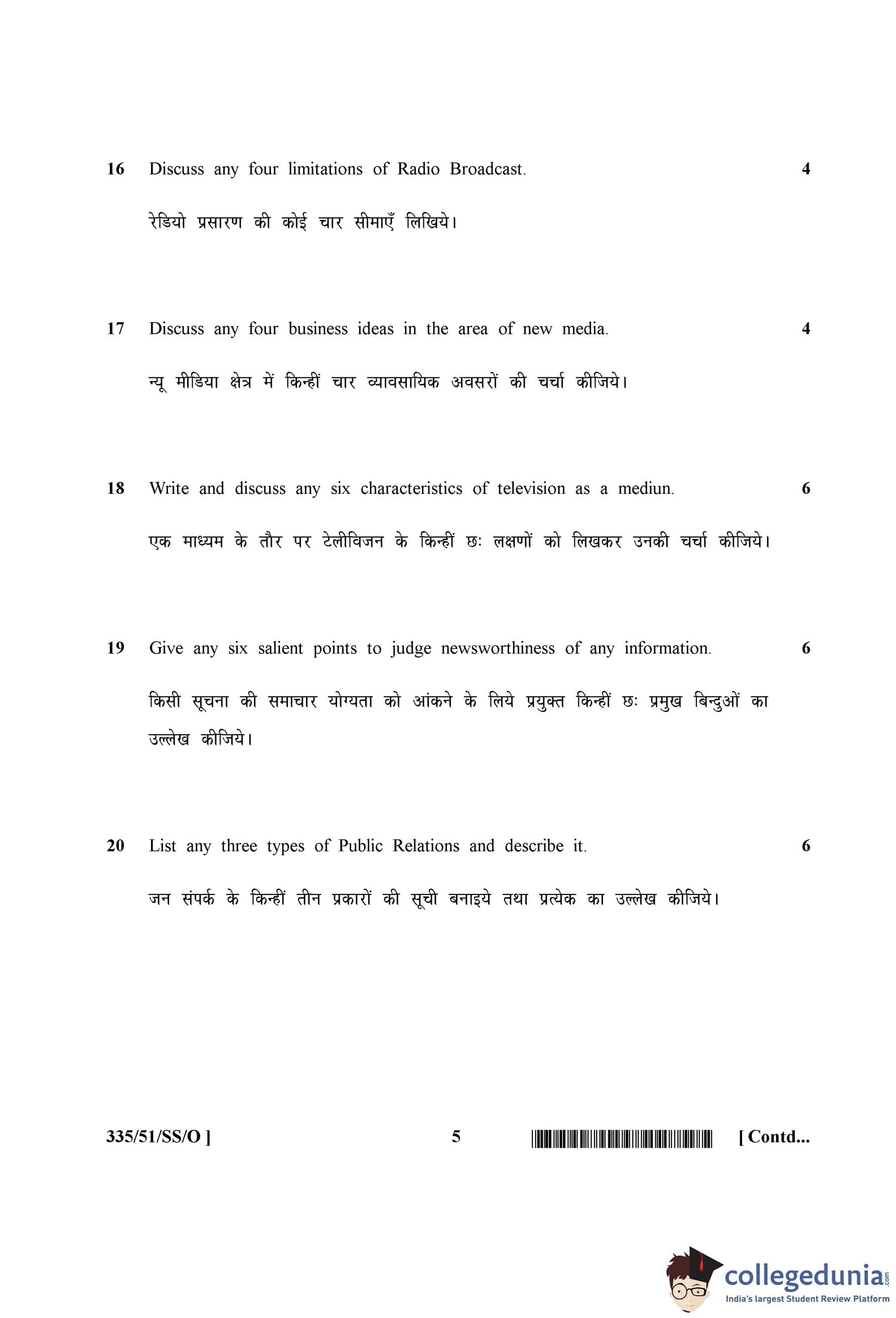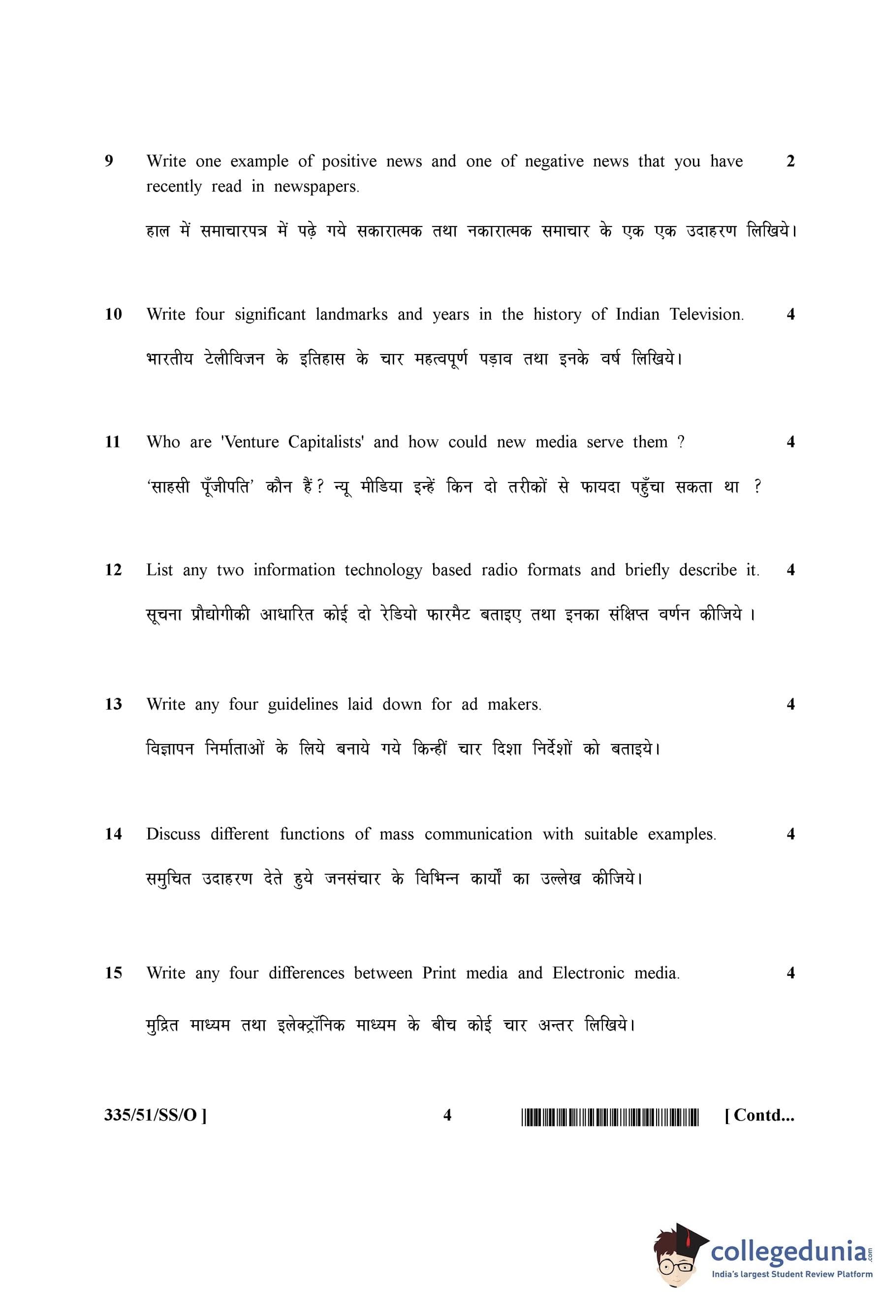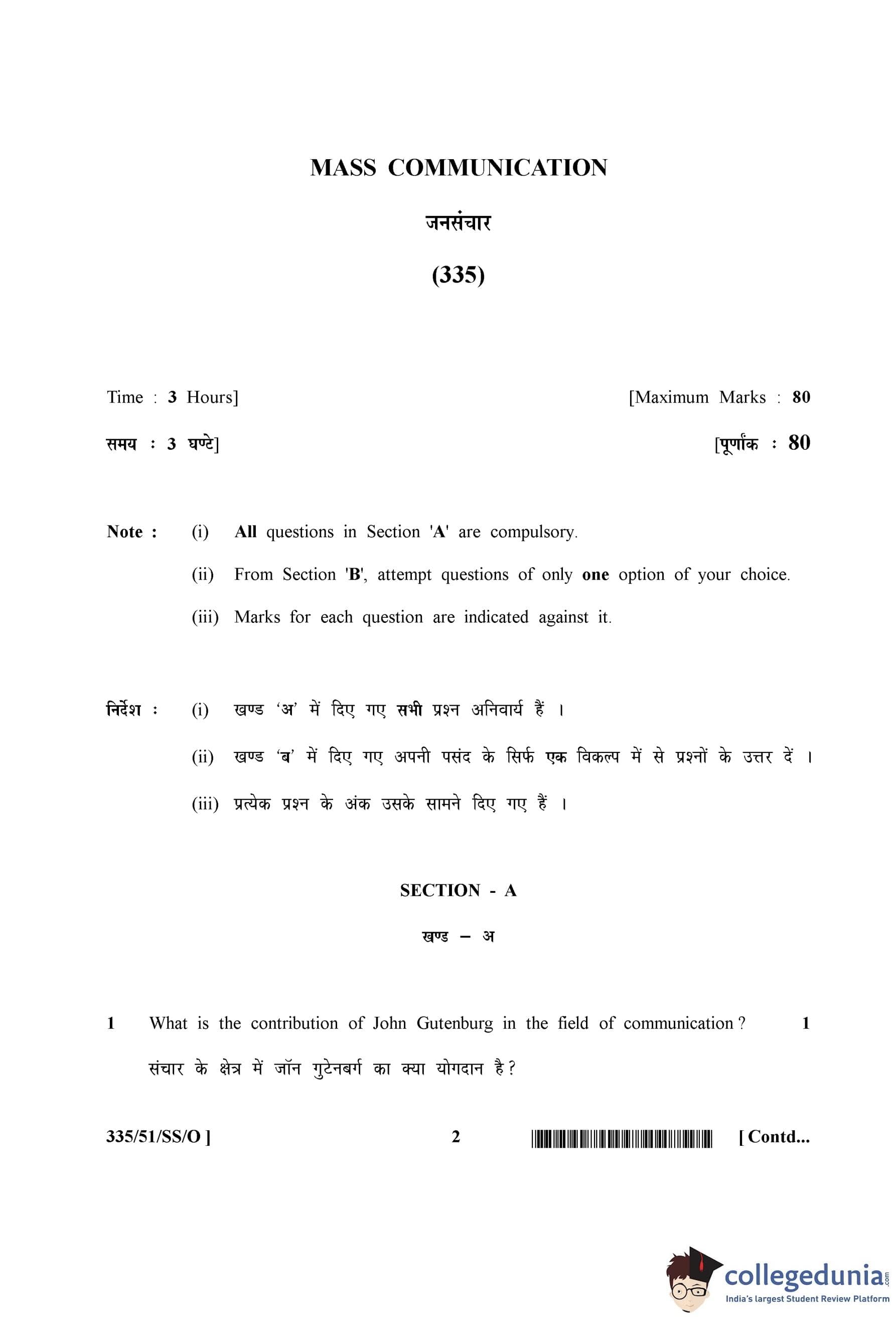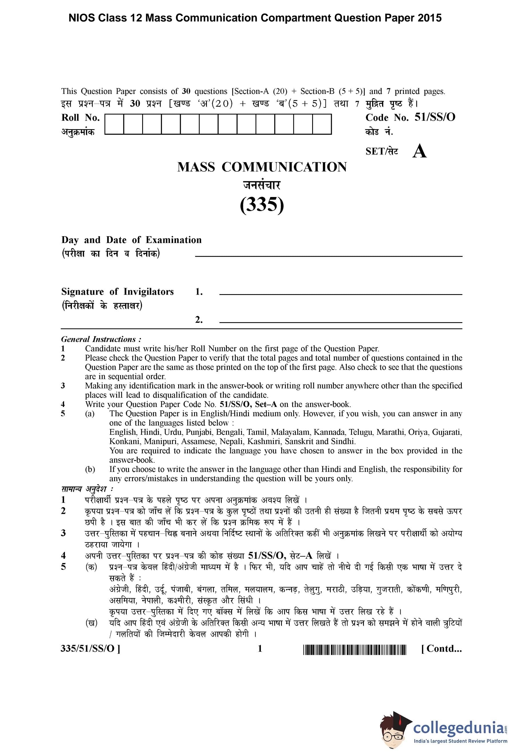 NIOS Class 12 Mass Communication Compartment Question Paper 2015 with Answer Key pdf is available for download here. The exam was conducted by National Institute of Open Schooling on November 7, 2015 in the Afternoon Session 2:30 PM to 5:30 PM. The question paper comprised a total of 25 questions divided among 2 sections.