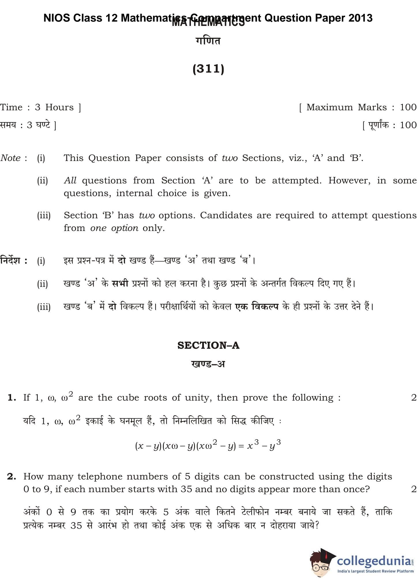 NIOS Class 12 Mathematics Compartment Question Paper 2013 with Answer Key