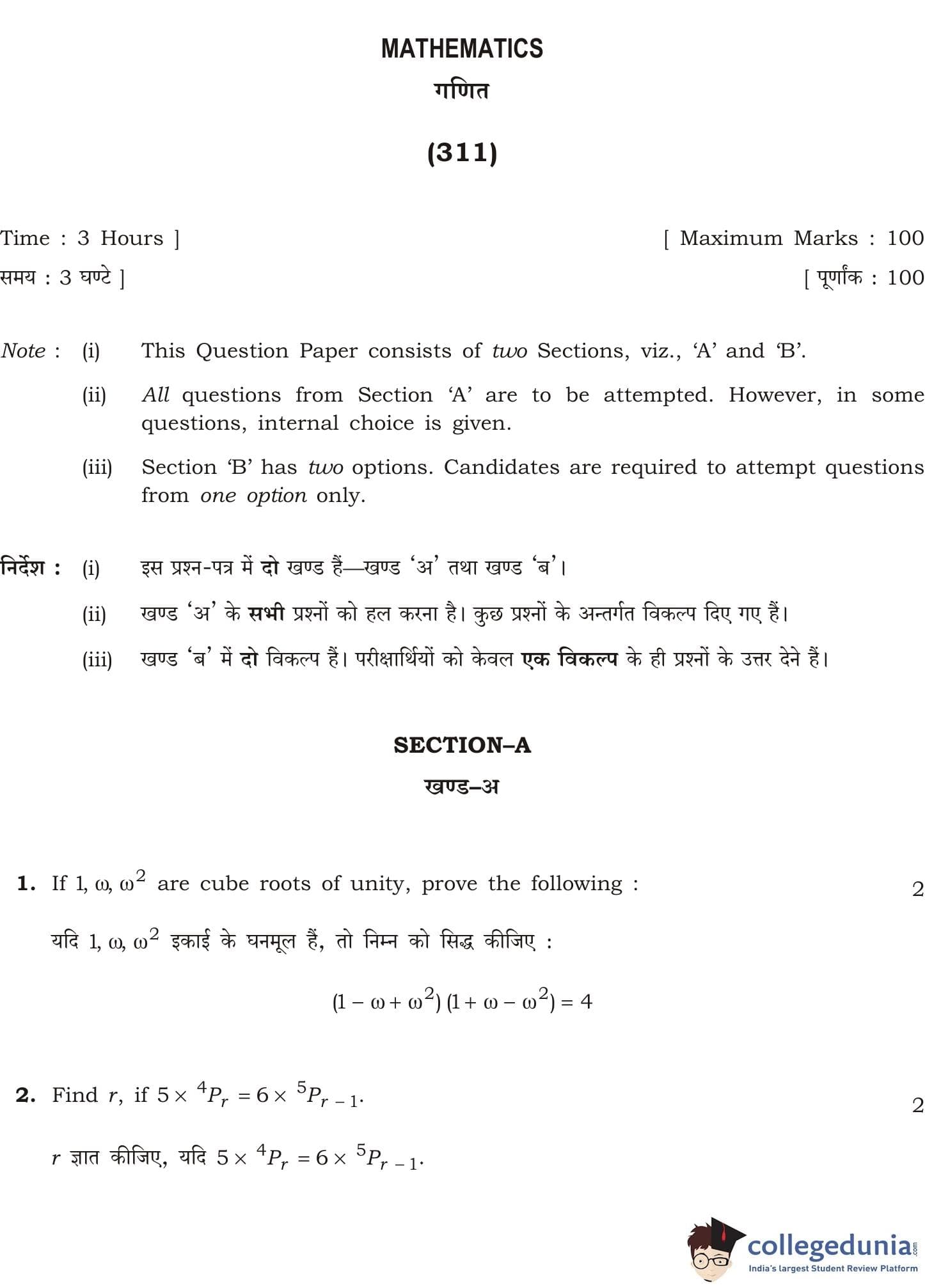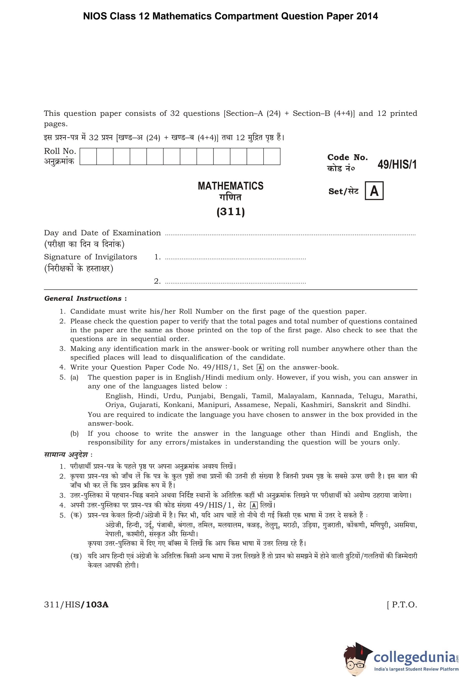 NIOS Class 12 Mathematics Compartment Question Paper 2014 with Answer Key pdf is available for download here. The exam was conducted by National Institute of Open Schooling on October 9, 2014 in the Afternoon Session 2:30 PM to 5:30 PM. The question paper comprised a total of 28 questions divided among 2 sections.