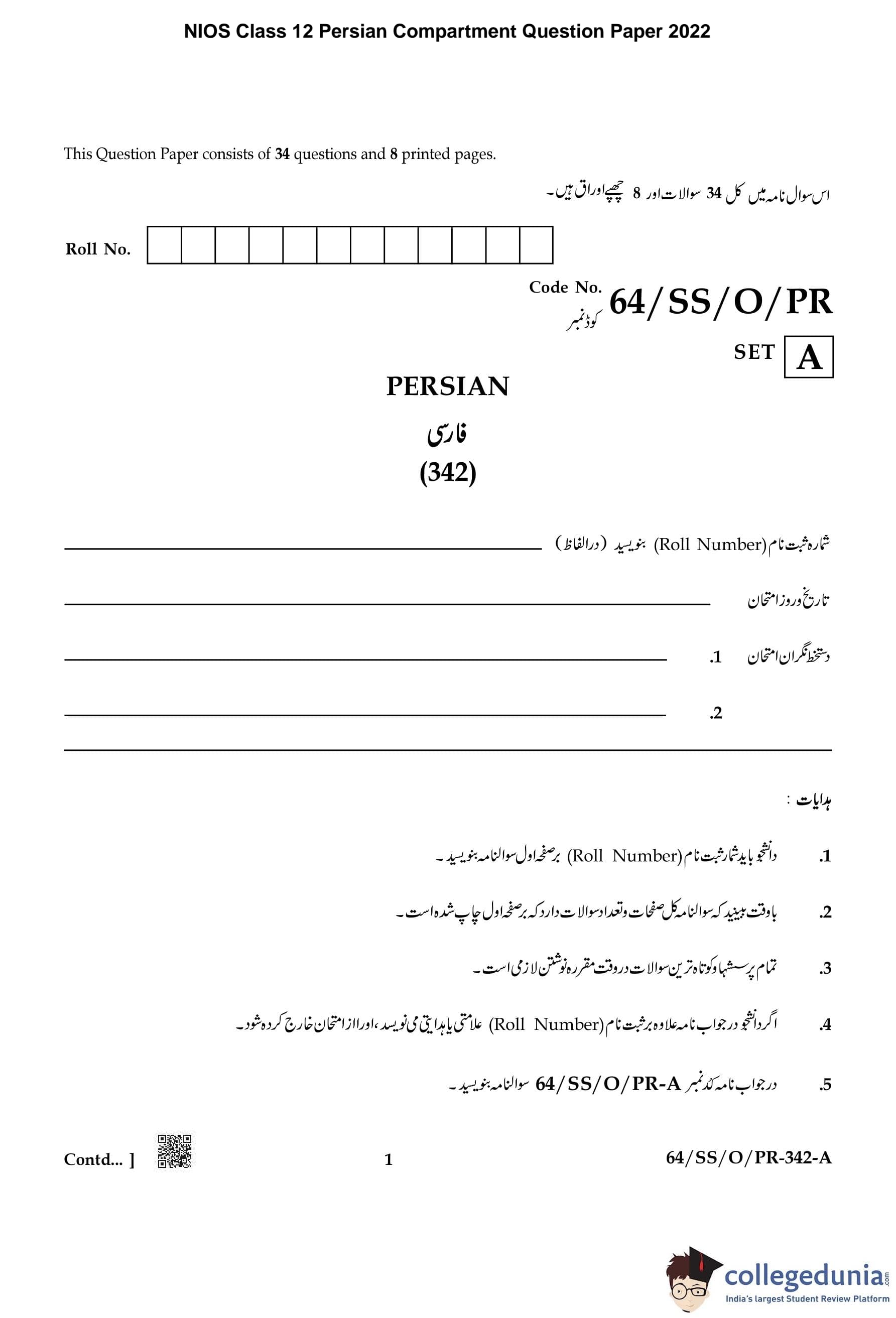 | NIOS Class 12 Persian Question Paper 2022 PDF | NIOS Class 12 Persian Answer Key 2022 PDF |