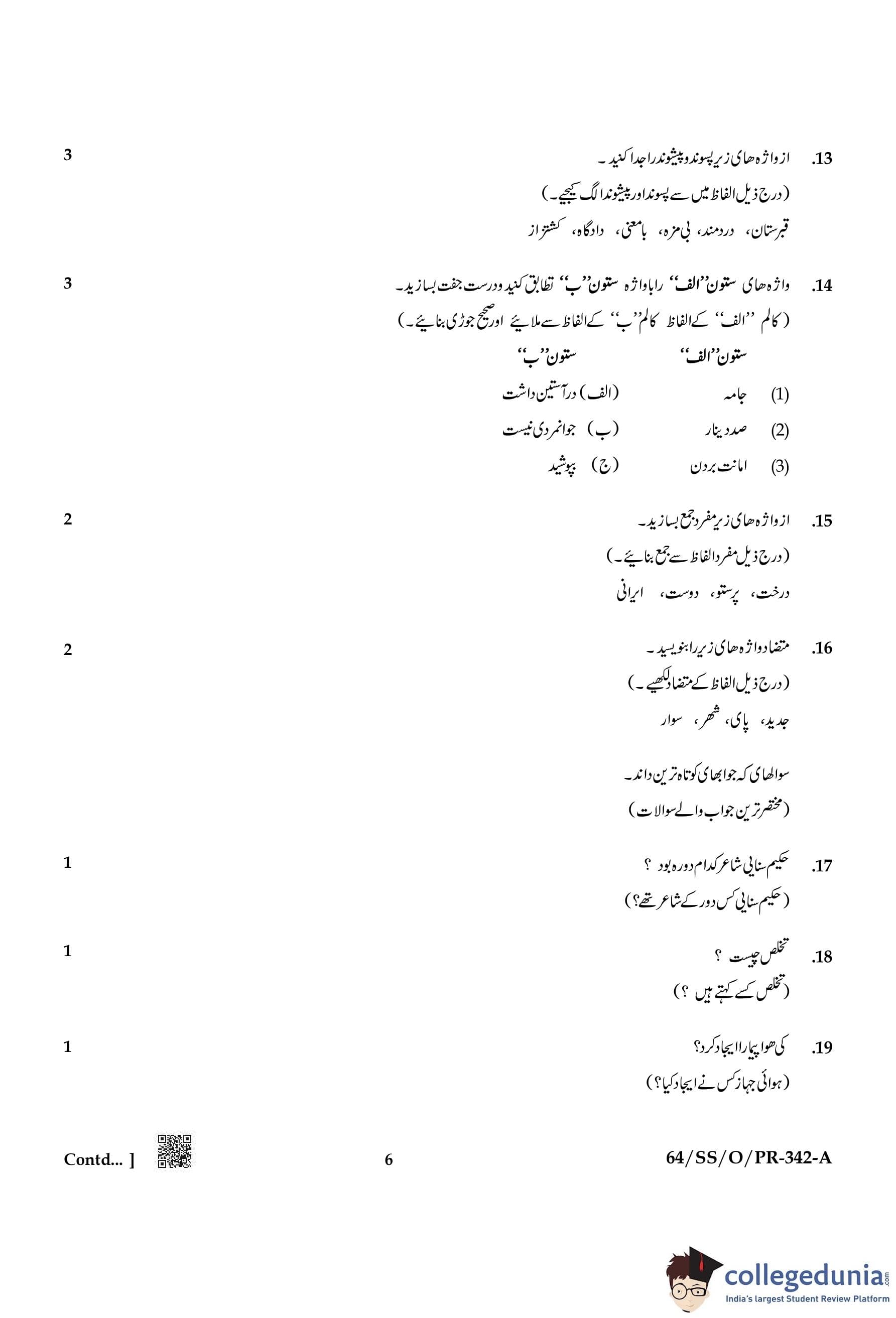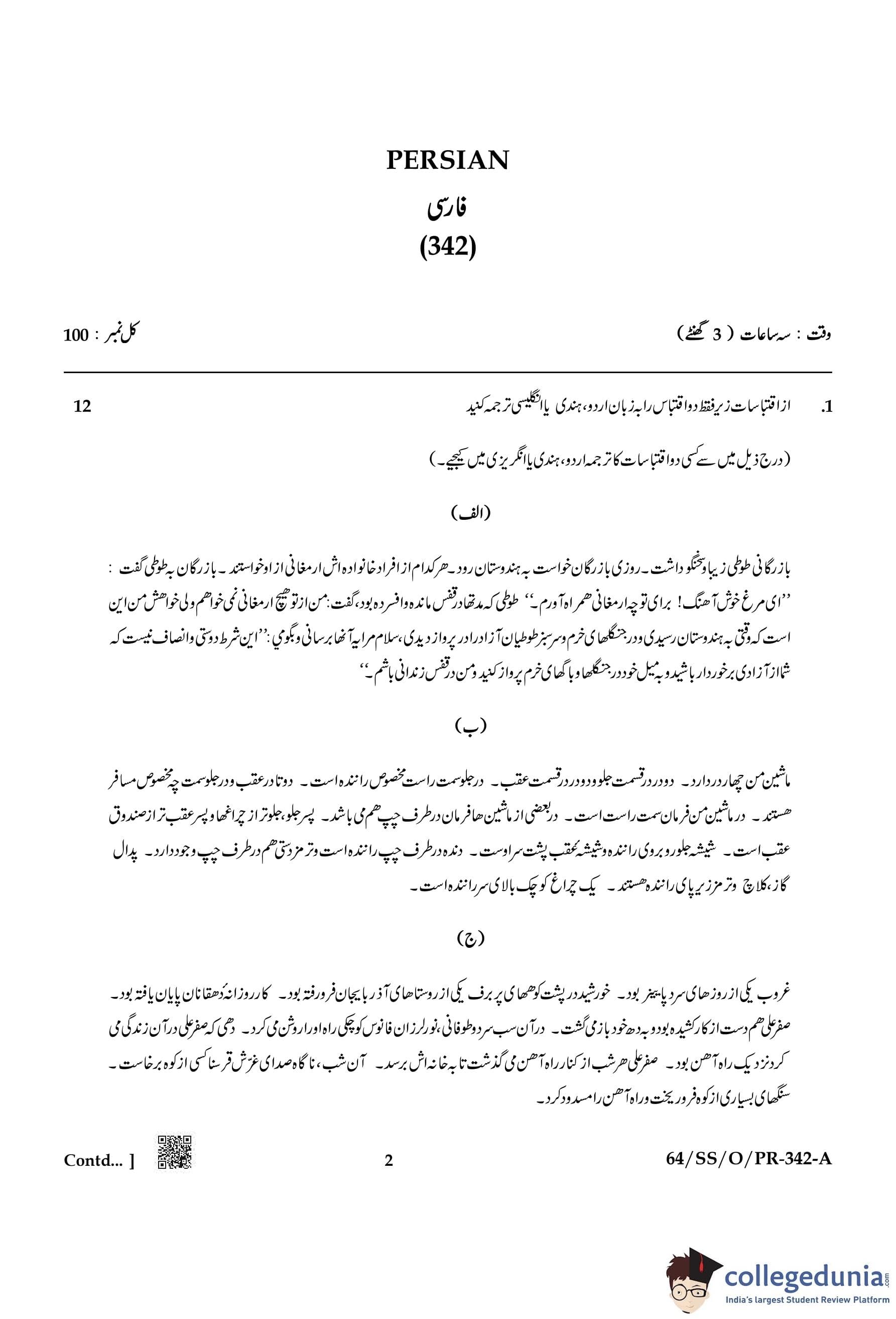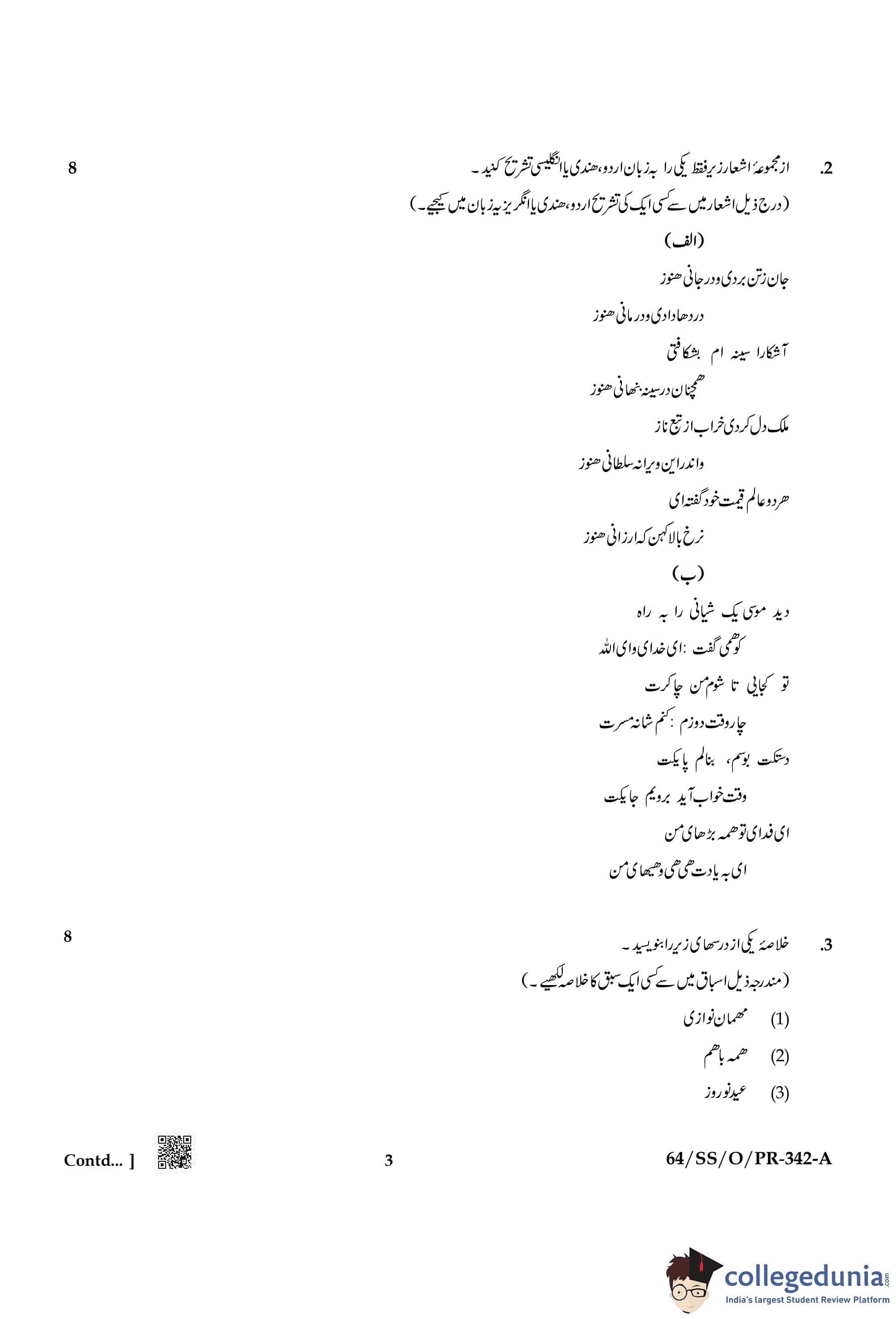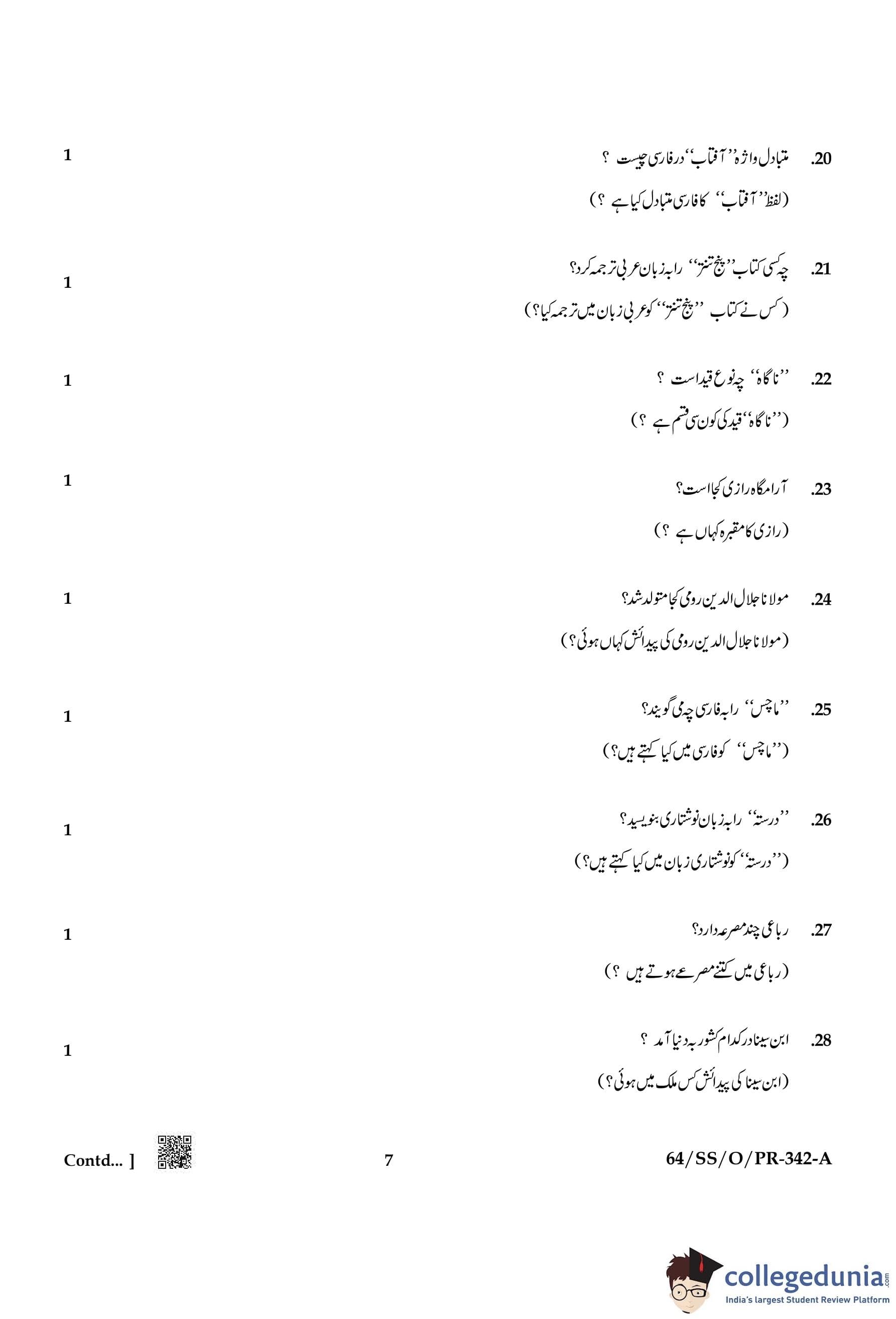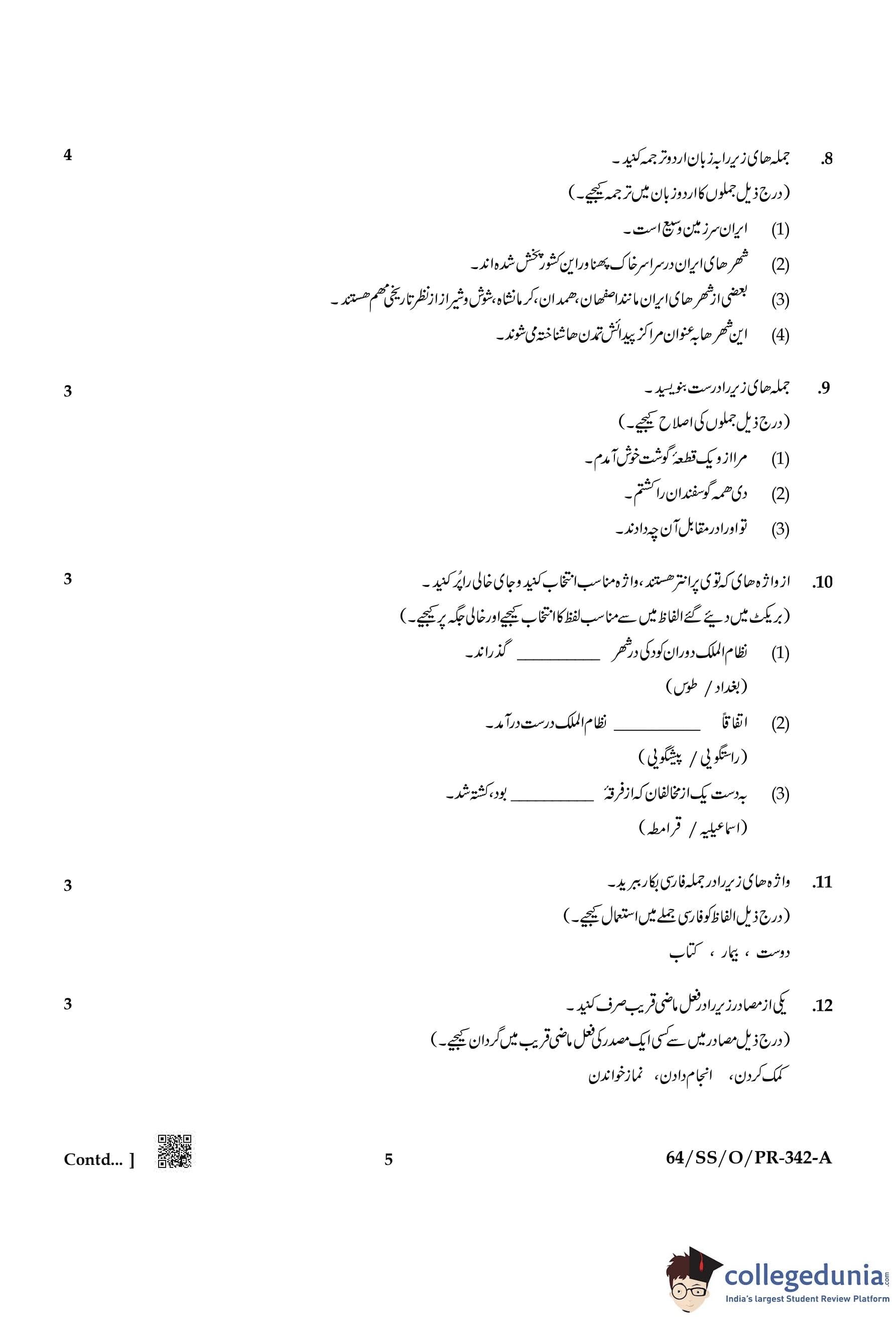 NIOS Class 12 Persian Compartment Question Paper 2022 with Answer Key