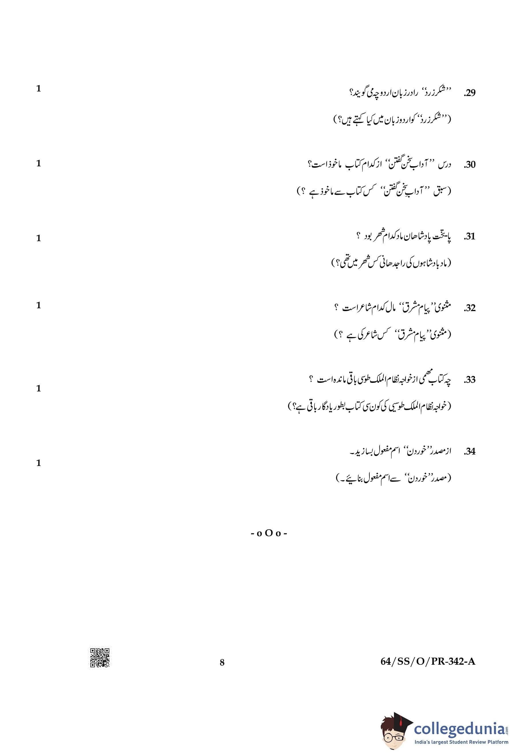 NIOS Class 12 Persian Compartment Question Paper 2022 with Answer Key pdf is available for download here. The exam was conducted by National Institute of Open Schooling on October 29, 2022 in the Afternoon Session 2:30 PM to 5:30 PM. The question paper comprised a total of 34 questions.