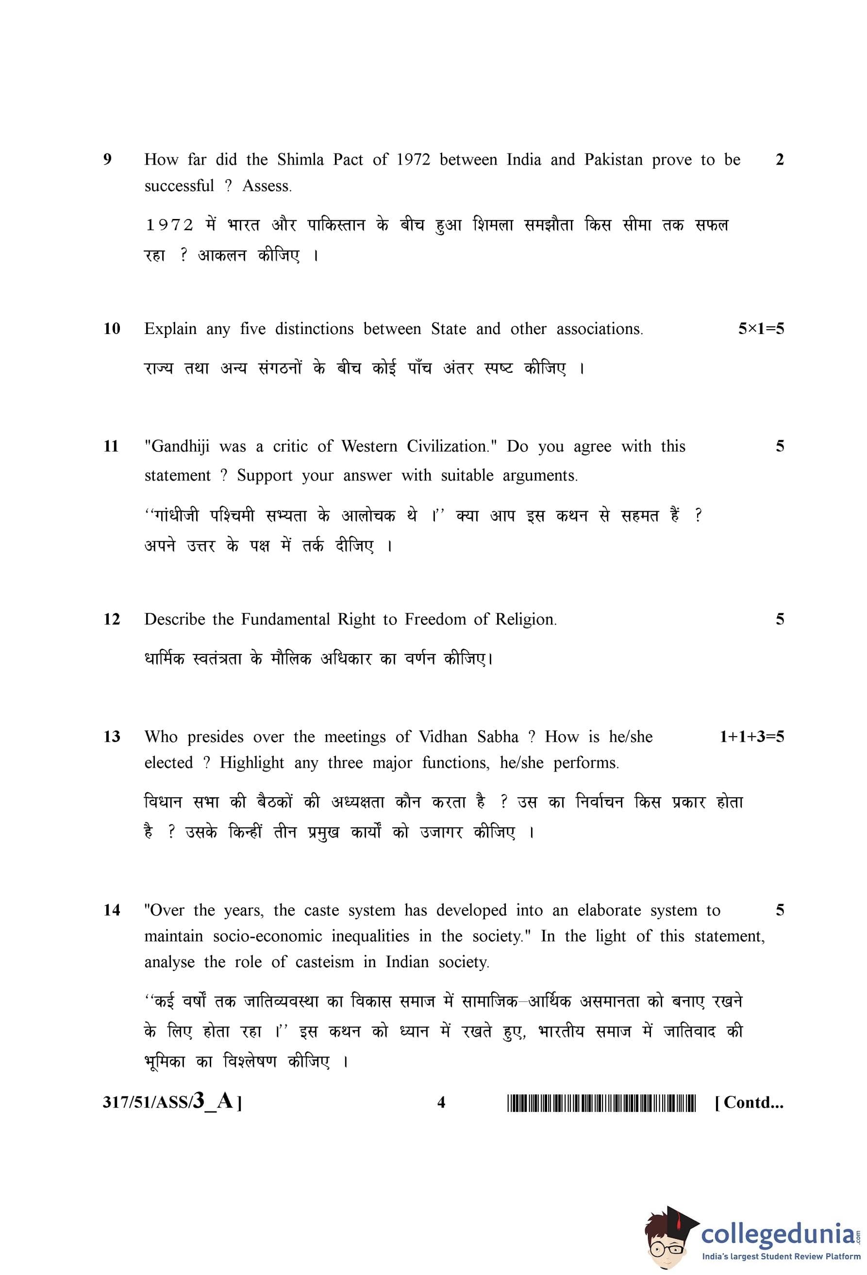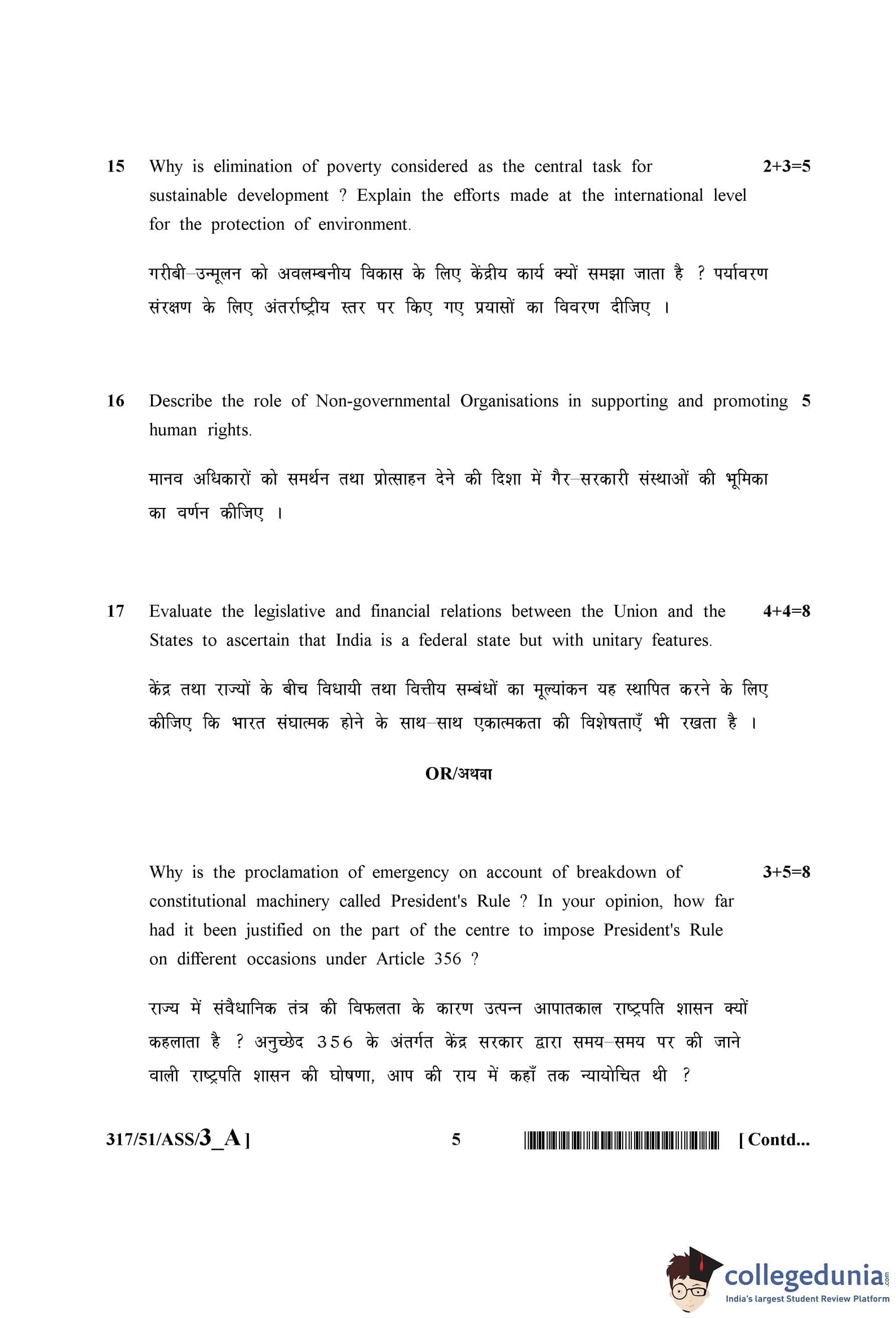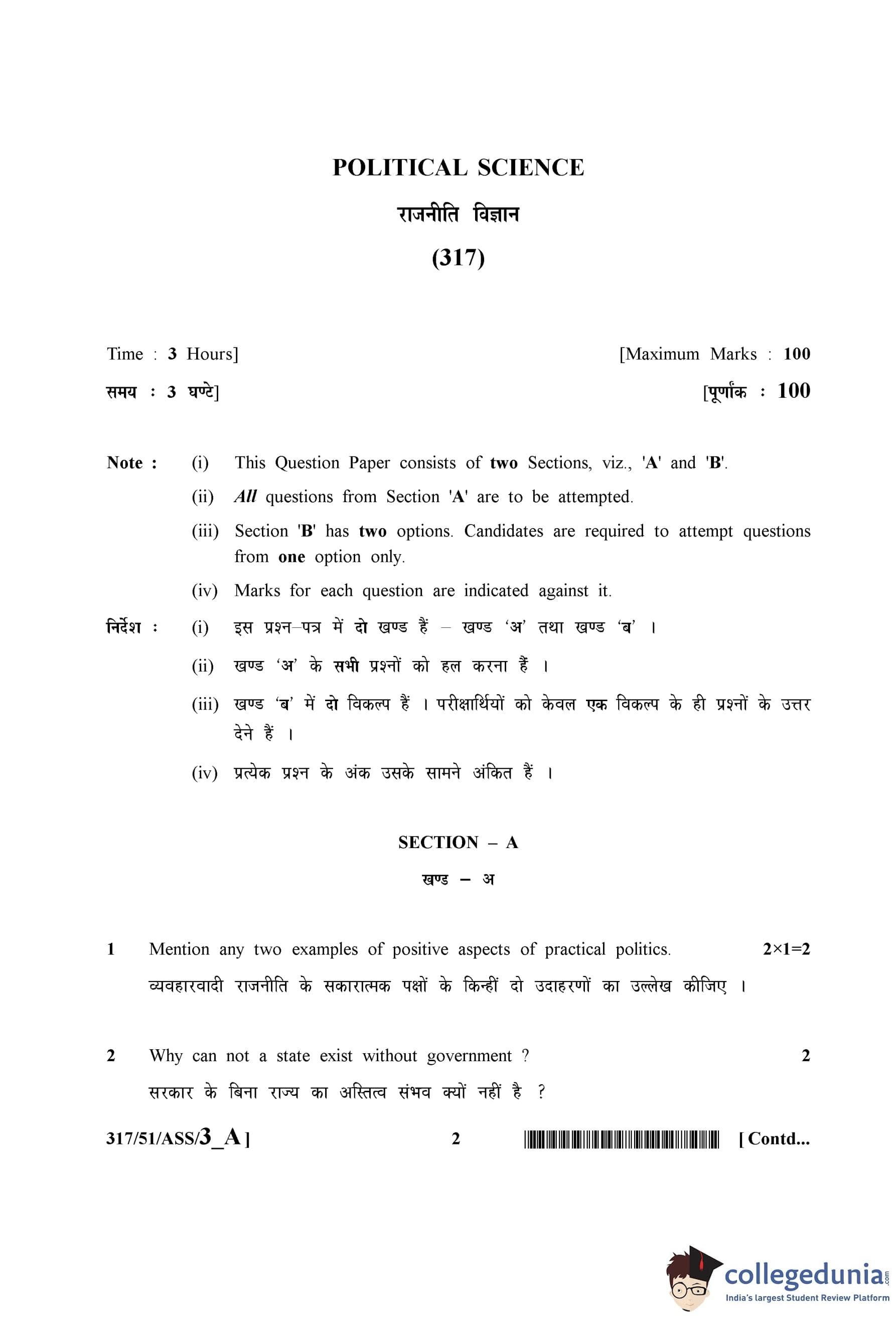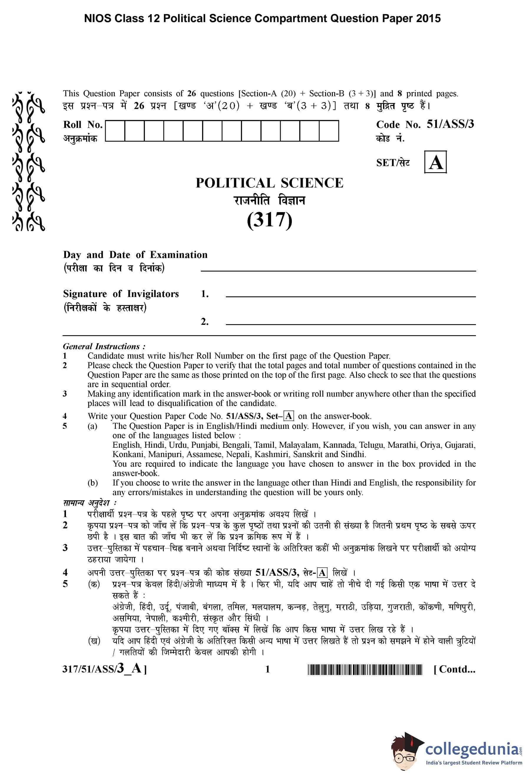 NIOS Class 12 Political Science Compartment Question Paper 2015 with Answer Key