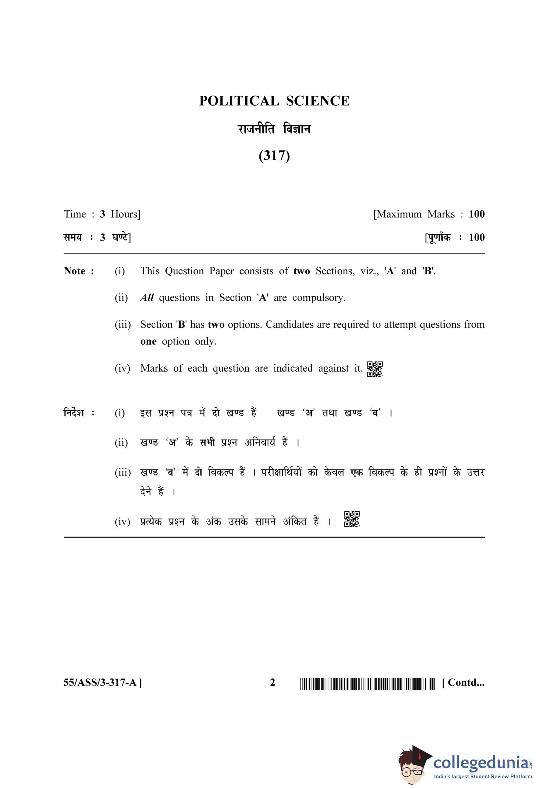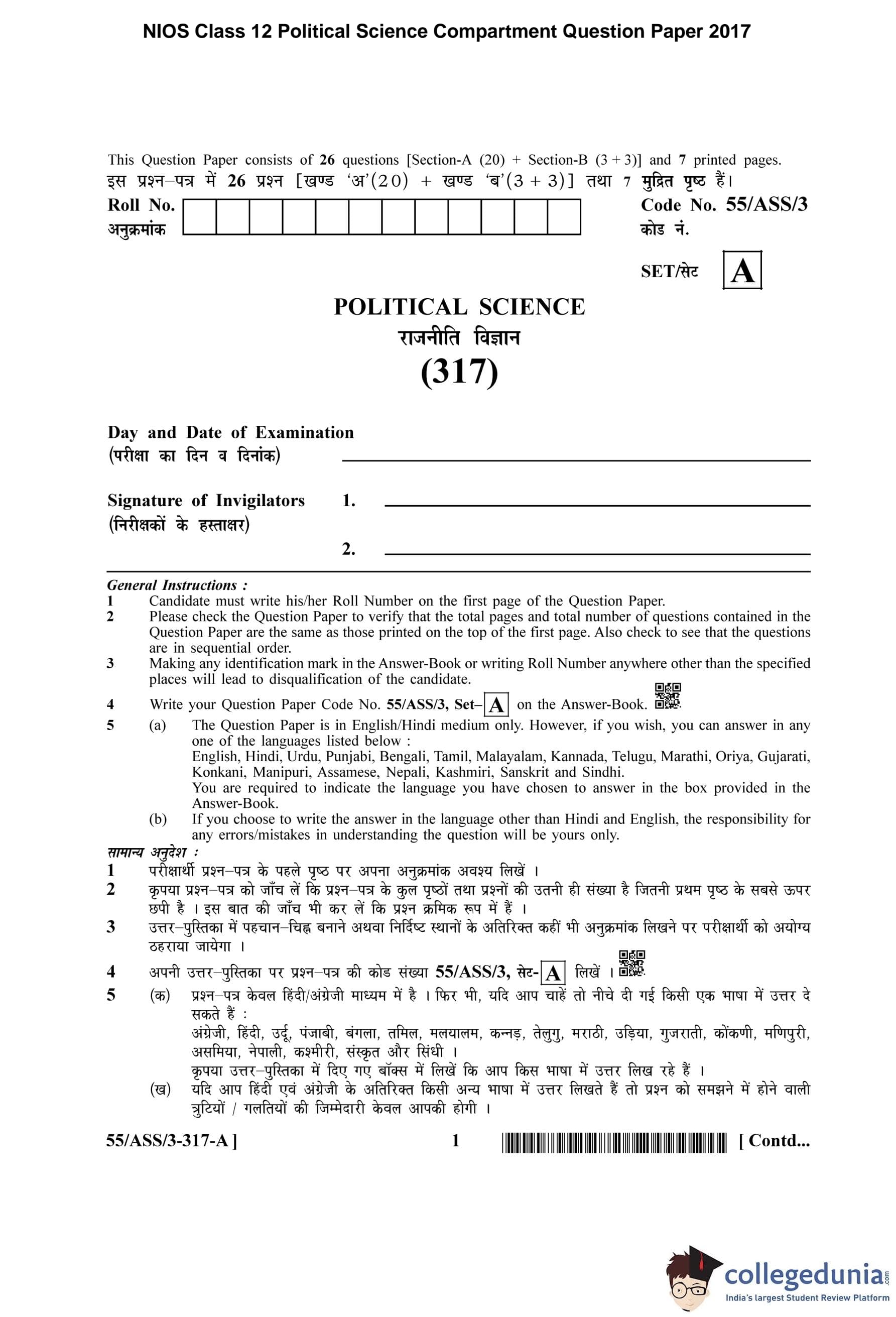 NIOS Class 12 Political Science Compartment Question Paper 2017 with Answer Key pdf is available for download here. The exam was conducted by National Institute of Open Schooling on October 23, 2017 in the Afternoon Session 2:30 PM to 5:30 PM. The question paper comprised a total of 23 questions divided among 2 sections.