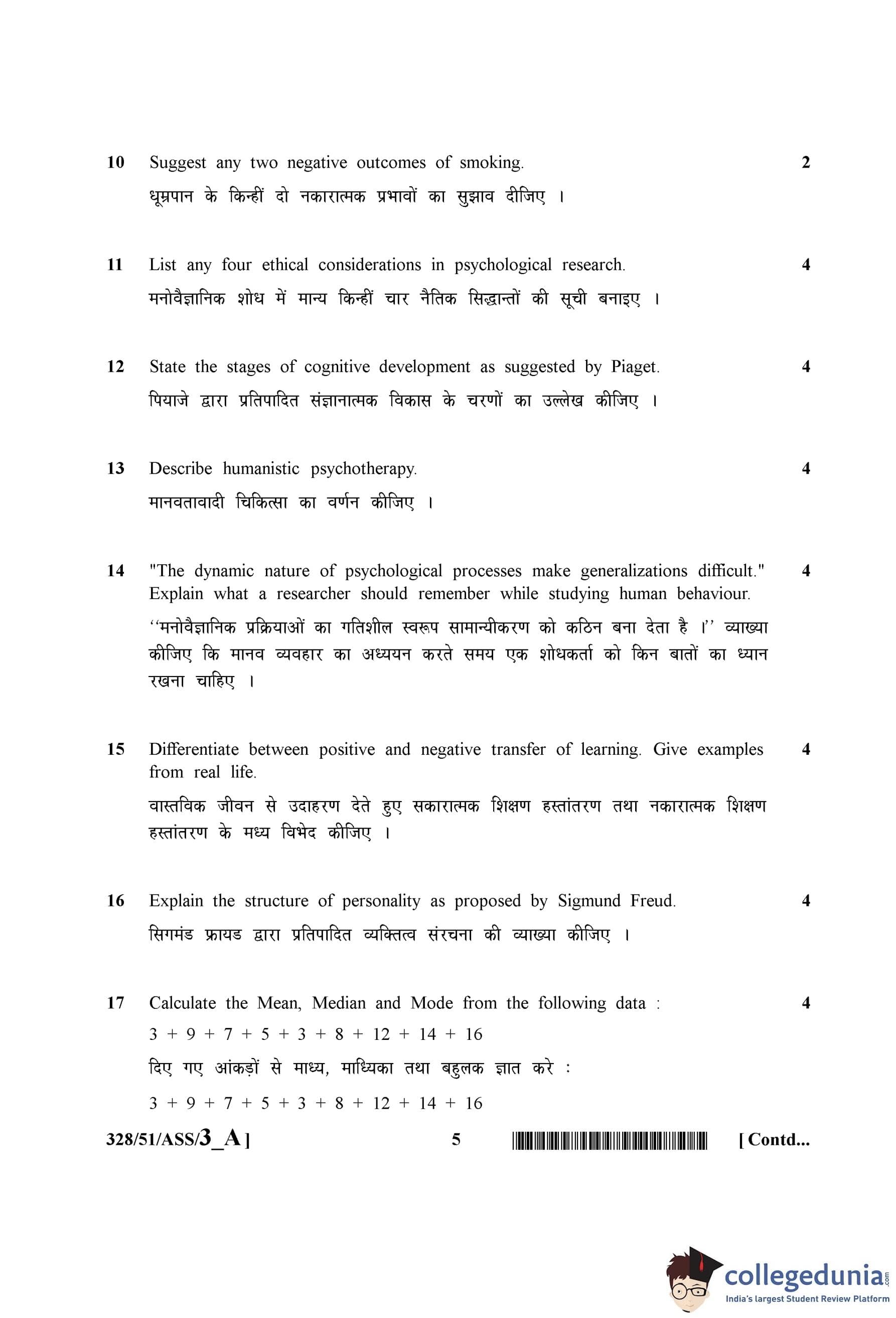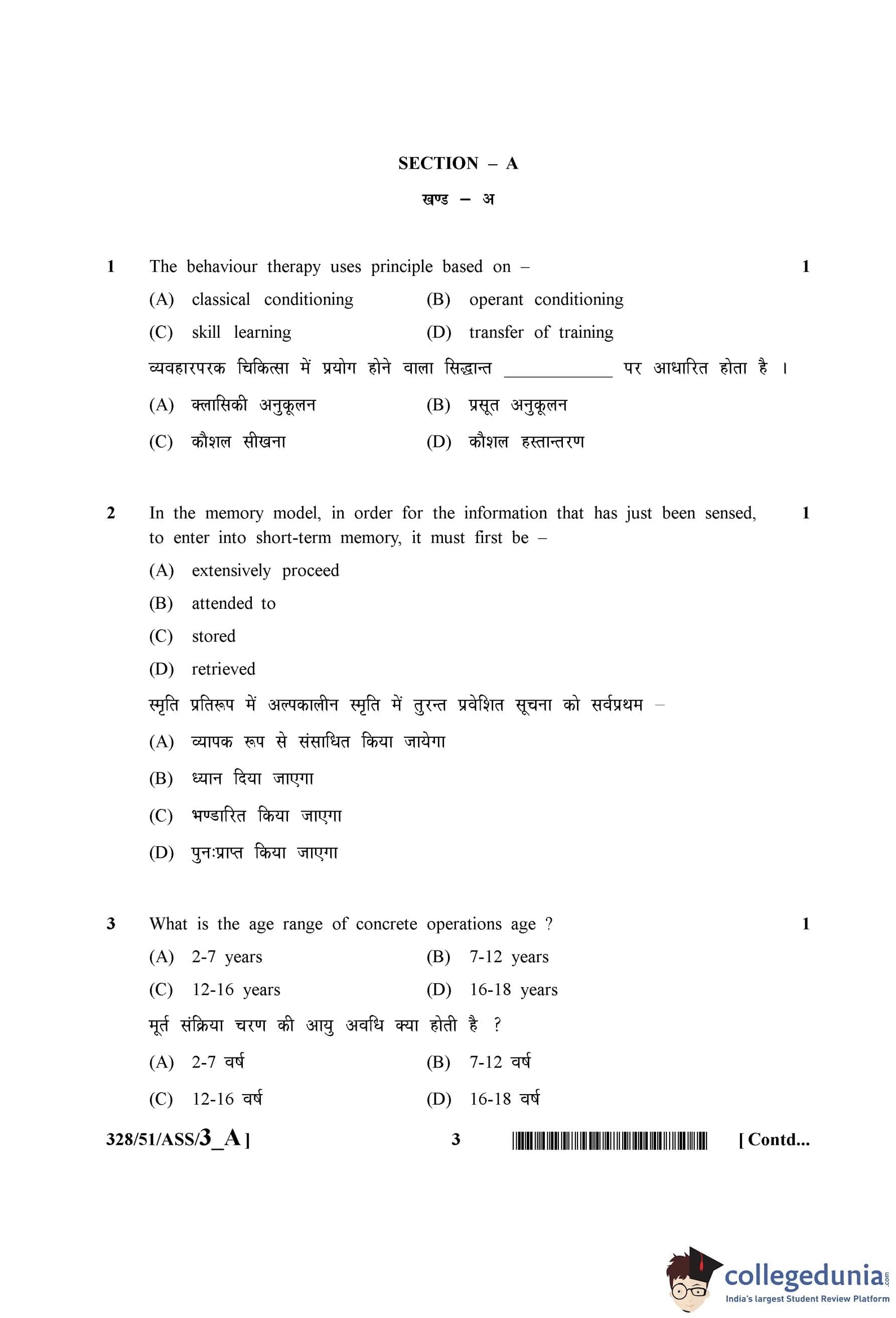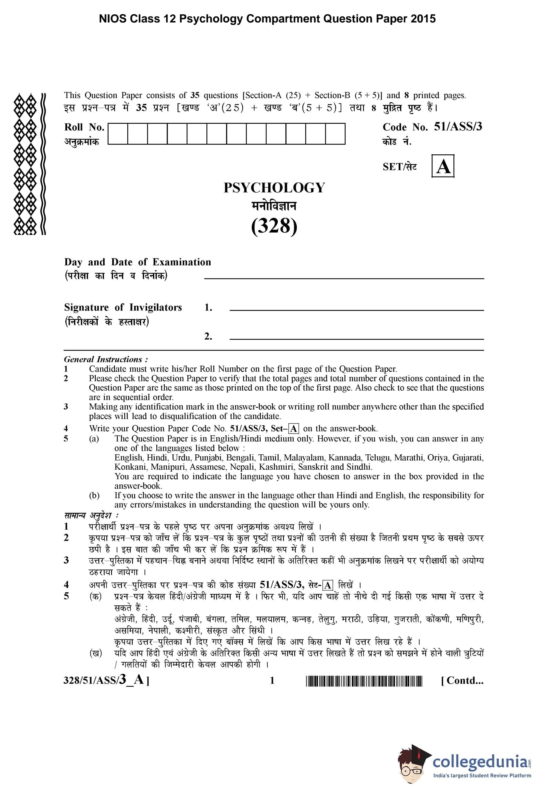 NIOS Class 12 Psychology Compartment Question Paper 2015 with Answer Key pdf is available for download here. The exam was conducted by National Institute of Open Schooling on November 6, 2015 in the Afternoon Session 2:30 PM to 5:30 PM. The question paper comprised a total of 30 questions divided among 2 sections.