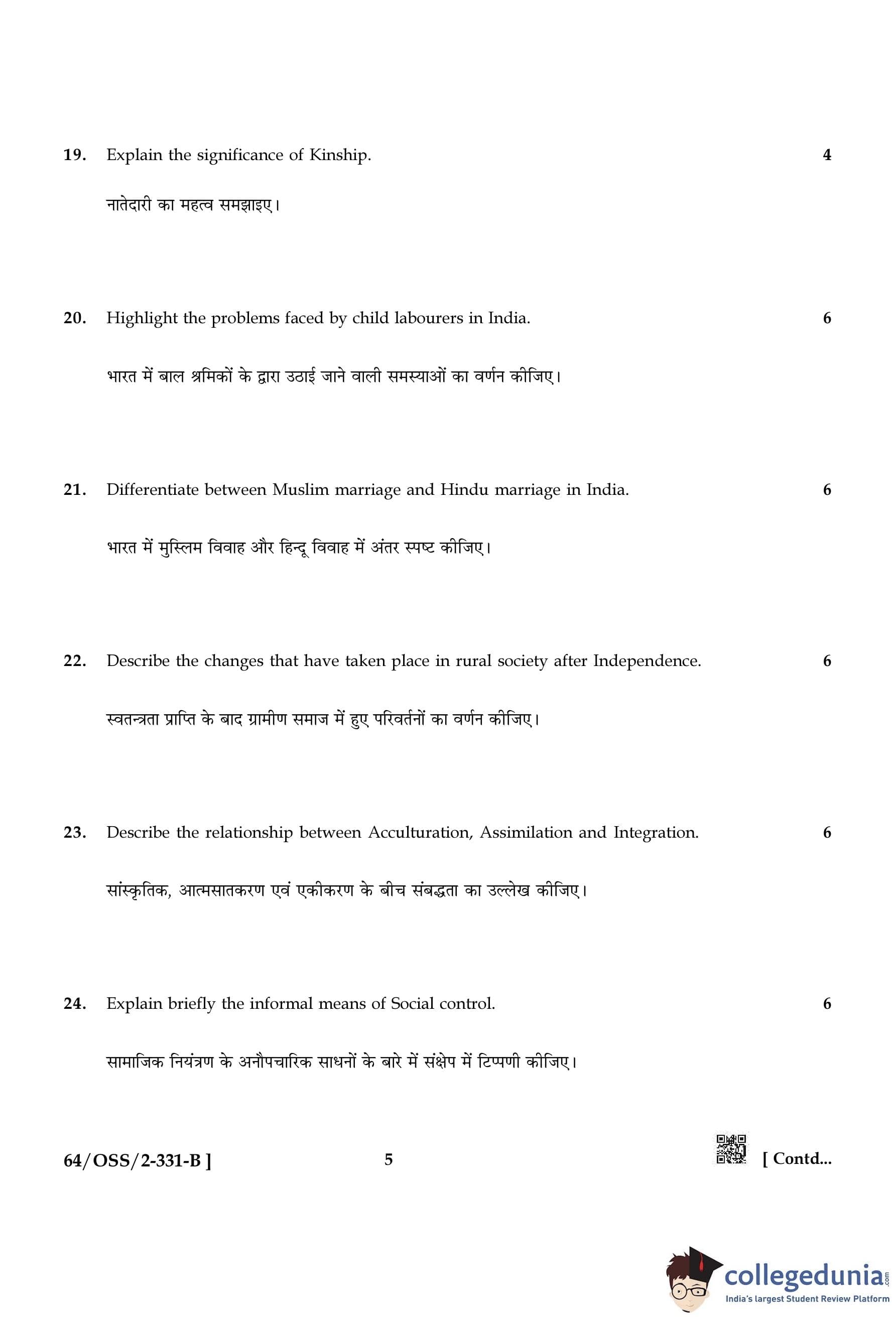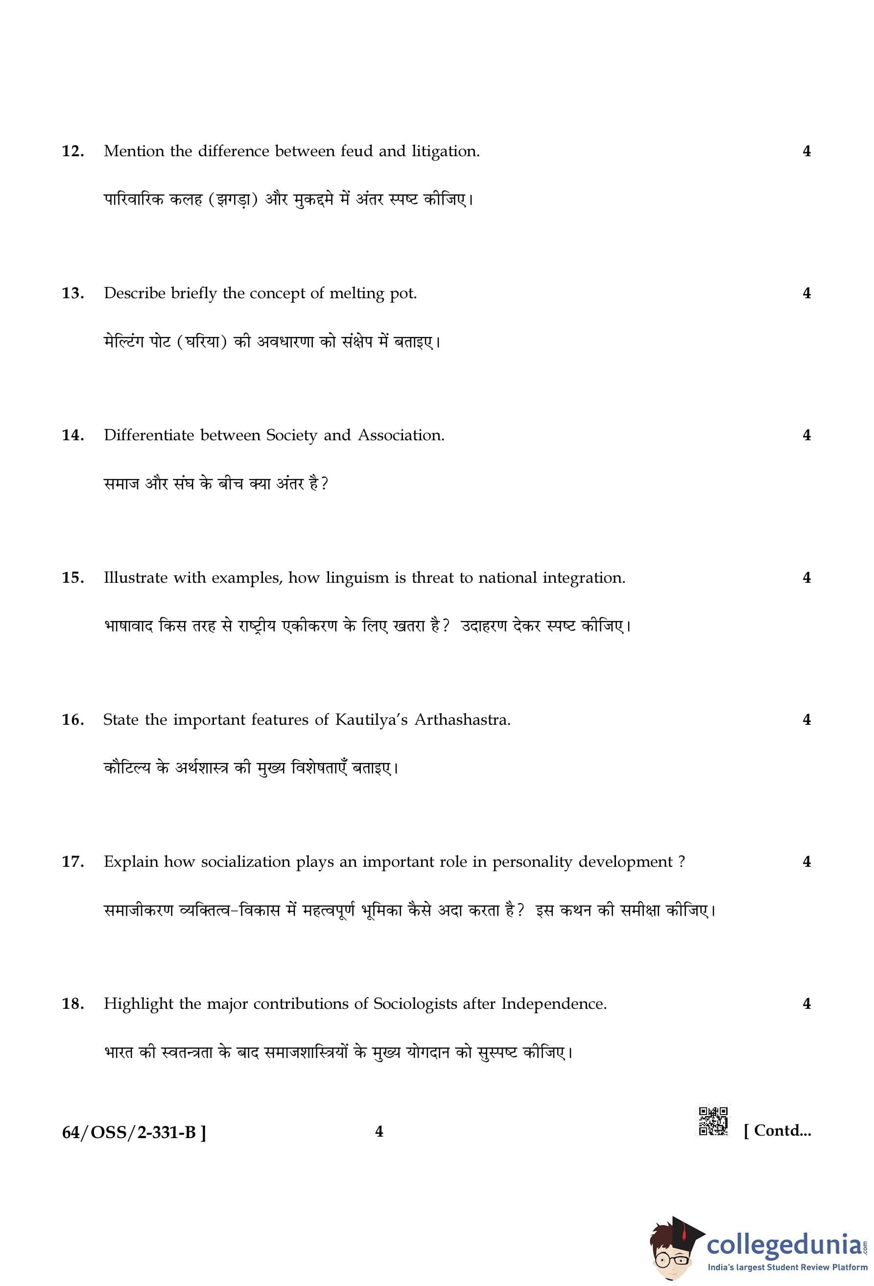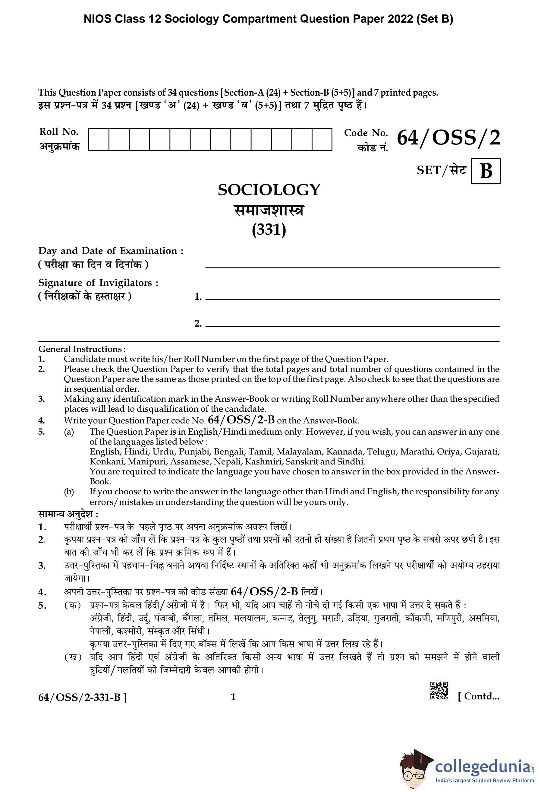 NIOS Class 12 Sociology Compartment Question Paper 2022 with Answer Key pdf (Set B) is available for download here. The exam was conducted by National Institute of Open Schooling on November 19, 2022 in the Afternoon Session 2:30 PM to 5:30 PM. The question paper comprised a total of 29 questions divided among 2 sections.