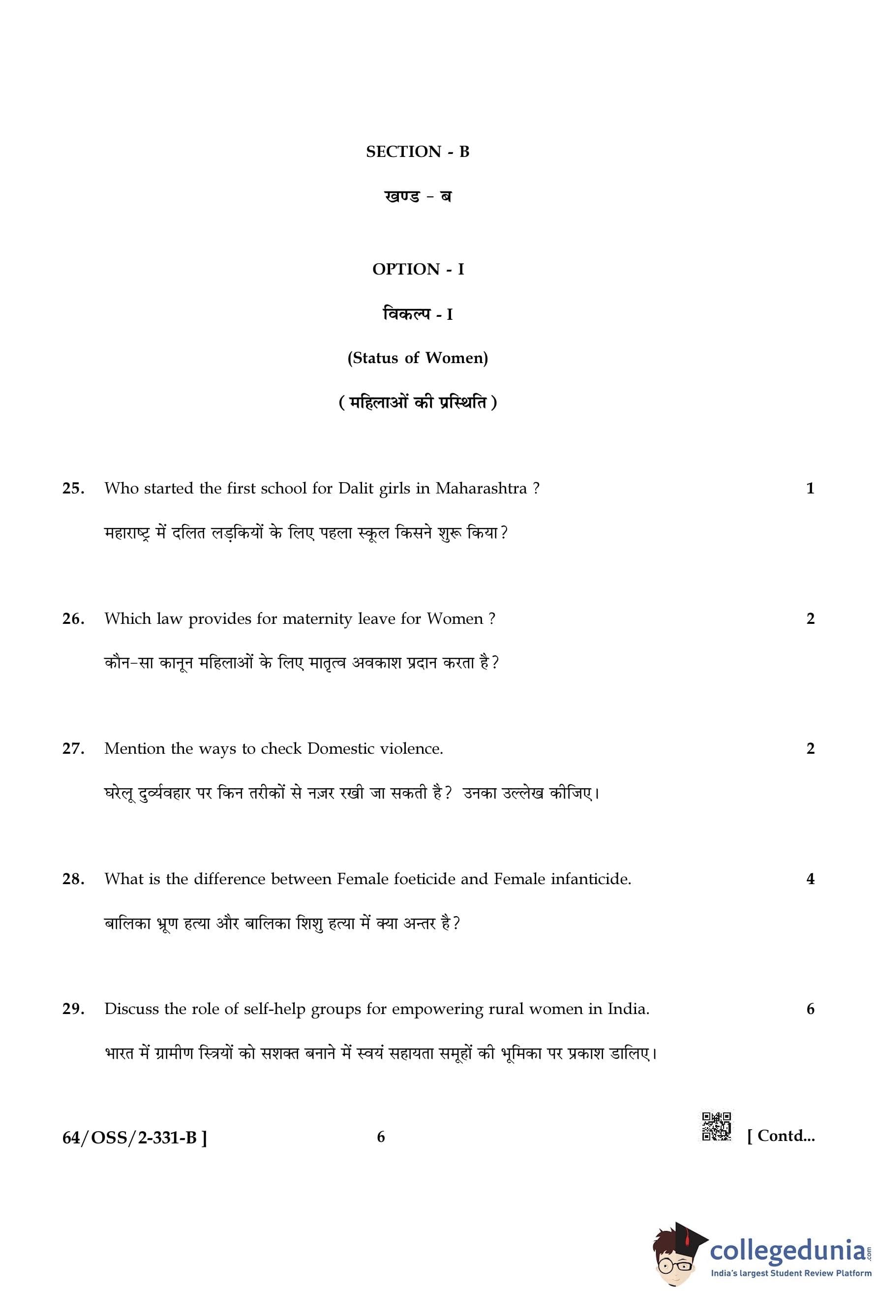 NIOS Class 12 Sociology (Set B) Compartment Question Paper 2022 with Answer Key