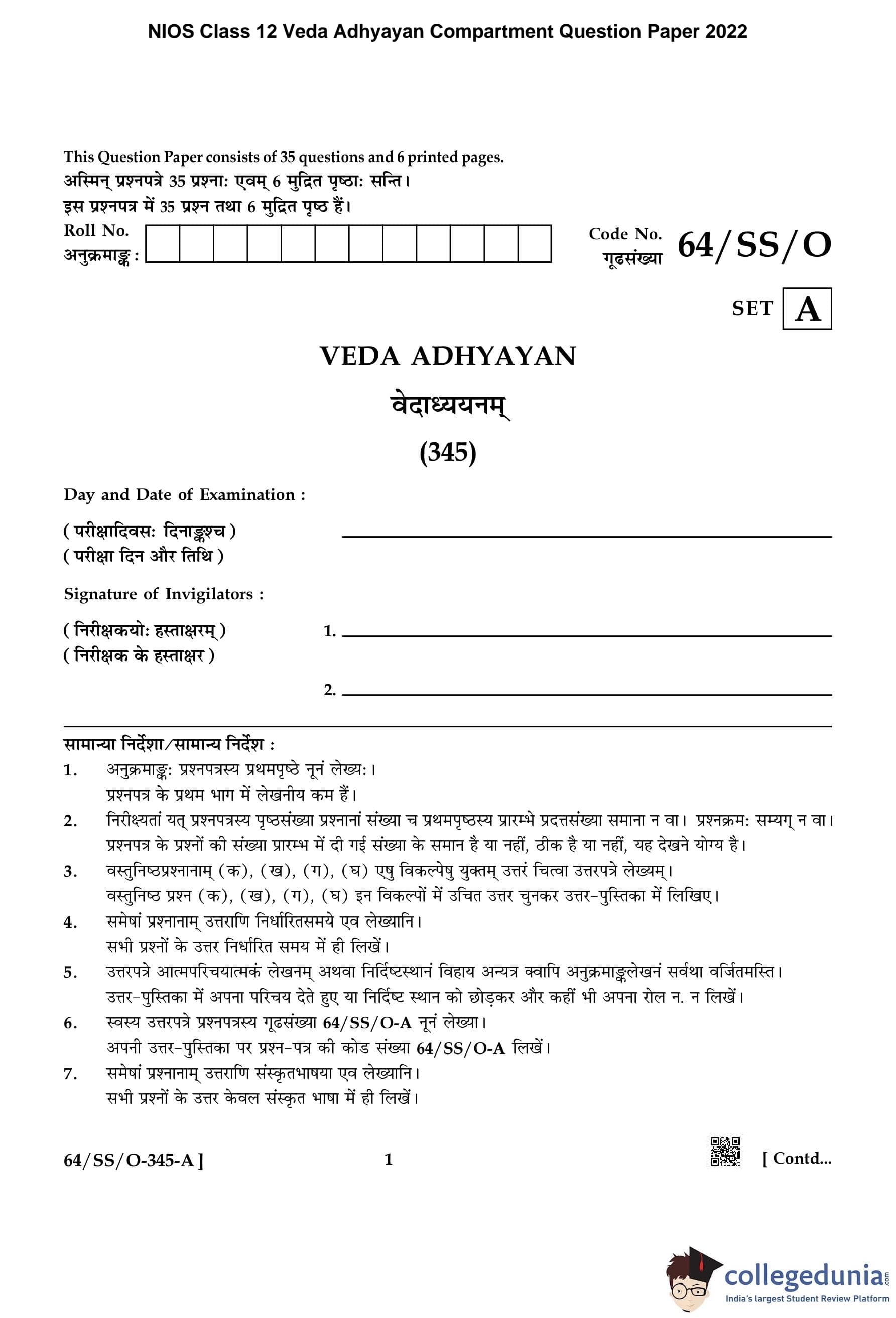 | NIOS Class 12 Veda Adhyayan Question Paper 2022 PDF | NIOS Class 12 Veda Adhyayan Answer Key 2022 PDF |
