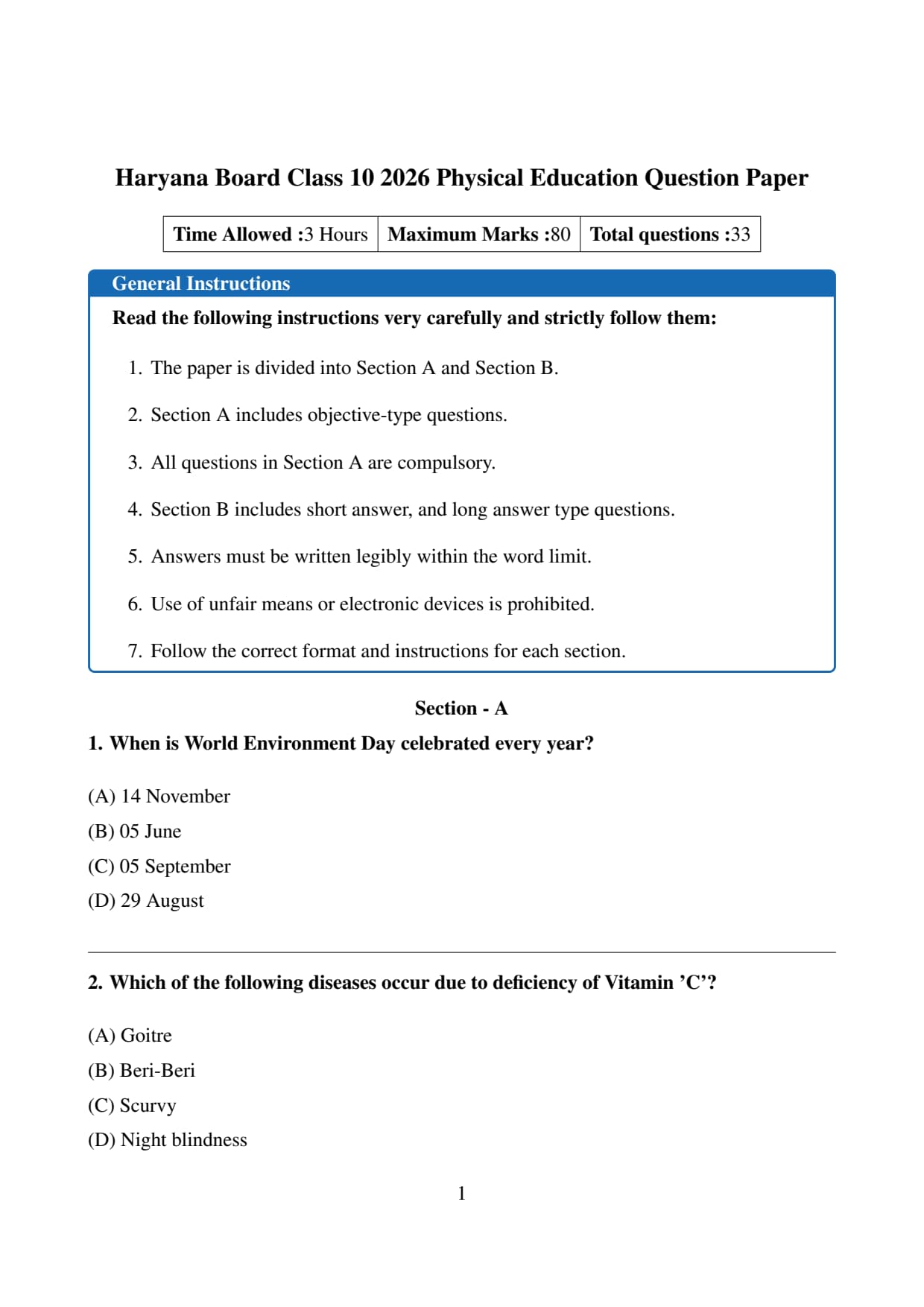 | Haryana Board Class 10 Physical Education (NSQF) Question Paper 2026 | Download PDF | Check Solution |