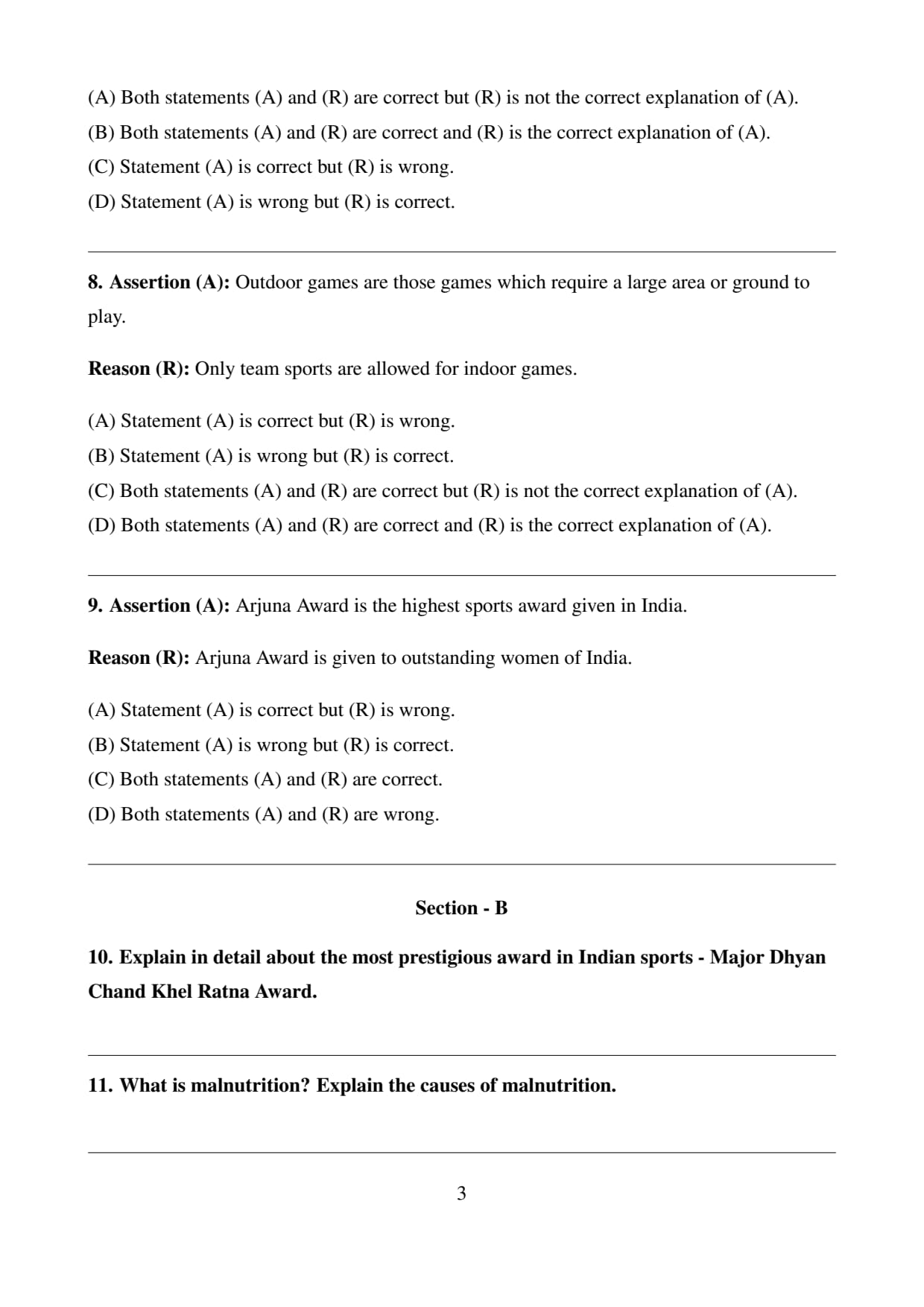 Assertion (A): Outdoor games are those games which require a large area or ground to play.