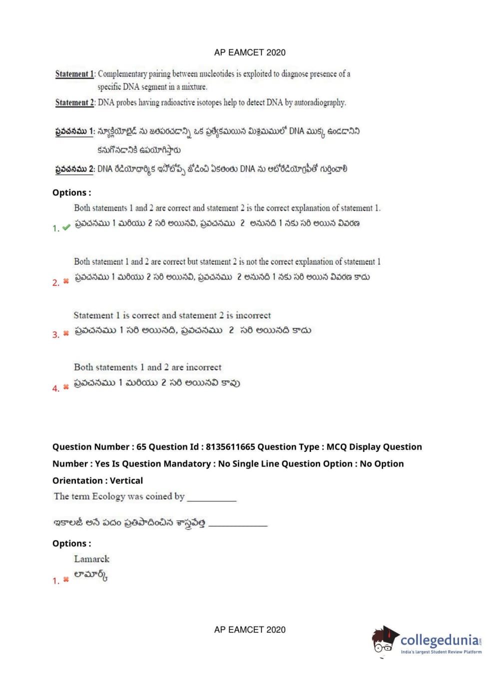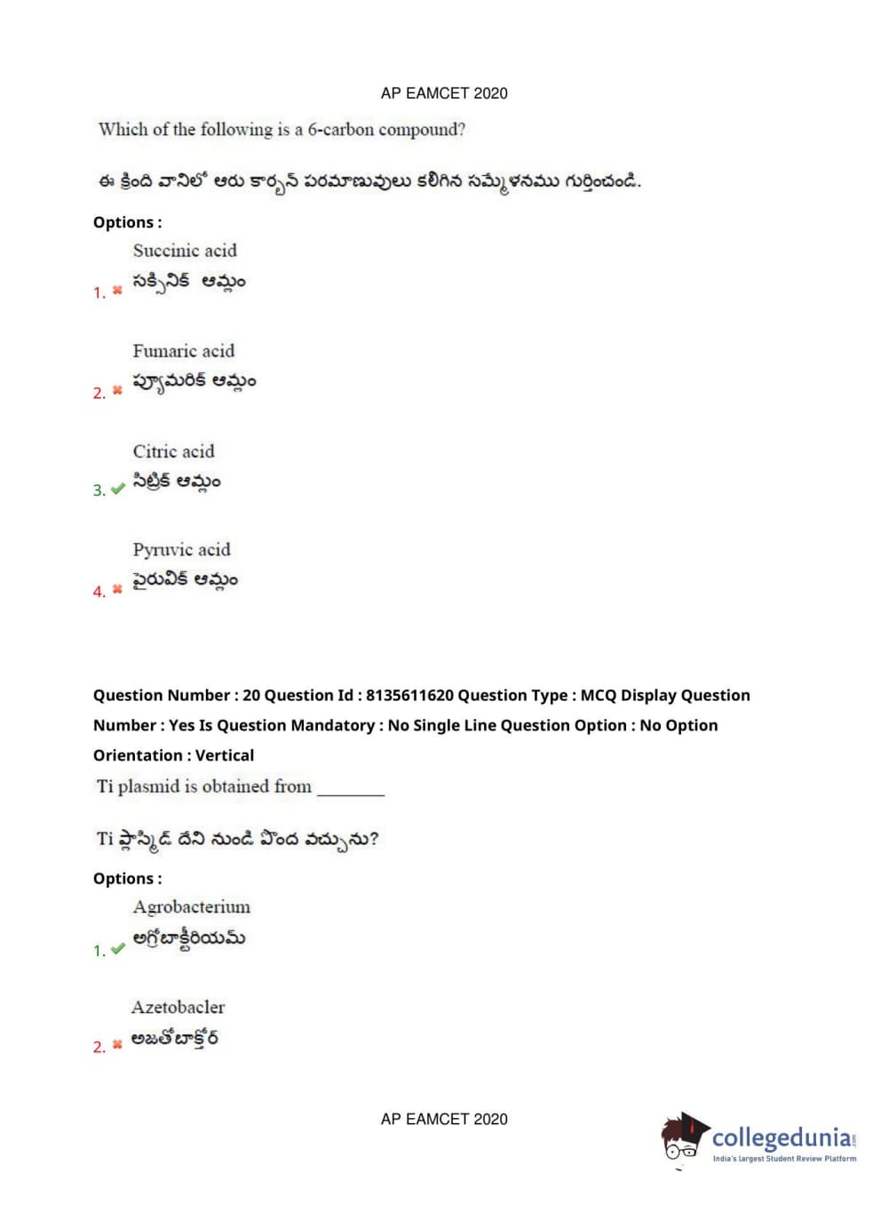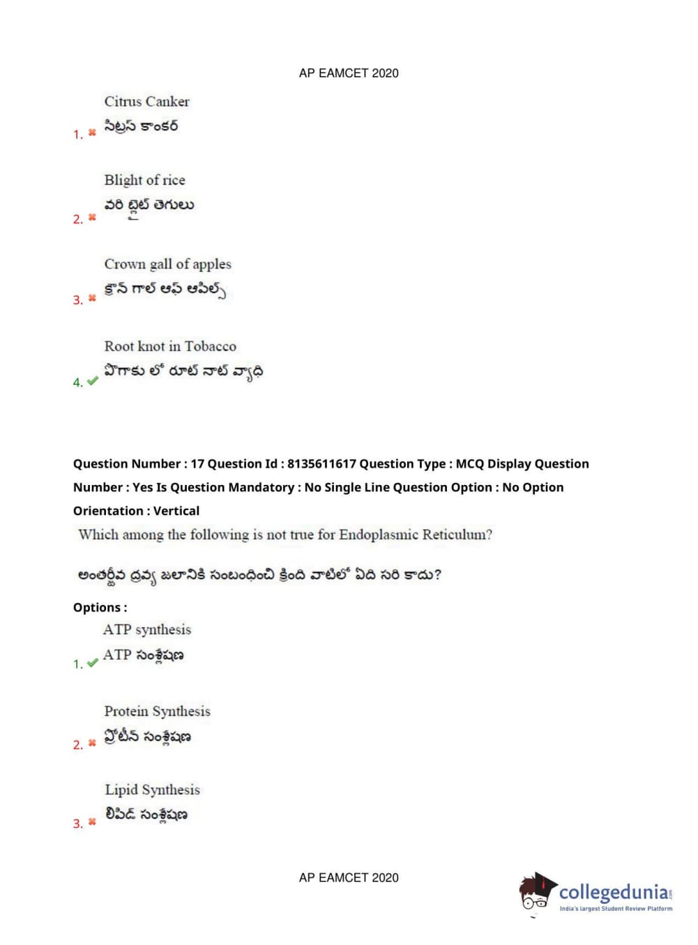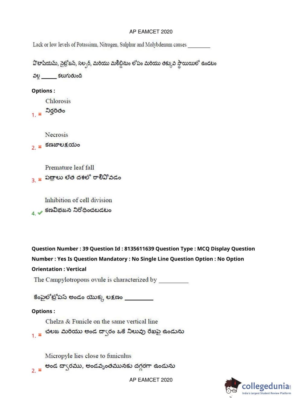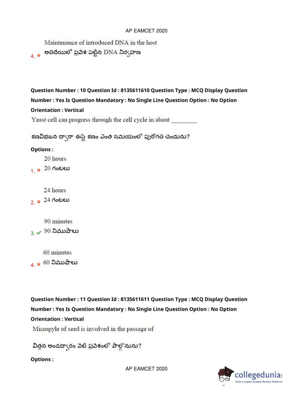 AP EAPCET 2020 Agriculture and Medical Question Paper with Answer Key PDFs Forenoon Session