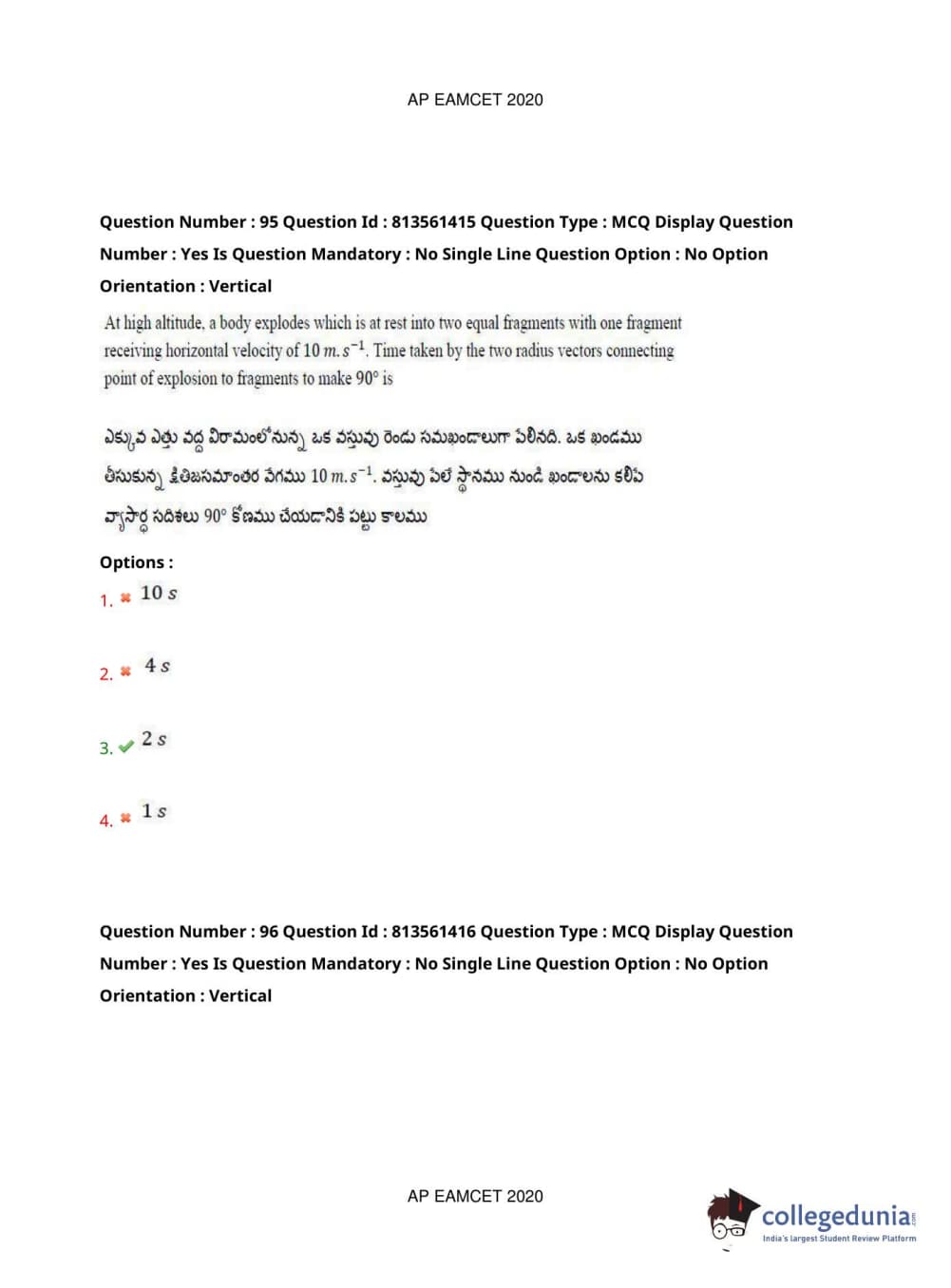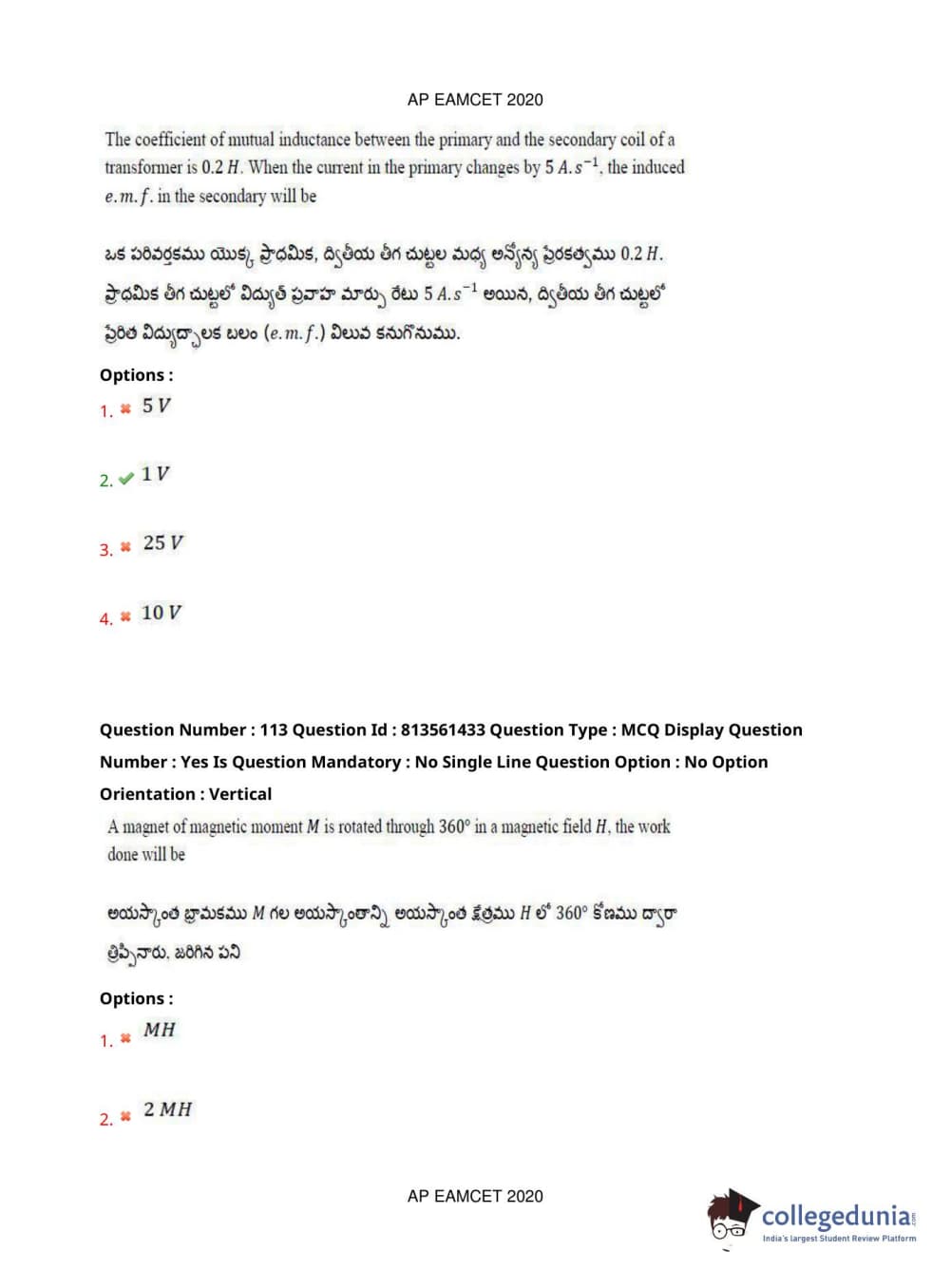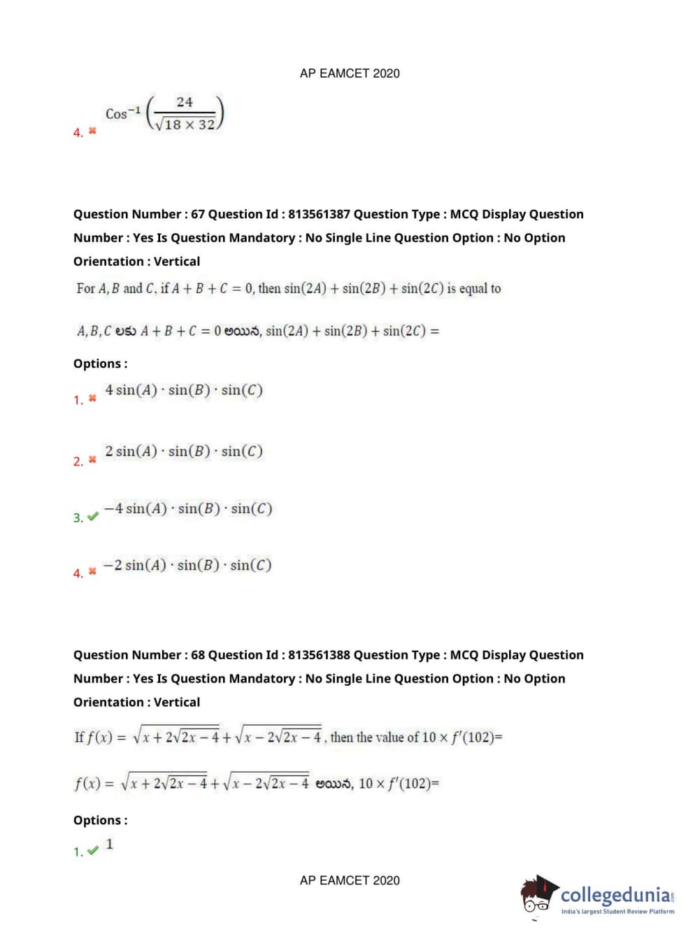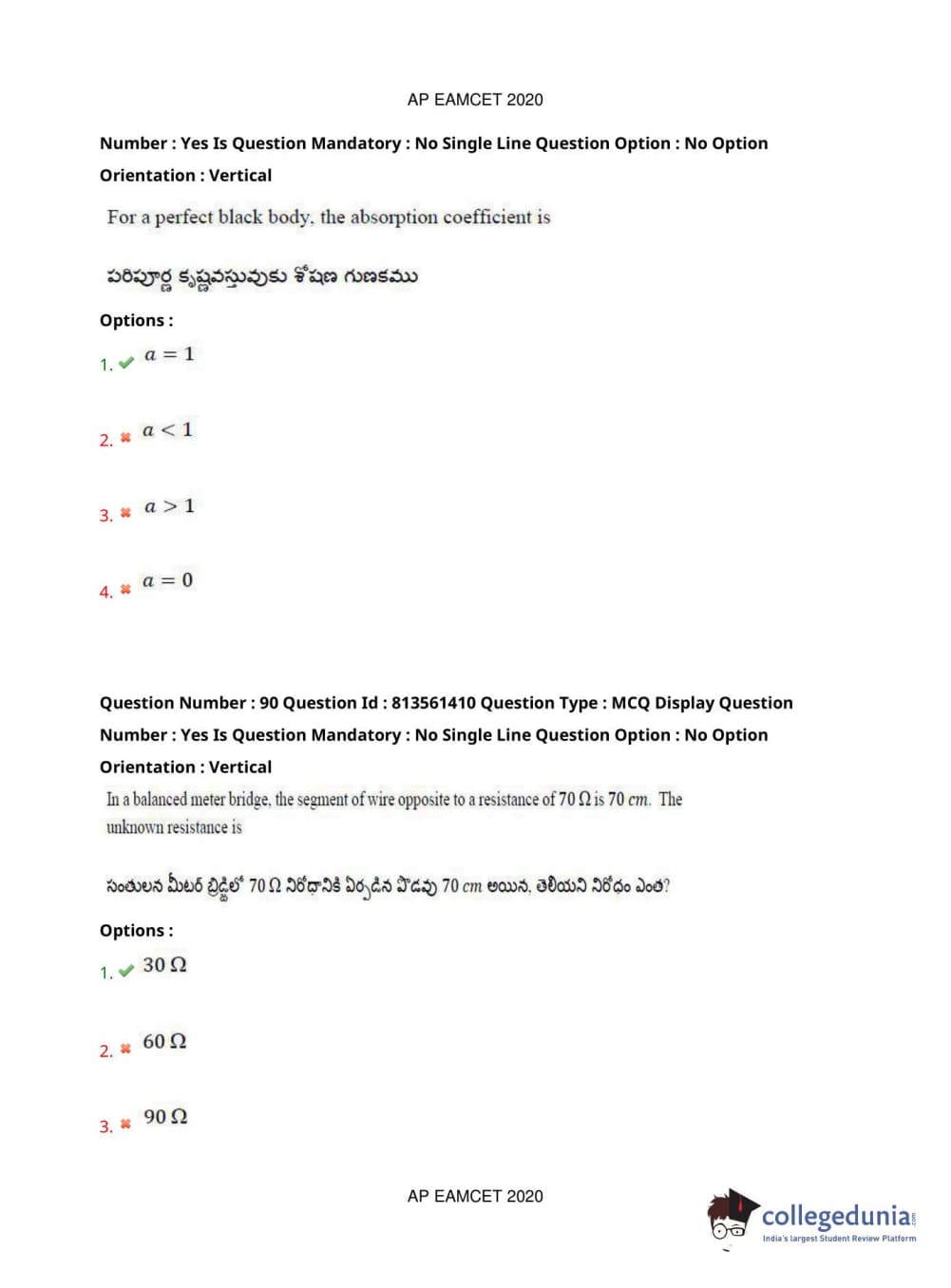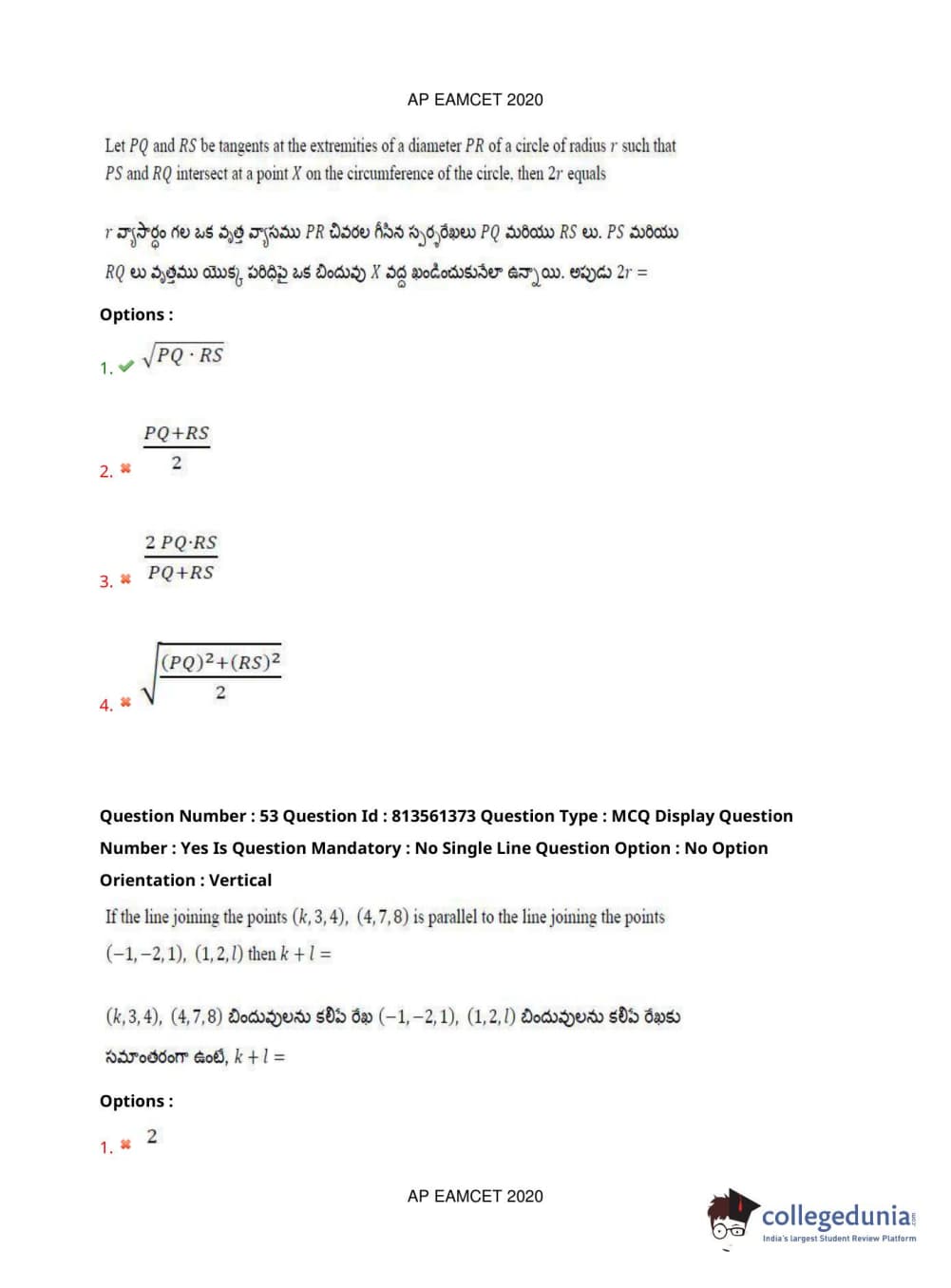 AP EAPCET 2020 Engineering Question Paper with Answer Key PDFs