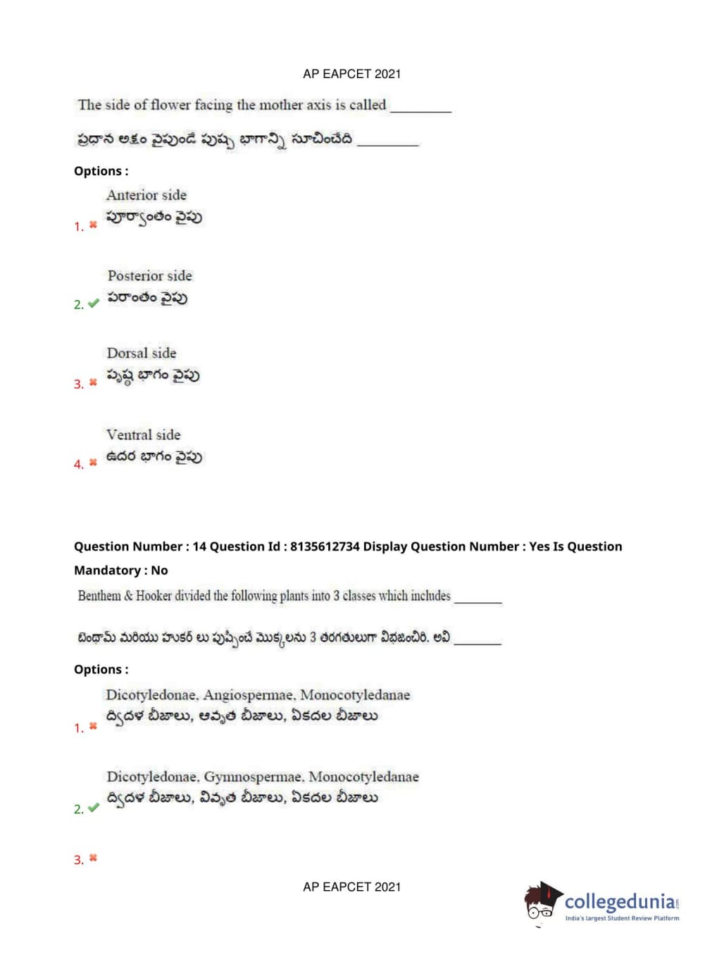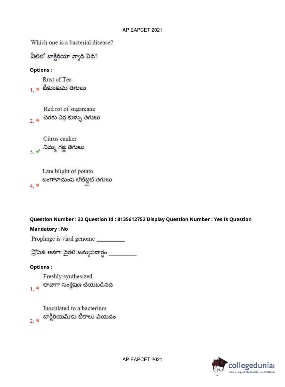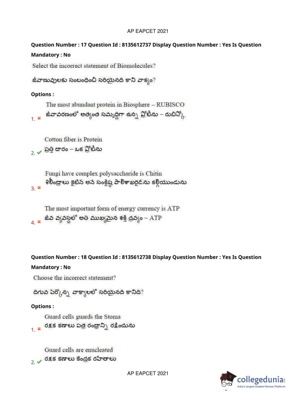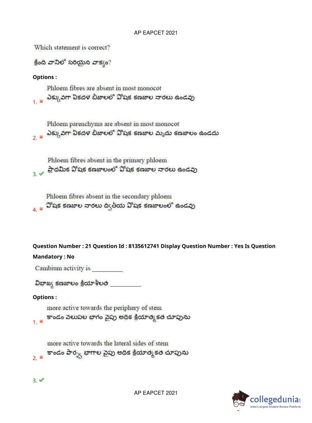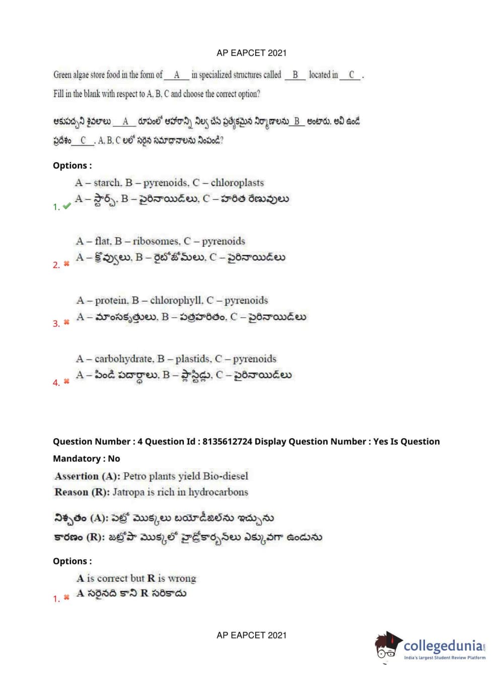 AP EAPCET 2021 Agriculture and Pharmacy Question Paper with Answer Key PDFs Afternoon Session
