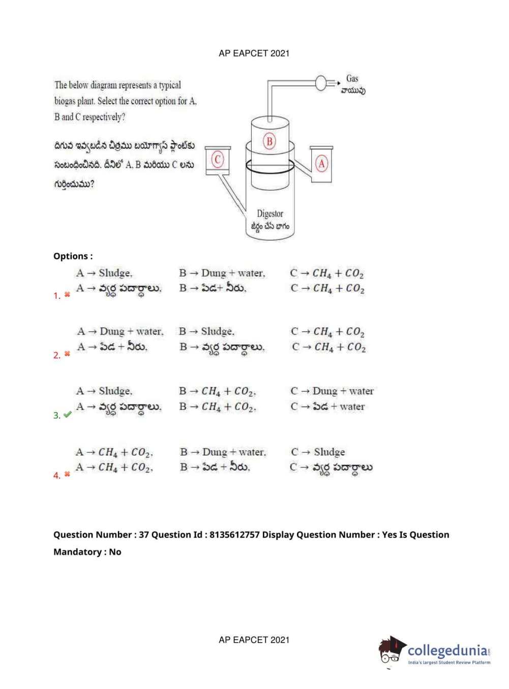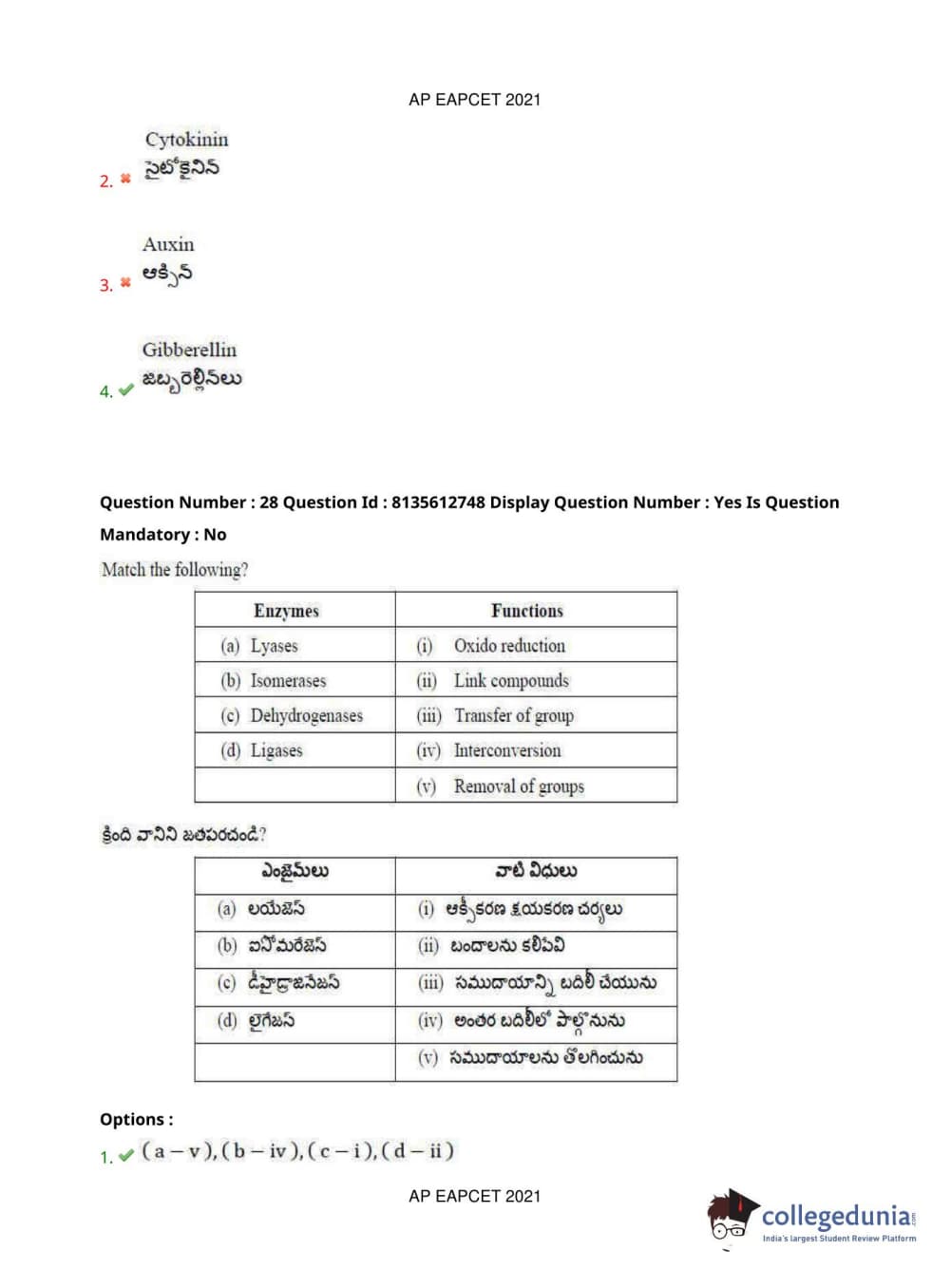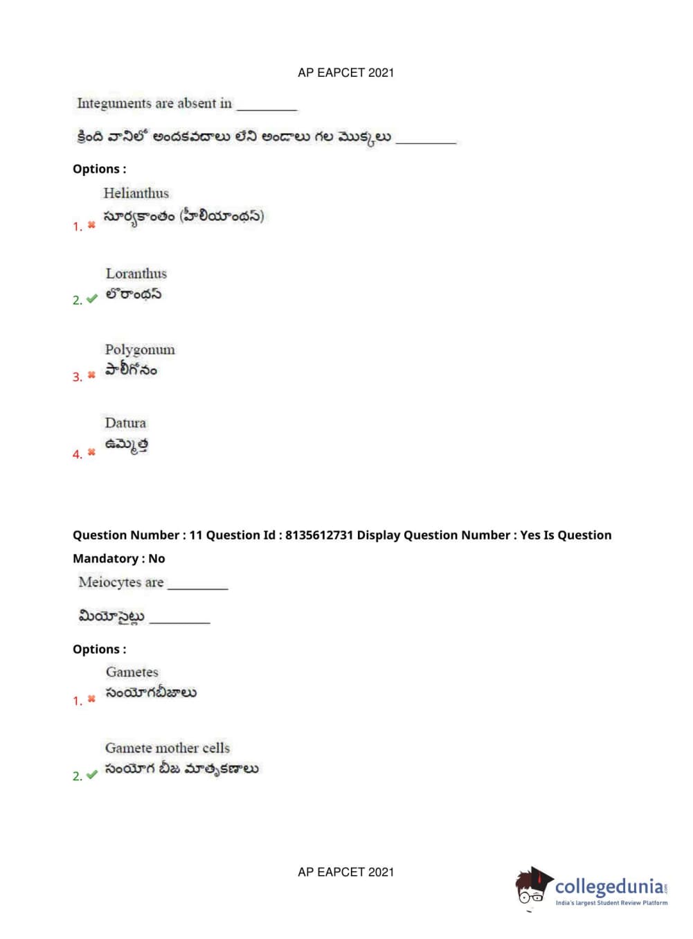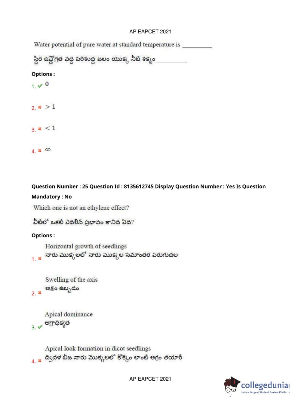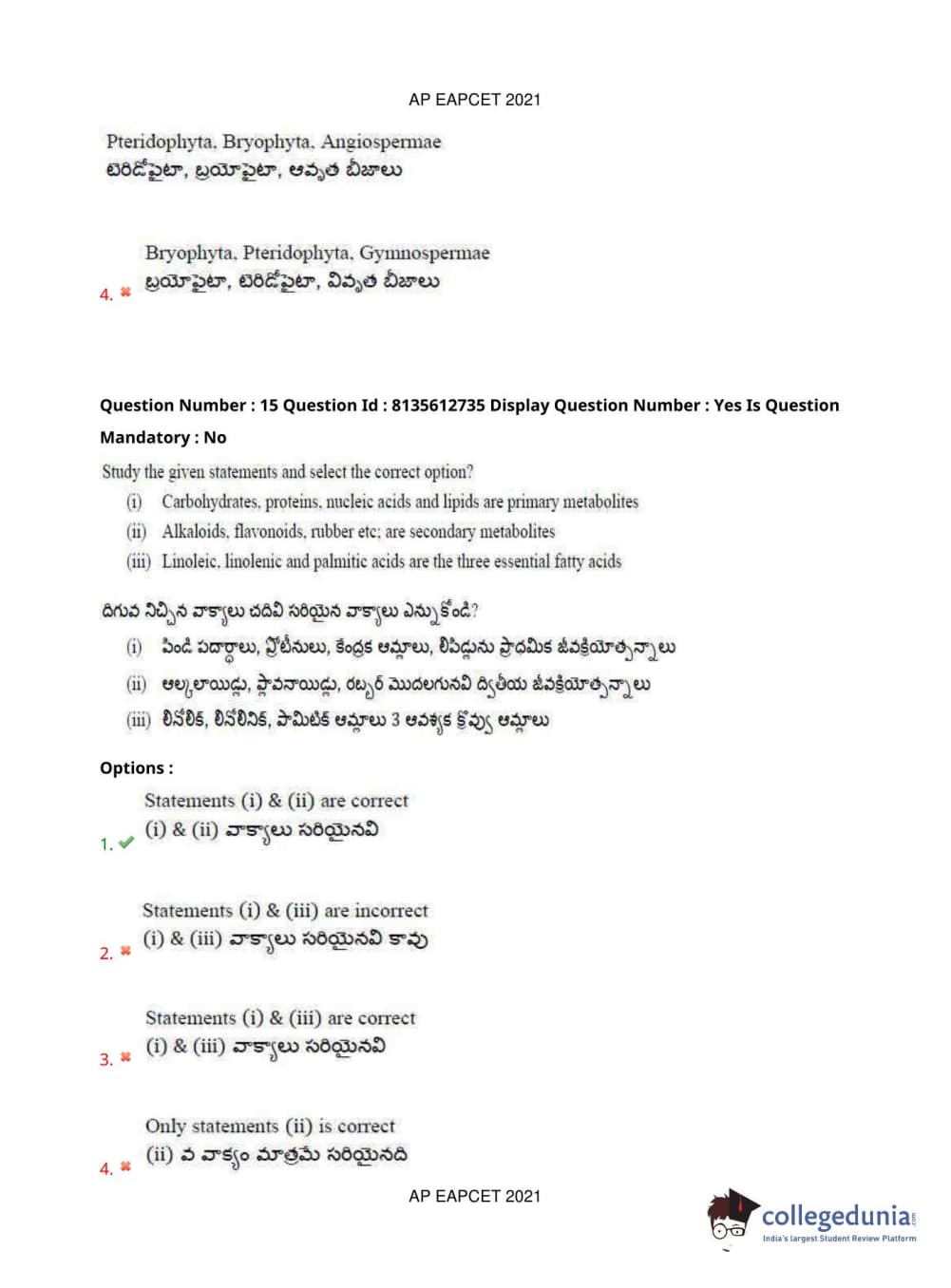 AP EAPCET 2021 Agriculture and Pharmacy Question Paper with Answer Key PDFs Afternoon Session