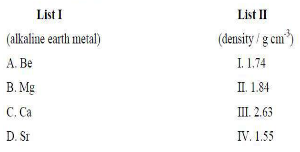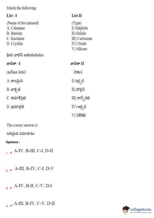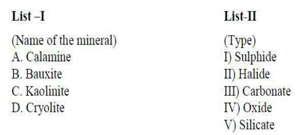 Thus, the correct answer is option (1): A-I, B-III, C-I, D-II. Quick Tip: Matching minerals with their respective types helps in identifying their chemical composition and properties.