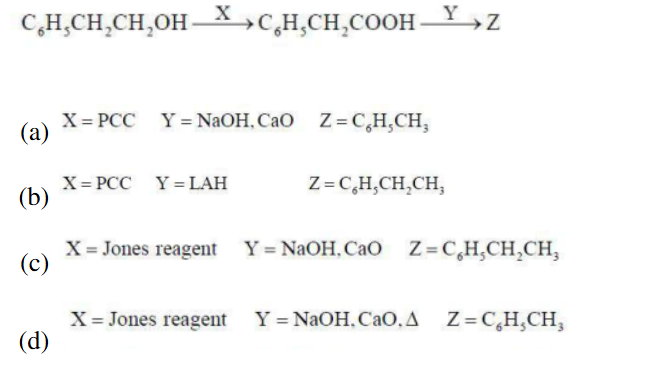 Quick Tip: For alcohols, Jones reagent (CrO\(_3\)) is commonly used to oxidize primary alcohols to carboxylic acids. The decarboxylation step requires NaOH and CaO to remove the carboxyl group.