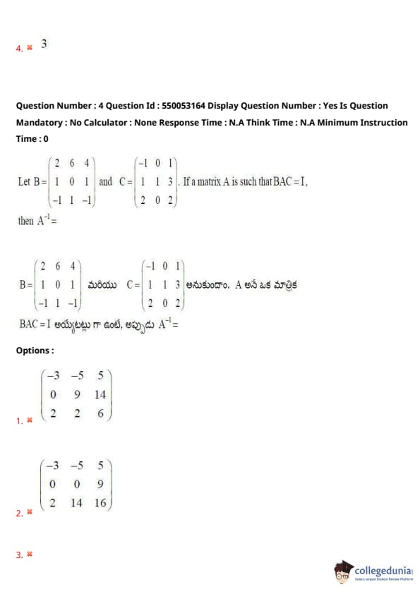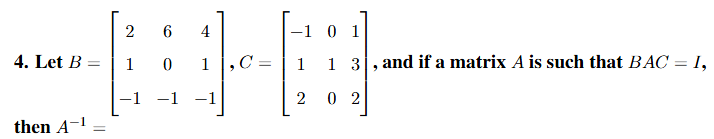 Thus, the correct answer is option (4). Quick Tip: When \( BAC = I \), use \( A^{-1} = CB \) for the solution.
